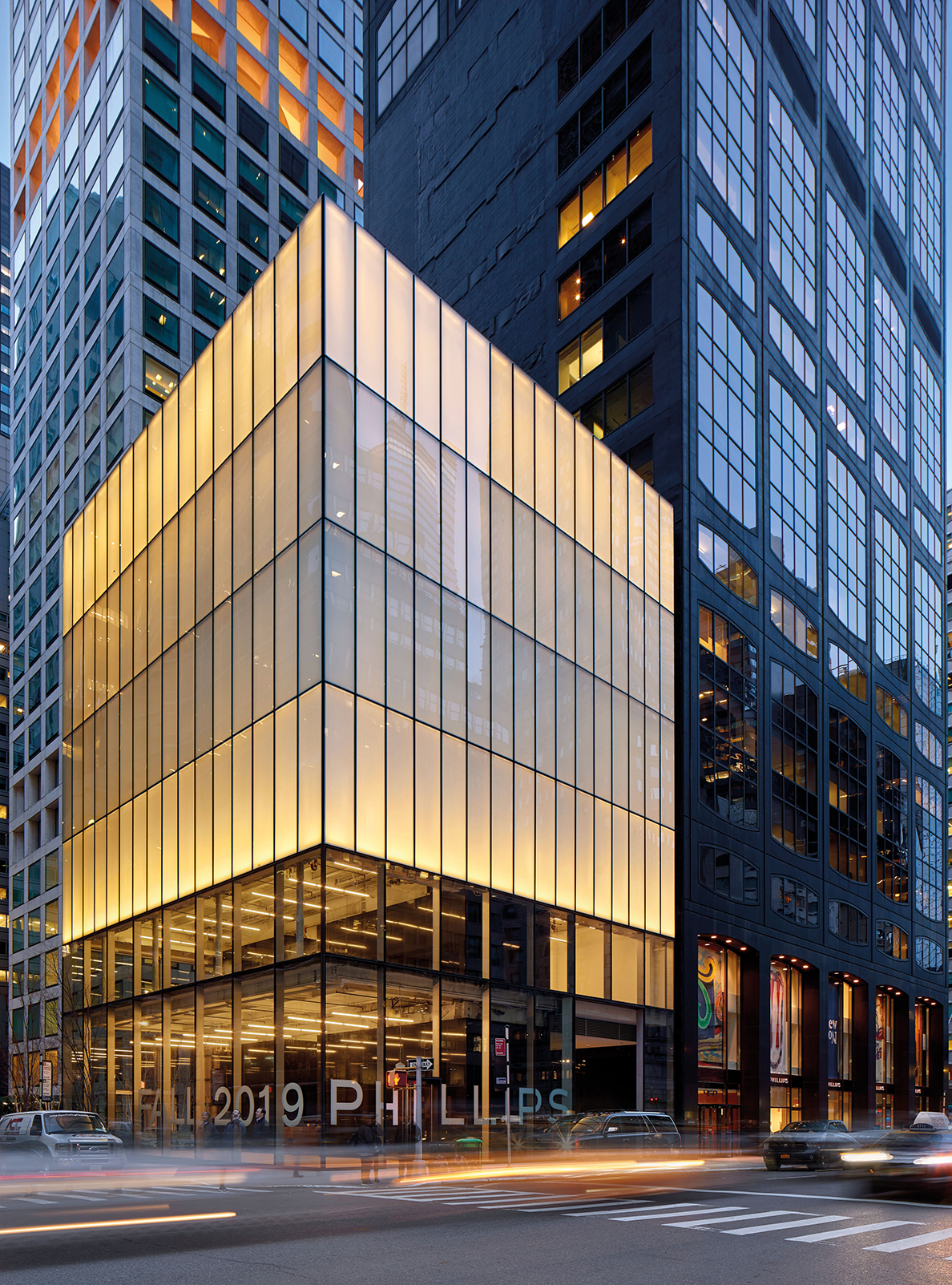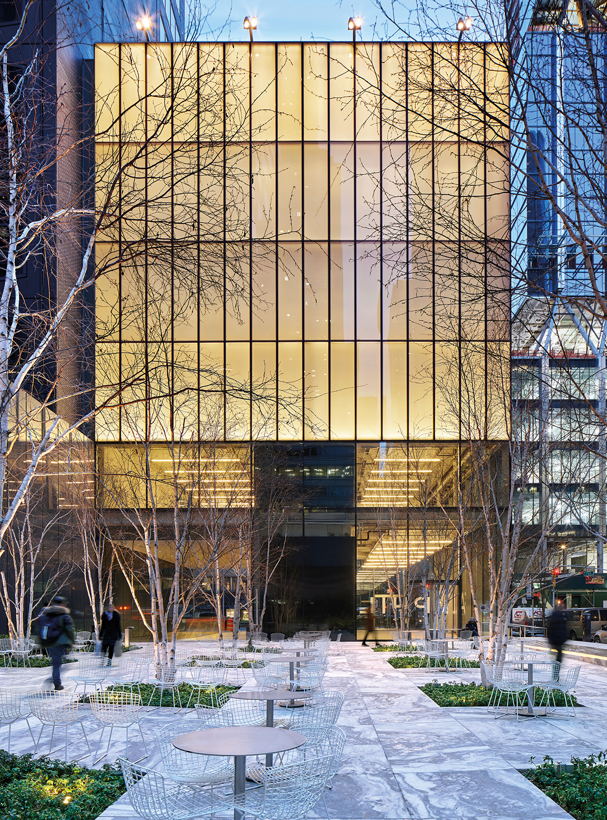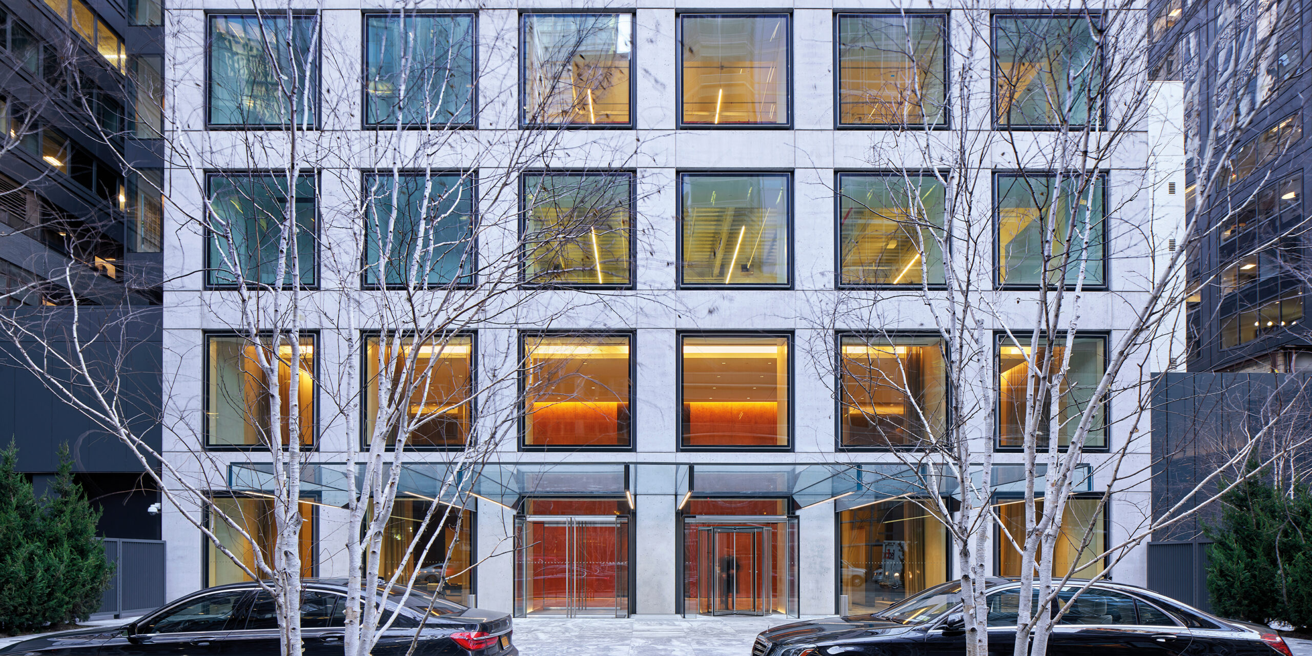 En la calle 57, un cubo comercial —autónomo, pero obediente a la geometría de la torre— prolonga el linaje exclusivo de Madison y la 57 hacia el corredor elegante de Park Avenue. Otro cubo, suspendido sobre un volumen completamente vidriado, restituye la continuidad del muro urbano, marcando el acceso a un subsuelo que se enlaza silenciosamente con la calle 57.