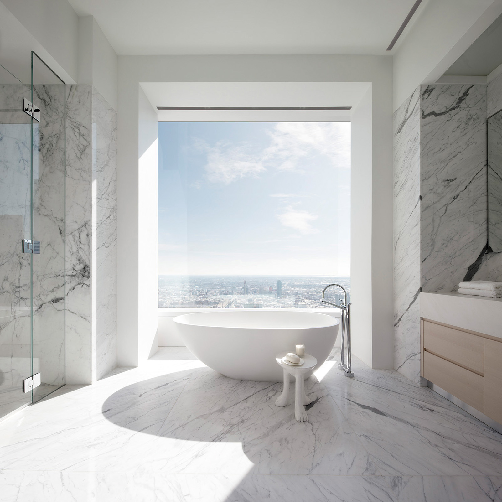 El volumen más bajo es un santuario privado destinado enteramente a los placeres domésticos: áreas para huéspedes y servicio, un club de salud que parece extraído de otro mundo, espacios deportivos interiores, piscina, depósitos, salas de conferencia y proyección, y un restaurante que se abre, generoso, a una terraza ajardinada que mira la calle 57 como si esta fuese una postal diseñada para ser contemplada eternamente. A nivel del suelo, la torre no cae sobre la ciudad: se posa. Lo hace creando un pequeño oasis público que prolonga la respiración de Park Avenue hacia la calle 56, un gesto de hospitalidad urbana poco común en el lenguaje hermético de los rascacielos. Un acceso semicerrado, casi teatral, anuncia la entrada a un lobby residencial discreto, alejado del estruendo neoyorquino. Los accesos de servicio, disciplinados y ordenados, se refugian en la cara este, como si el edificio supiera que hasta la logística tiene su dignidad.