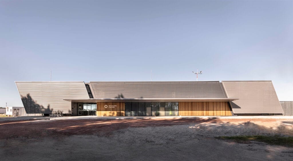 El plan de modernización de terminales aéreas del interior del país es una ambiciosa iniciativa de Aeropuertos Uruguay, diseñada para impulsar la conectividad aérea y fortalecer el desarrollo económico, turístico y logístico entre los departamentos. En colaboración con el rebranding y la actualización de la institución, Gómez Platero Arquitectura & Urbanismo fue encargado de concebir seis proyectos para las terminales en los departamentos de Colonia, Paysandú, Durazno, Salto, Rivera y Cerro Largo. Cada uno de estos proyectos presenta particularidades únicas, pero todos comparten una visión: dotar a los edificios de una identidad común que unifique y haga reconocible la operación en su totalidad. La resolución arquitectónica y elementos gráficos distintivos son herramientas clave para lograr una imagen disruptiva, dinámica y contemporánea. El aeropuerto de Carmelo, junto con los de Paysandú y Durazno, forma parte de la serie de edificios más pequeños con una superficie de 600m² aprox.
