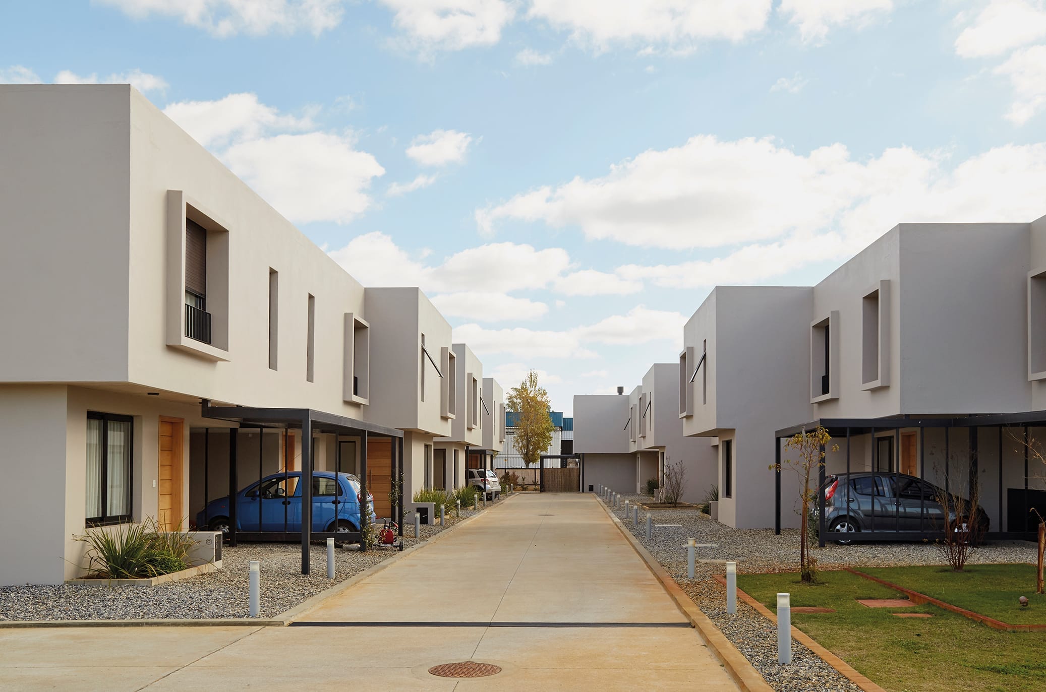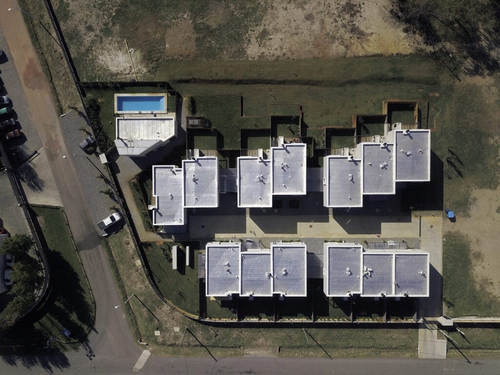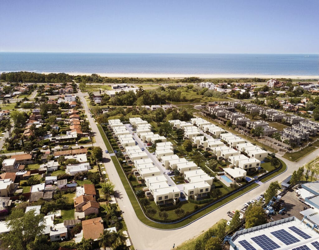Este proyecto, que se desarrolla sobre dos padrones, propone una escala importante que impone un punto de inflexión en el desarrollo del estudio. La urbanización fue concebida a partir de cinco tipologías distintas que generan distintos tipos de núcleos que integran tres unidades cada uno. Las ubicaciones concebidas logran que la implantación capture la mejor iluminación natural, la consecuente ventilación y por supuesto la atención de las vistas.