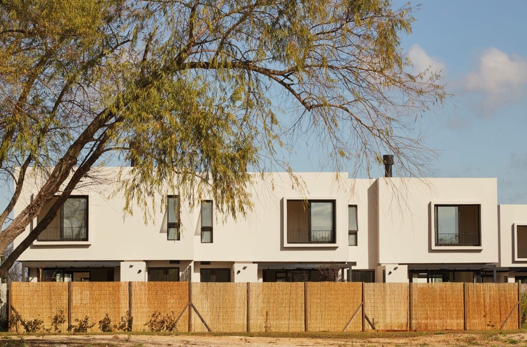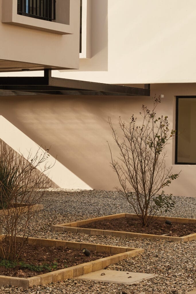 En este proyecto el trabajo de los espacios exteriores, las áreas comunes fue una prioridad. El concepto de comunidad se asienta en este concepto y se relaciona de manera singular con la necesaria intimidad que cada unidad tiene asegurada.  El diseño de las tipologías en todos los casos bi-orientadas y en algunos casos se abre hacia tres fachadas distintas, equilibrio que permite obtener una buena orientación más allá de su implantación.