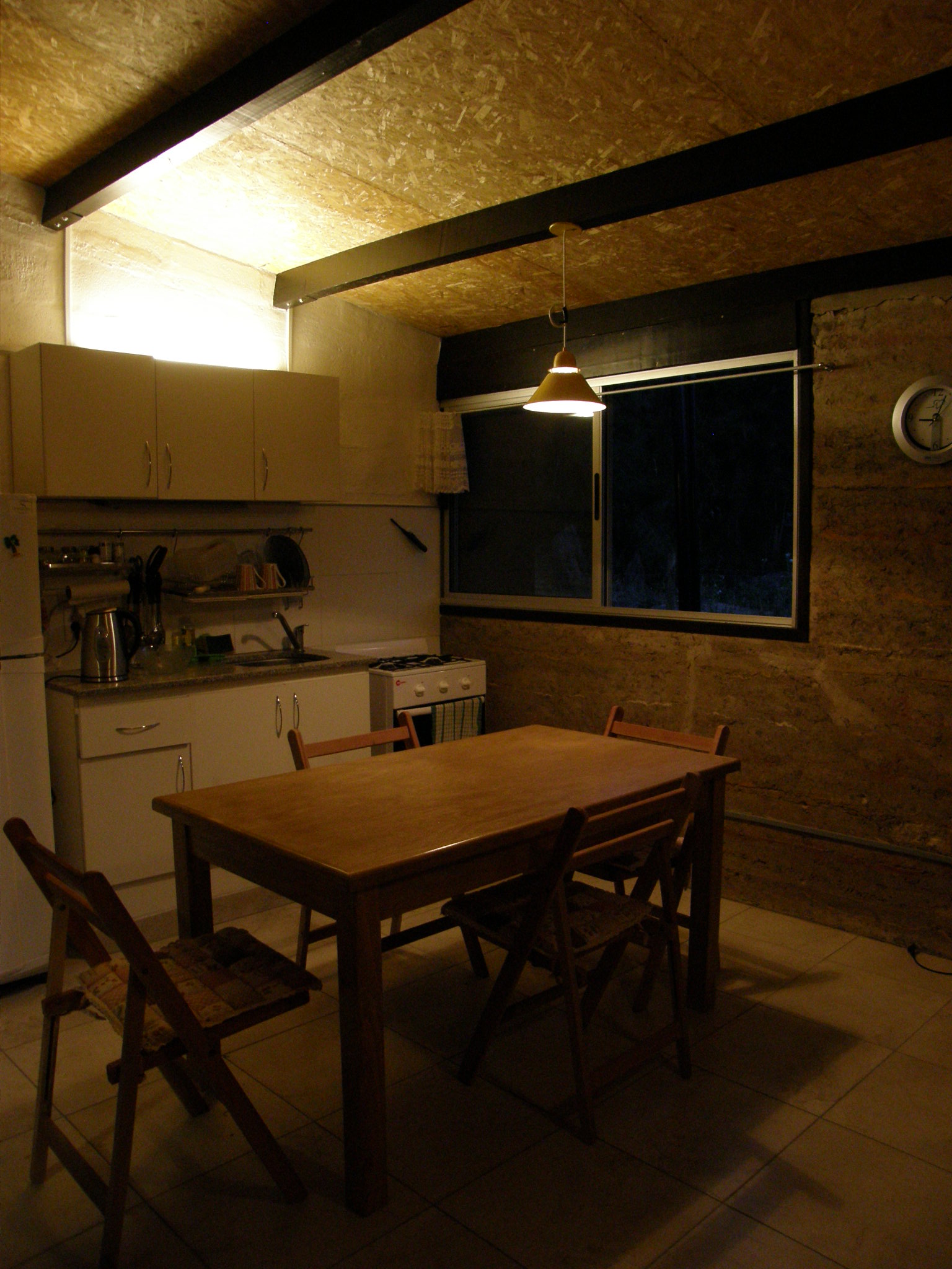 Dado lo reducido del presupuesto y del programa, lo que hacía ciertos costos fijos desproporcionadamente pesados en el valor global, se estudió la factibilidad de obtener del predio parte material de la obra. Es así que el cerramiento exterior principal, el que cierra a los laterales y el fondo del predio, nace de la reutilización del suelo retirado para las instalaciones sanitarias. El nuevo material implicó simplemente el estudio del sustrato y el ensayo de la mezcla para su estabilización, con el fin de llegar a un material acorde con su función de cerramiento y portante. Este proceso, que conformó un muro de tapial, se trató de manera de exhibir su condición de sustrato, exaltando las sucesivas capas que lo componen, cual corte geológico. No se forzaron sus condicionantes a la forma, sino que la misma intentó respetar al máximo las lógicas constructivas propias, evitando artilugios comprometedores y costosos, apostando a su belleza racional. Luego sin prejuicios, se apeló bajo el mismo lema a los materiales a los que puede acceder un bajo presupuesto y pequeña obra en el interior del país: los tabiques de bloques fraccionan el único espacio interior, cuya lectura conjunta es leída gracias a las estructuras continuas del techo y el muro perimetral. Todos expresan su verdad material y constructiva: en ellos hay una posibilidad de leer la lógica productiva y proyectual.
