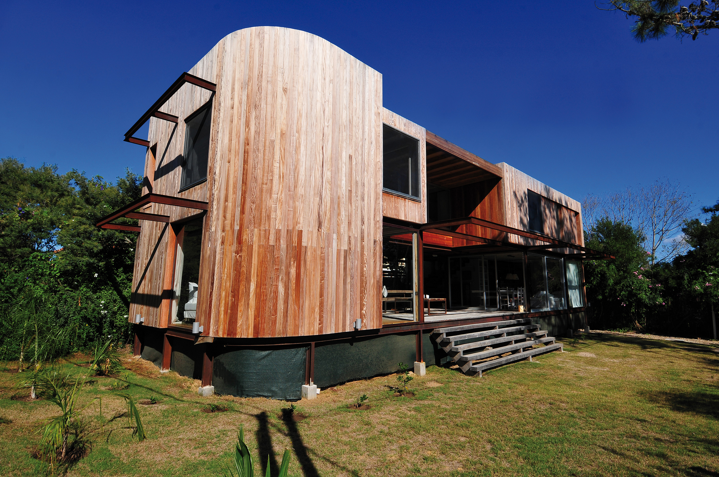 Para la construcción de esta vivienda el arquitecto incursionó, a modo de ensayo, en un sistema constructivo novedoso, basado en una estructura de hierro y revestimiento exterior de madera dura de lapacho. Esto implicó menor tiempo de obra, por tratarse de obra seca, menos en los baños, que se estucaron.