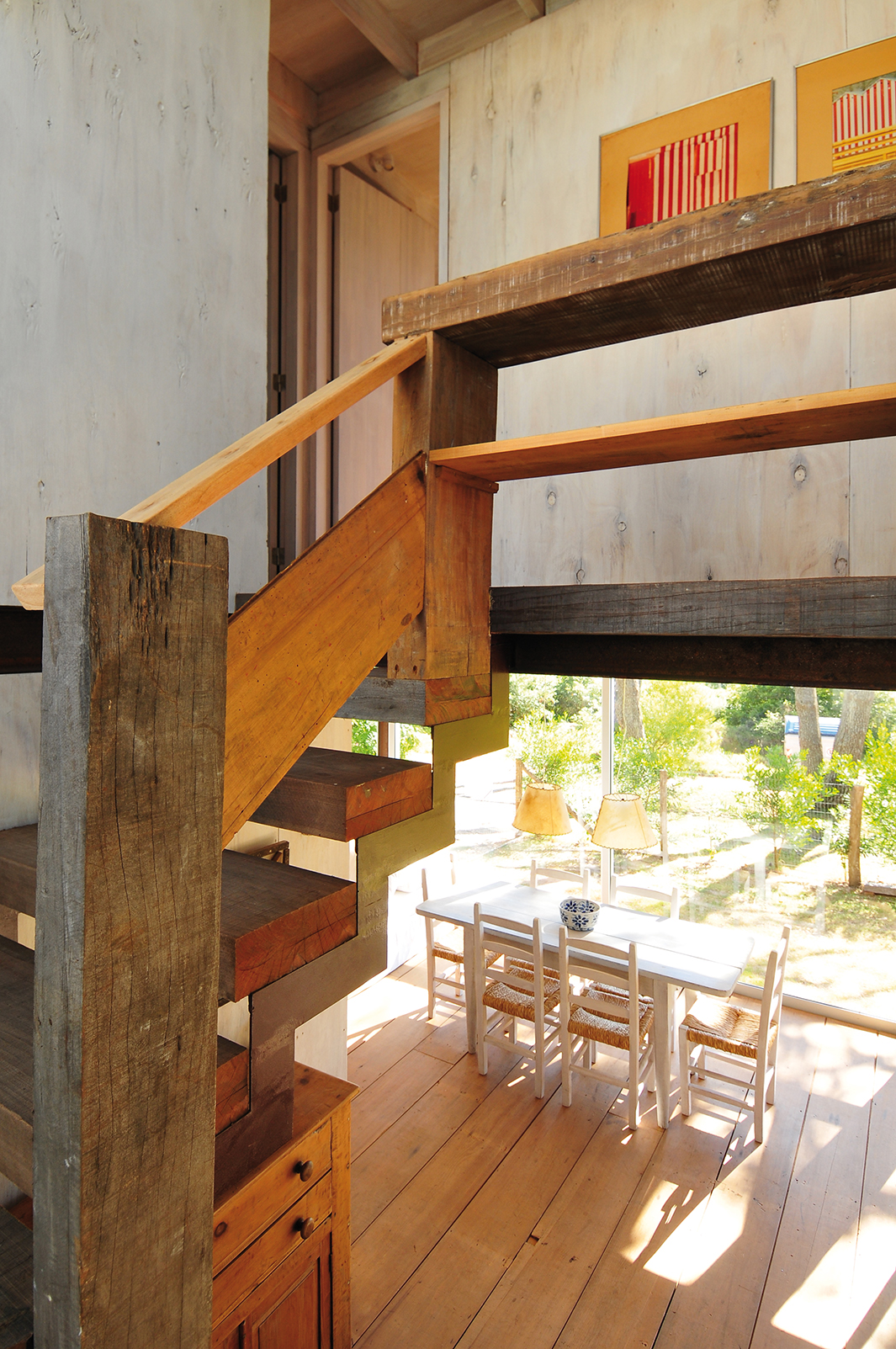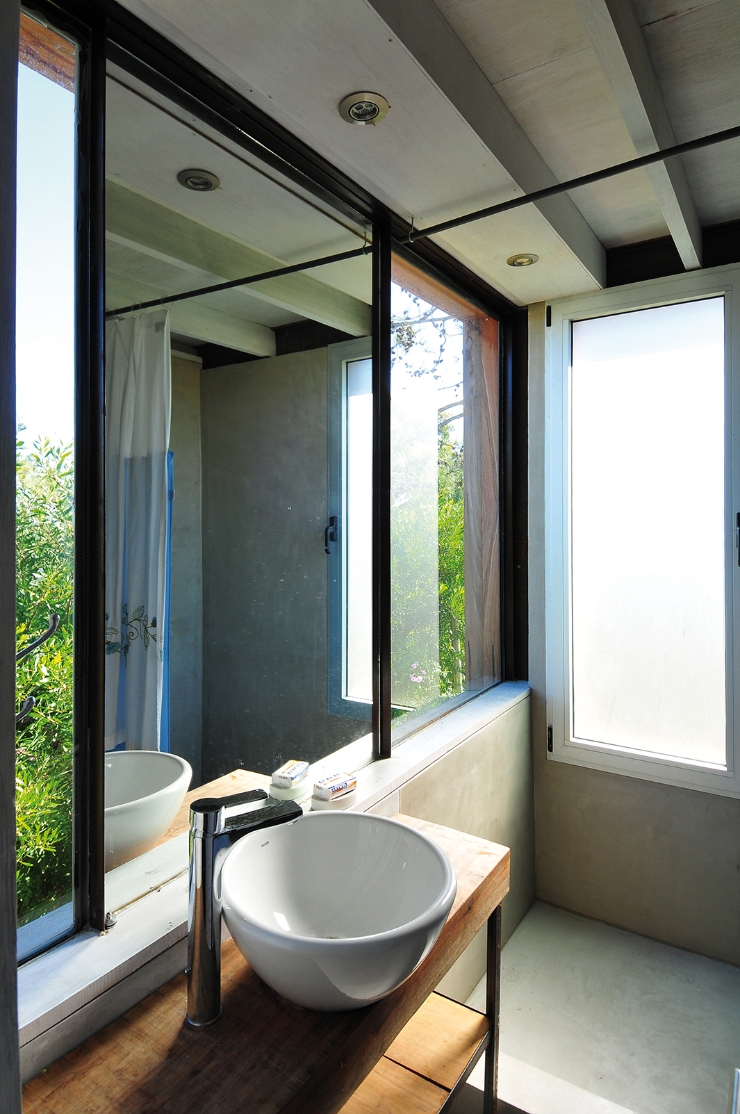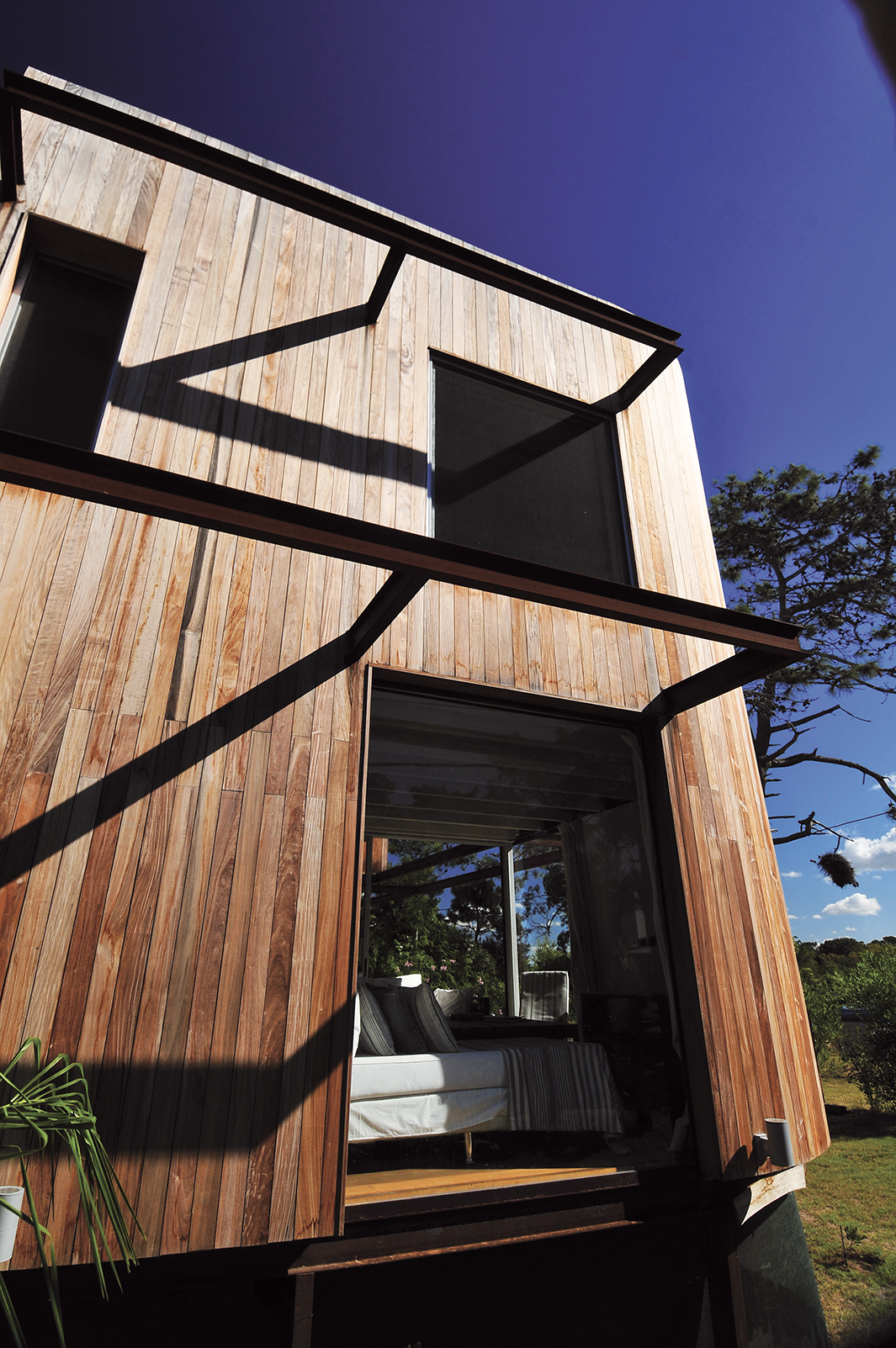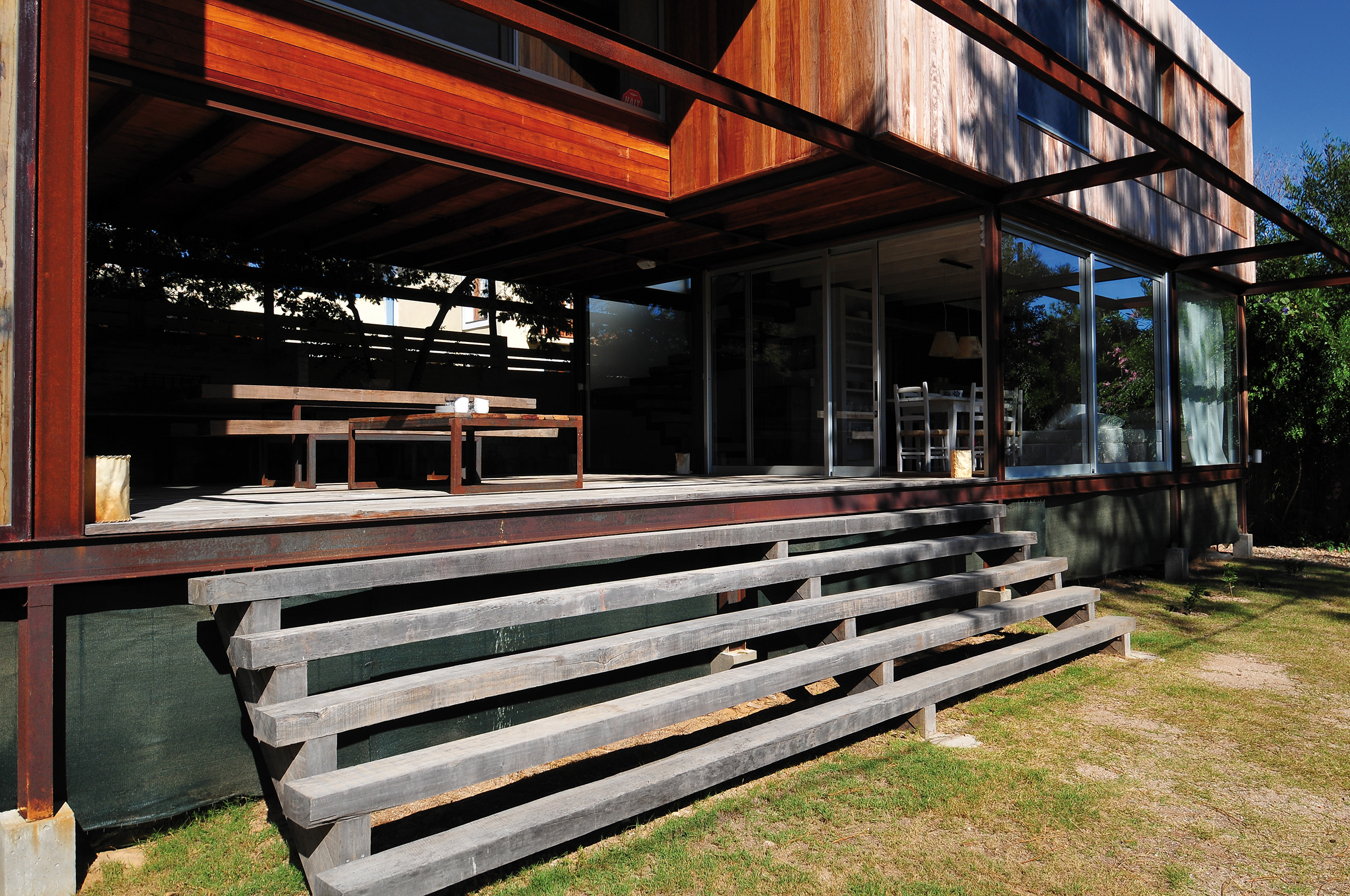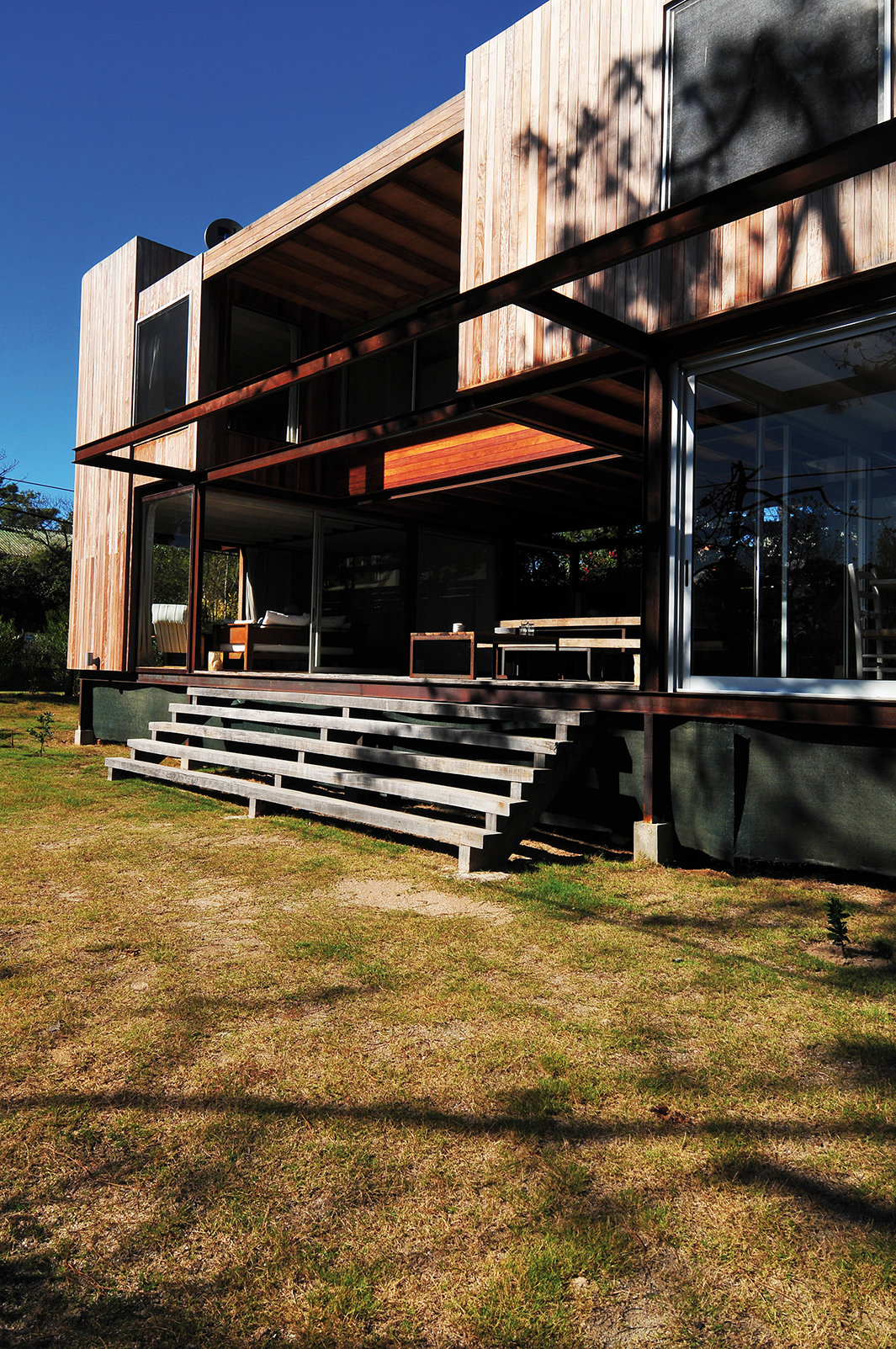 La construcción se eleva del terreno, cuyo punto de contacto es el acceso al espacio central a través de una escalera liviana realizada en madera y hierro, como todo el esqueleto de la casa.