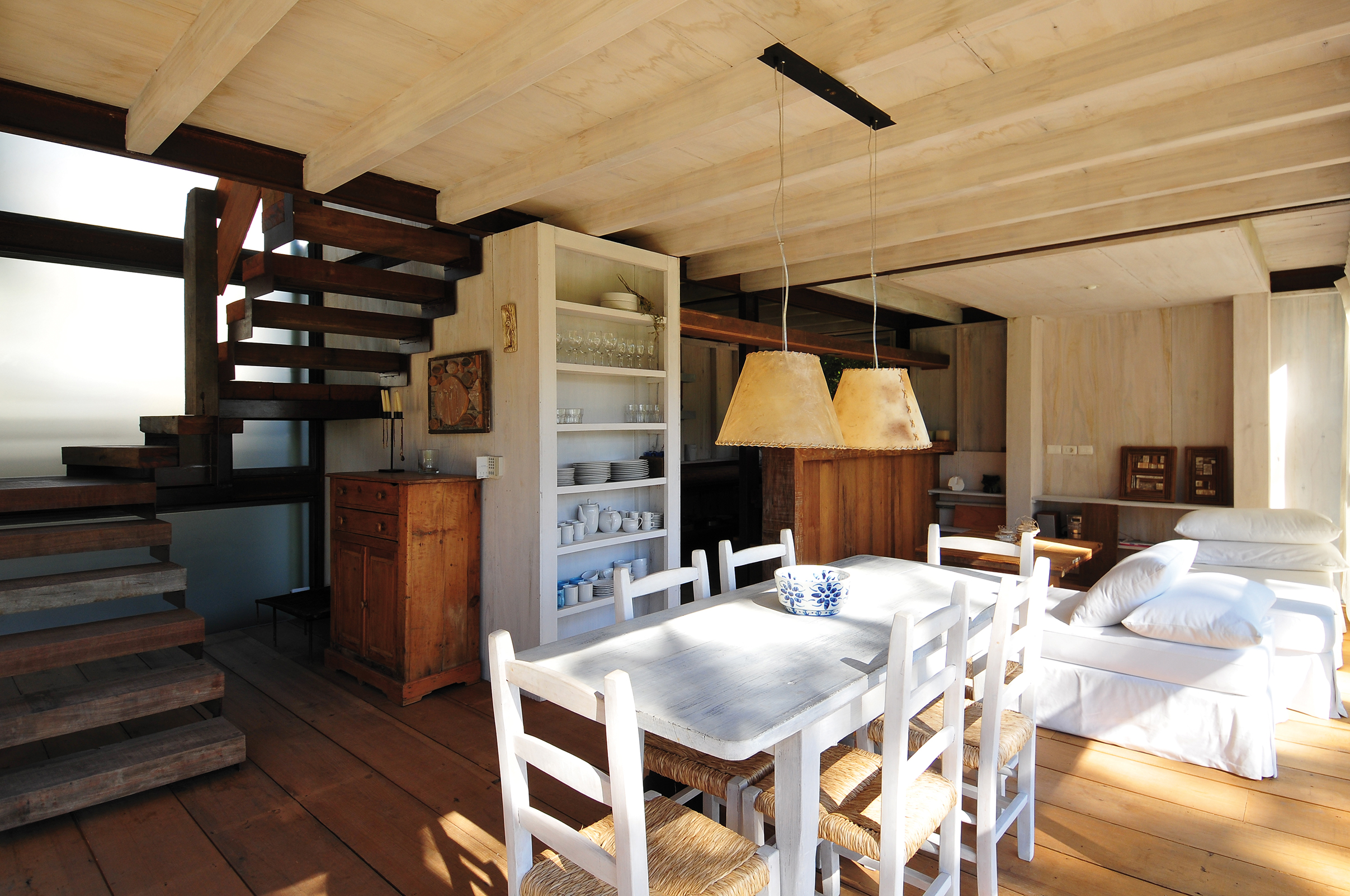La presencia de piezas antiguas en la conformación de los ambientes dialoga con el sistema moderno constructivo, pisos exteriores de lapacho con pátina blanca, pisos interiores de pino y tirantería de hierro, todas piezas obtenidas de demolición, que le confieren al espacio un carácter único. En el interior las carpinterías continúan el lenguaje del hierro y la madera, combinados con revestimiento de madera con pátina de colores neutros, que suavizan el conjunto y logran un destacado equilibrio.