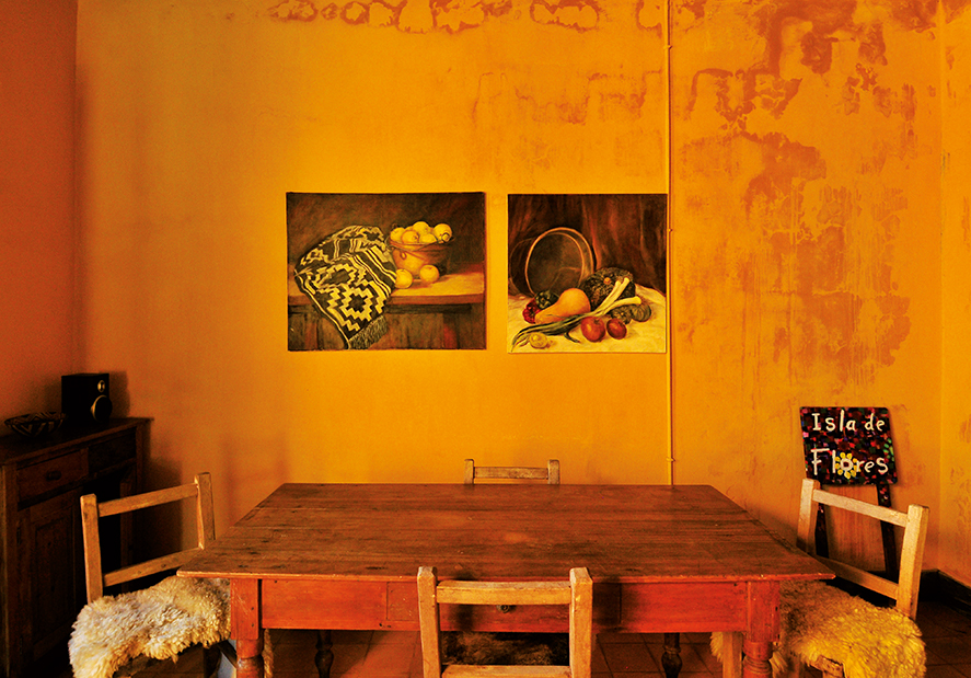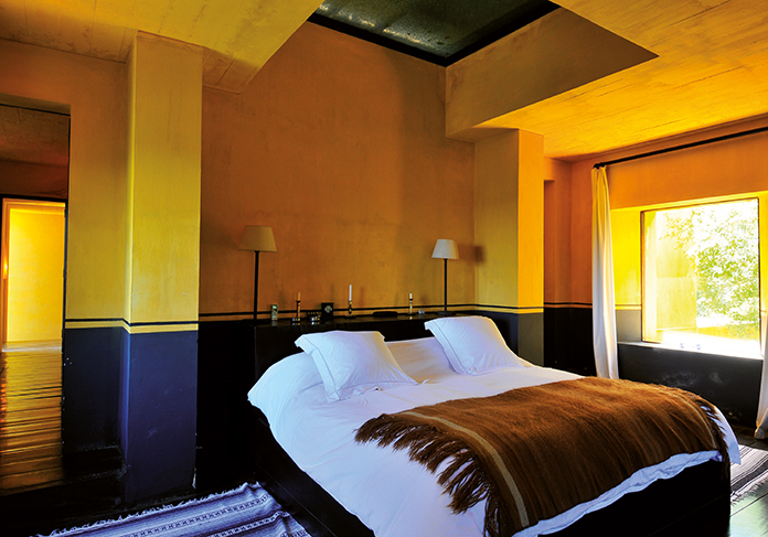 La primera sugerencia que el arquitecto propuso a sus clientes fue construir una pequeña casa dentro del predio, para que pudieran vivir el lugar, al menos durante un año, y entonces sí, decidir dónde ubicar definitivamente la gran casa. Mientras tanto conversarían sobre la idea arquitectónica, la distribución espacial y el carácter de la obra. Esta primera construcción es la que hoy se destina para alojar huéspedes. El resultado es conmovedor. La Casa Amarilla tiene carácter, vida propia. Vida que refleja a Claudia y Alfredo, a sus historias de vida y sus inquietudes. La casa fue concebida a la antigua, con paredes de 60 cm, sus líneas son rectas y juegan con la verticalidad y con el ritmo de plenos y vacíos. Está implantada en un lugar alto del terreno con el fin de capturar las mejores vistas hacia la costa y, fundamentalmente, hacia el faro. La espacialidad interior está concebida a partir de un cuidado juego de niveles que lentamente y sin apuro nos van induciendo a un recorrido que por momentos parece no tener fin. Este movimiento, de increíble poesía, comienza en el hall de entrada y desde allí comienza a descender, con pereza, sin apuro. Al ingresar por la gran puerta de madera, de frente nos encontramos con un ventanal enorme del piso a techo, apuntalado por un espejo de agua contiguo que proyecta nuestra visión hacia lo más profundo del verde circundante. Los pisos están revestidos con tablones de madera de curupay de dos pulgadas, traídos especialmente de Paraguay, y están dispuestos con cámara de aire, como en las antiguas casas. A la derecha, la luz ingresa por varias fajas de vidrio y se proyecta en el piso generando un juego bastoneado que nos marca el recorrido a la vez que interactúa con los escalones de huella larga, que simetrizan con las canaletas de agua en el exterior de la casa. Esas aberturas juegan como las viejas rosetas de las antiguas catedrales, iluminan, pero de una manera especial. Los ventanales están montados con las estructuras embutidas en la mampostería generando así grandes superficies vidriadas que parecen nacidas de los muros. El primer ambiente que encontramos es el living y estar, una gran mesa de billar proveniente de Los 33 Billares, de Buenos Aires, tiene un papel central y establece el eje para la creación de los microclimas que a su alrededor se crean. Una estufa a leña, acompañada por dos sillones ingleses, genera un ambiente cálido de contención. Allí la intervención de Claudia Boatti es plena y el ambiente la refleja totalmente. Un telescopio completa la escena y grandes ventanas, cuyos marcos están insertos en la mampostería logrando que el vidrio se pierda en ella, permiten apreciar la vista del lugar. La cocina-comedor, otro ambiente que mereció especial atención de Claudia Boatti, está un nivel inferior, lo primero que llama la atención es el juego de comedor, del siglo xviii, que es un legado familiar y fue trasladado desde un viejo campo de la familia.