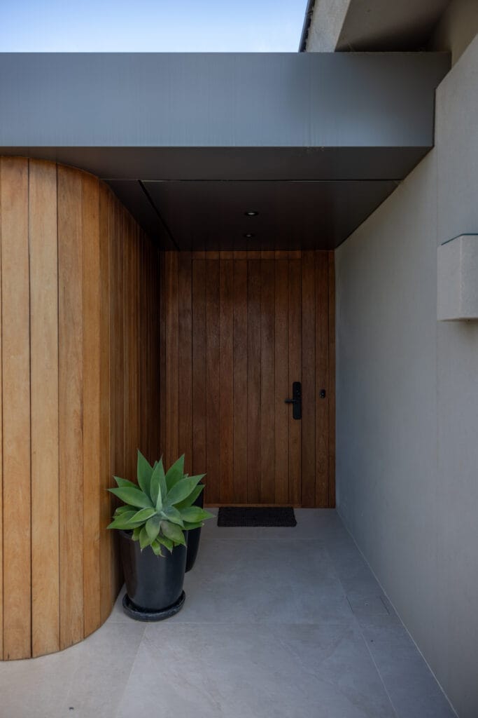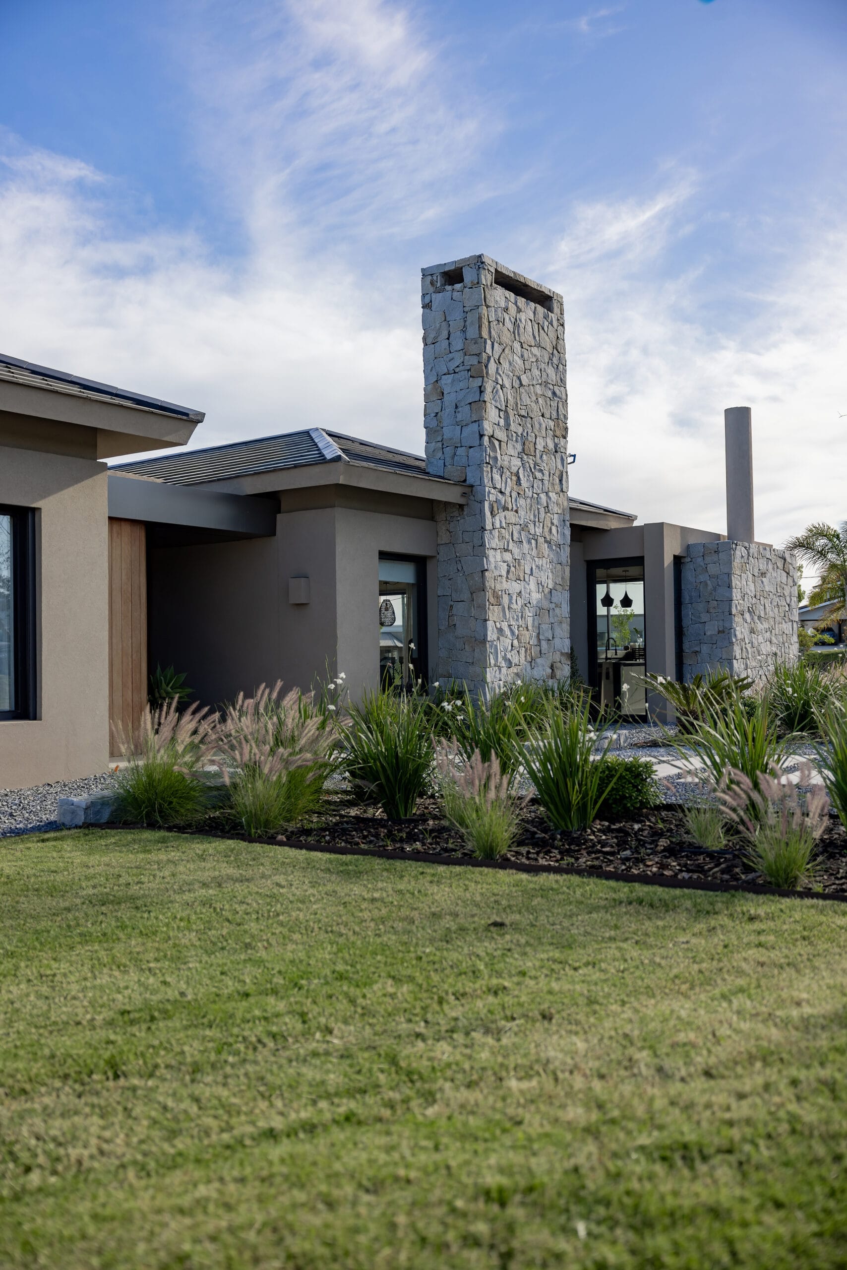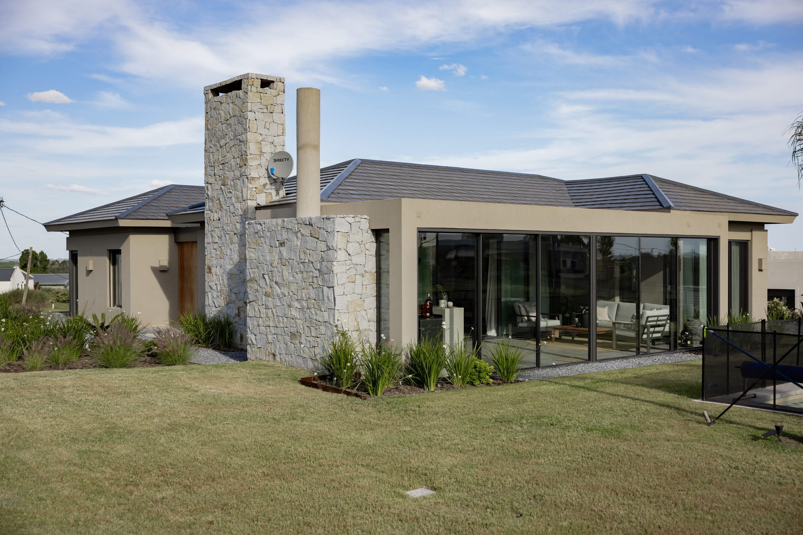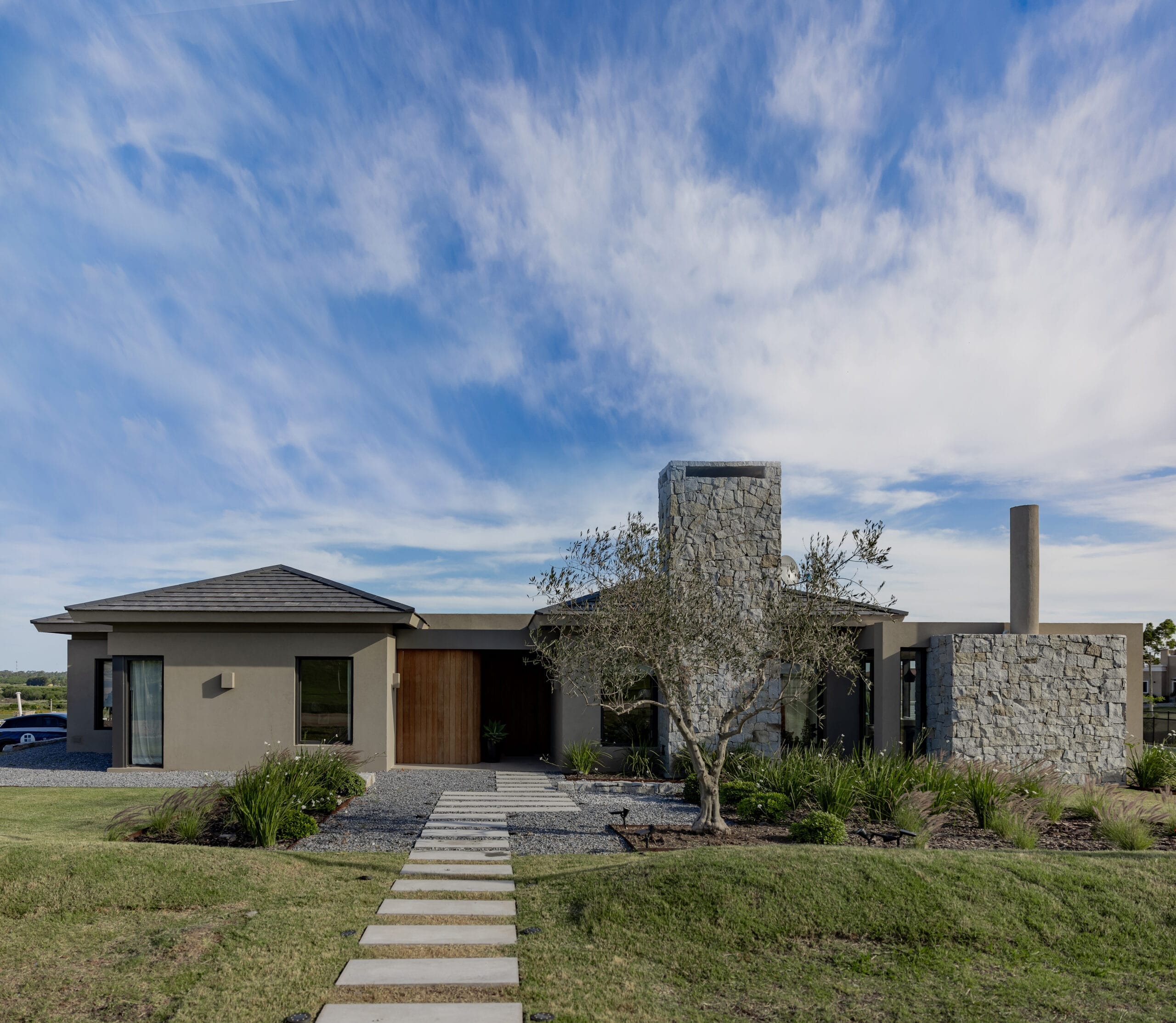 La casa se despliega horizontalmente en una planta con un eje corrido que es impuesto por una gran columna revestida en piedra. El protagonismo de este elemento genera resguardo y convierte el acceso en un camino inductivo precedido por una suerte de gran atrio que demora el ingreso. El juego de volúmenes establece cajas que se comunican entre sí e imponen el ritmo que aliviana el peso de la estructura. Un segundo muro de piedra, bajo y ancho que se corresponde con la trasera del parrillero. En la contra fachada el elemento integrador es un gran arco que incluye delgadas columnas de hormigón pintadas en color negro. Todo lo que niega la fachada en su contacto con el exterior, lo abre en la contra fachada definida a partir de ventanales importantes.