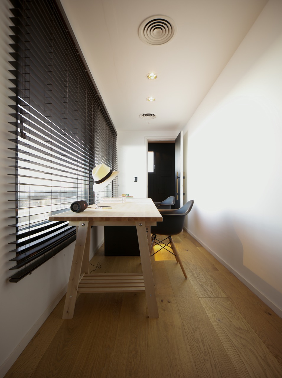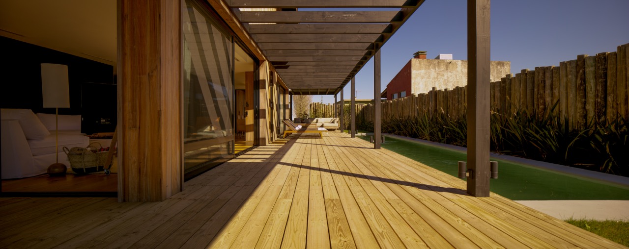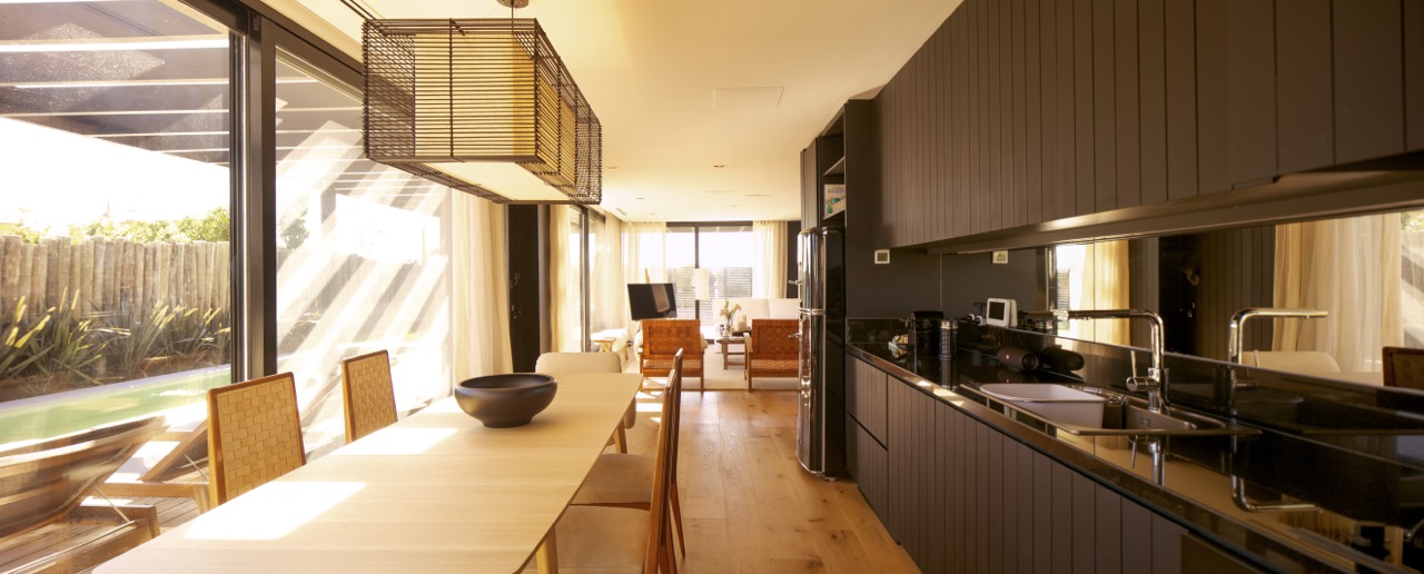 Las áreas sociales de la vivienda se acomodan de manera integral, comunicando fluidamente todos los espacios entre sí. Al revestir las paredes con White American Pine importado desde USA, se genera un impactante contraste con la terminación roble de las placas del piso. Todo el mobiliario oscila en la gama de colores claros y cueros color whisky, generando a su vez una oposición visual con el lustre oscuro de las paredes. El comedor alargado se enfrenta simétricamente a la cocina integrada fomentando situaciones sociales que combinen el arte de cocinar y la tertulia entre amigos.