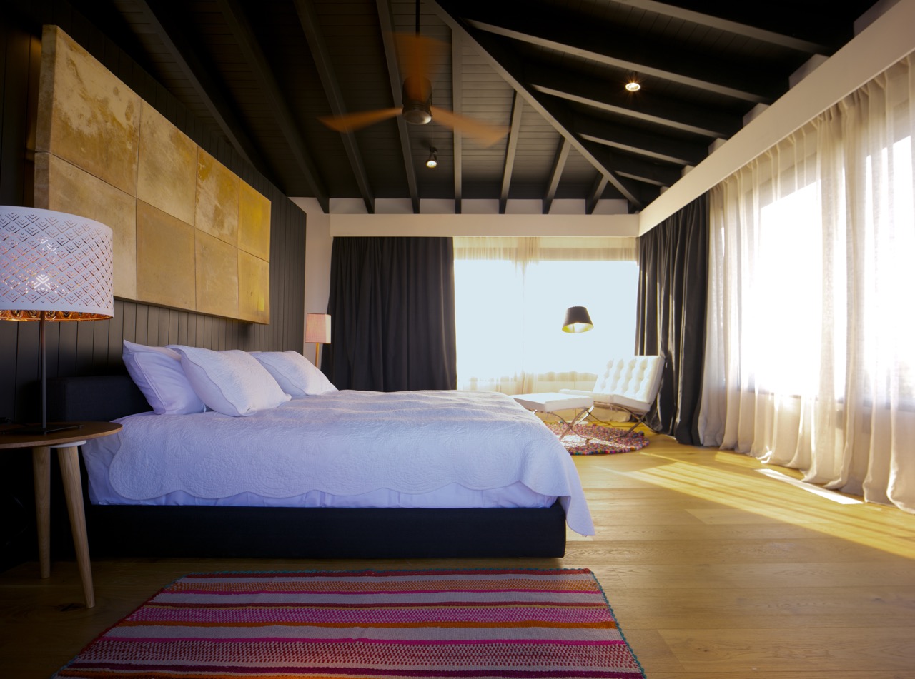 En la planta superior, los revestimientos de madera continúan envolviendo los espacios acogiendo ahora situaciones de relajación y descanso. Con un estilo despojado que se contagia de la tendencia escandinava, se presenta un amplio dormitorio principal con piezas de diseño importado y otras locales, que se combinan para generar un ambiente tranquilo en donde el invitado pueda distenderse.