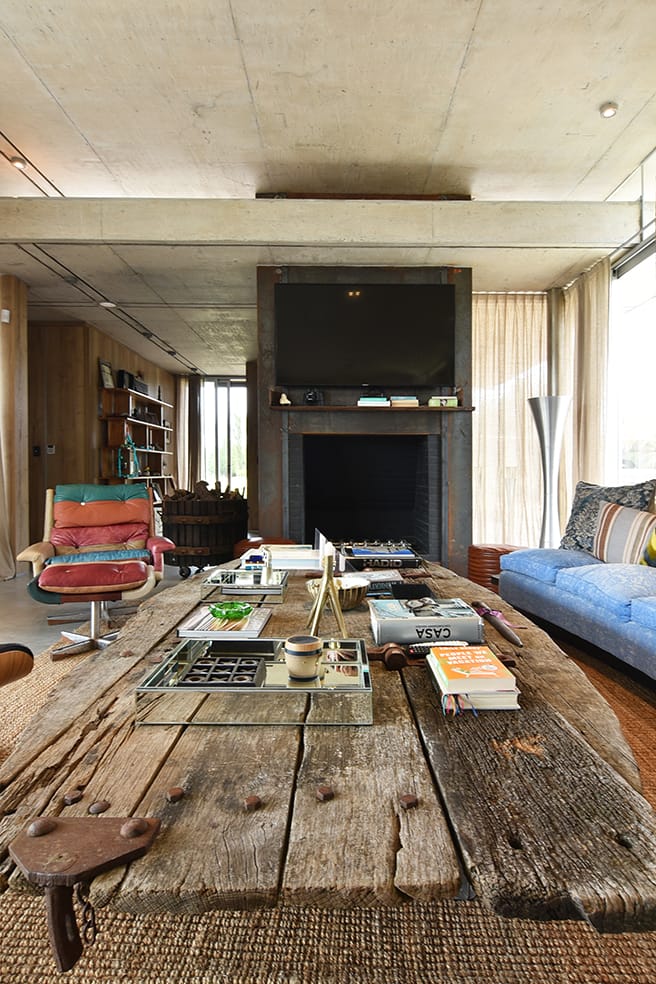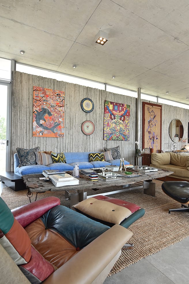 La pared ciega sobre la que se respalda este ambiente incluye una abertura dispuesta en raja sobre la parte superior y entontes también es un plano que luce una selección de obras plásticas de autores contemporáneos donde el color establece un marco ideal.