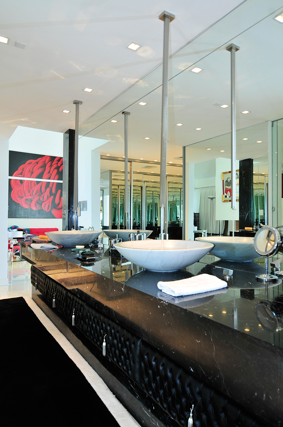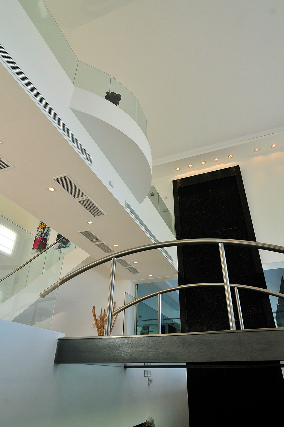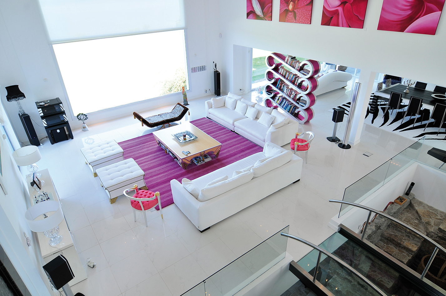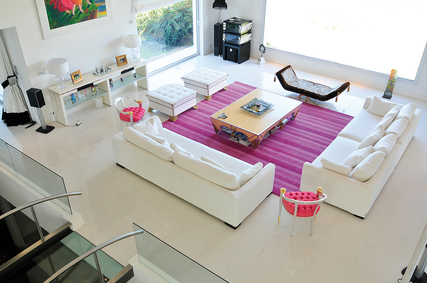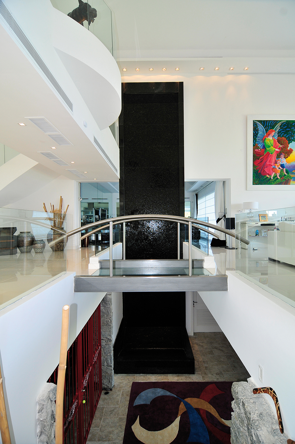El interior de la casa es grandilocuente; el living principal supera los 200 metros cuadrados, y todos los ambientes, incluso la cocina, miran hacia la laguna. La doble altura del cuerpo central de la planta baja permite una majestuosa escalera y una pasarela elevada que oficia de balcón y conduce hacia la suite principal que supera los 150 metros cuadrados y es el único ambiente en la planta superior en ese sector. La doble altura en el eje de la planta desciende un nivel más y se integra, respetando la pendiente natural del terreno con la cava y el gimnasio. Ese sector limpio esta marcado horizontalmente por una raja de mármol con un circuito de agua constante que nace en la cava y llega hasta el pináculo de la cubierta principal. El efecto sorprende, aporta estéticamente y cuenta con el buen gusto de los habitantes que equiparon con muebles originales de Versace.