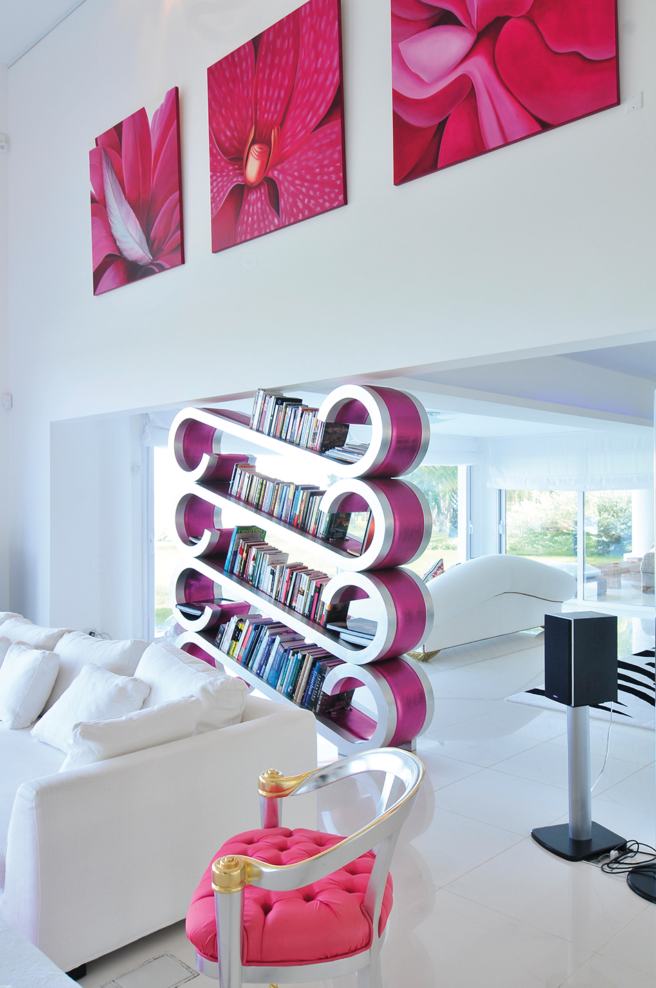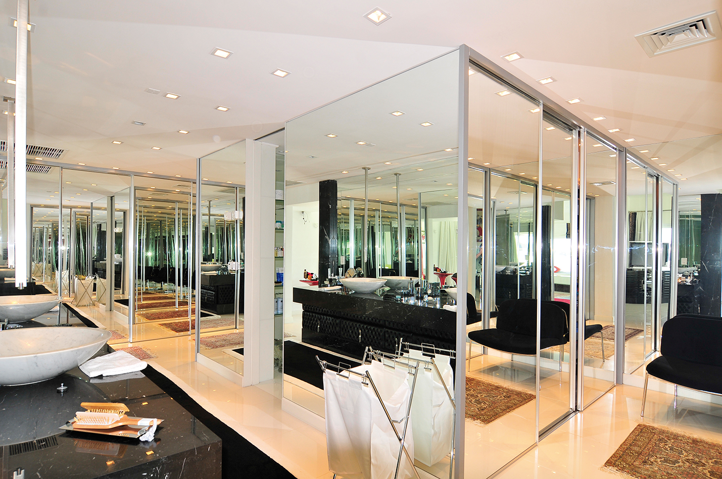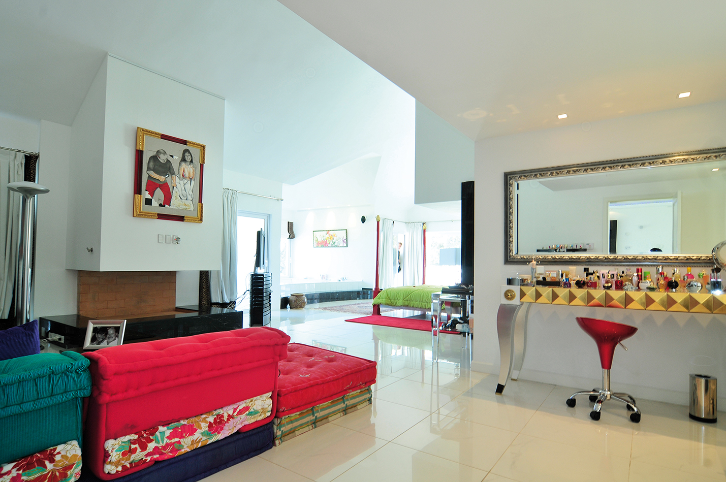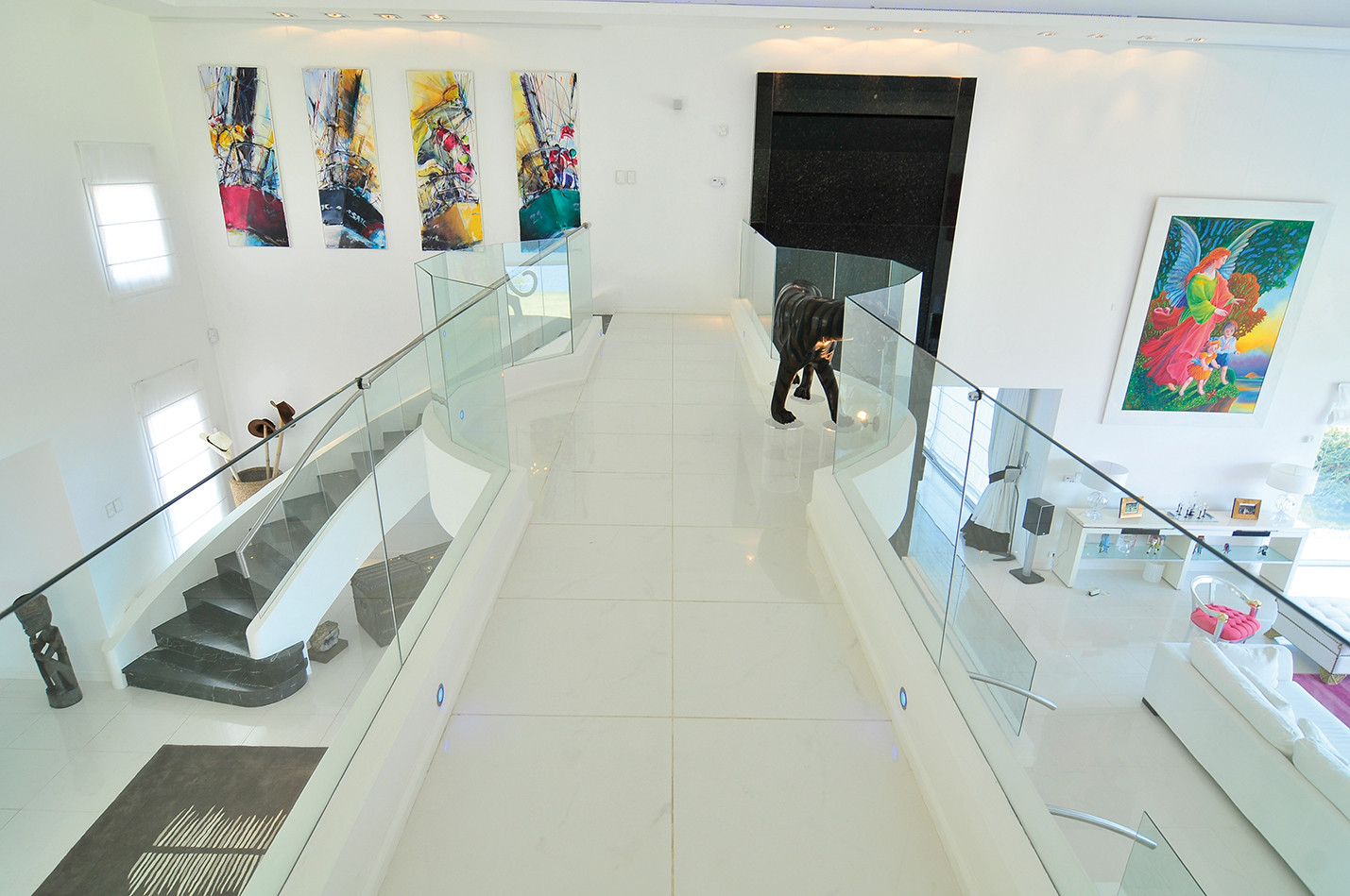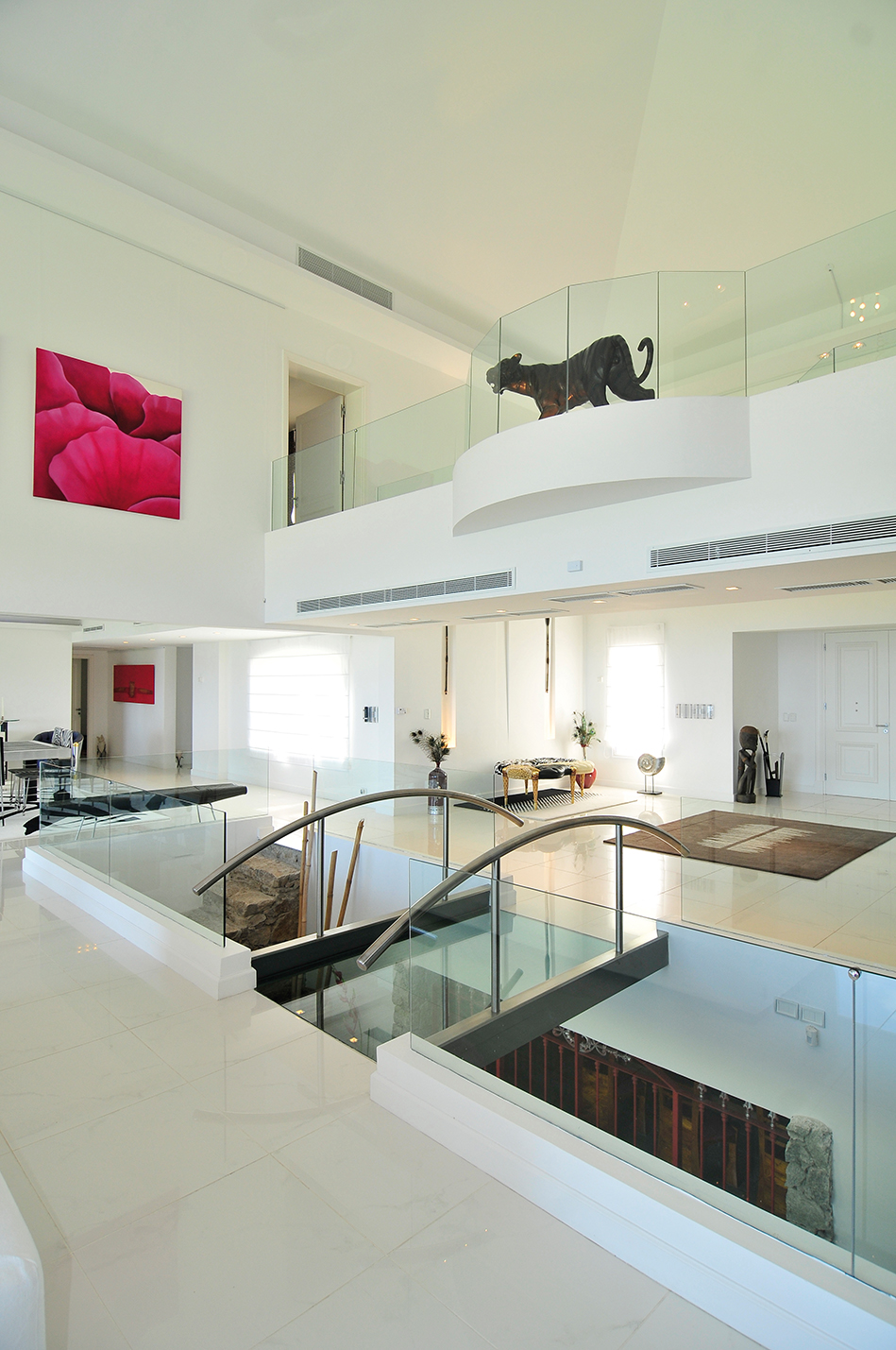 El interior de la casa es grandilocuente; el living principal supera los 200 metros cuadrados, y todos los ambientes, incluso la cocina, miran hacia la laguna. La doble altura del cuerpo central de la planta baja permite una majestuosa escalera y una pasarela elevada que oficia de balcón y conduce hacia la suite principal que supera los 150 metros cuadrados y es el único ambiente en la planta superior en ese sector. La doble altura en el eje de la planta desciende un nivel más y se integra, respetando la pendiente natural del terreno con la cava y el gimnasio. Ese sector limpio esta marcado horizontalmente por una raja de mármol con un circuito de agua constante que nace en la cava y llega hasta el pináculo de la cubierta principal. El efecto sorprende, aporta estéticamente y cuenta con el buen gusto de los habitantes que equiparon con muebles originales de Versace.