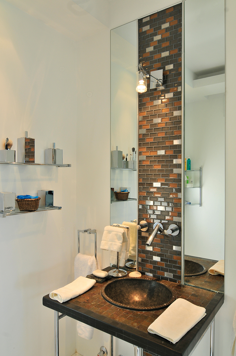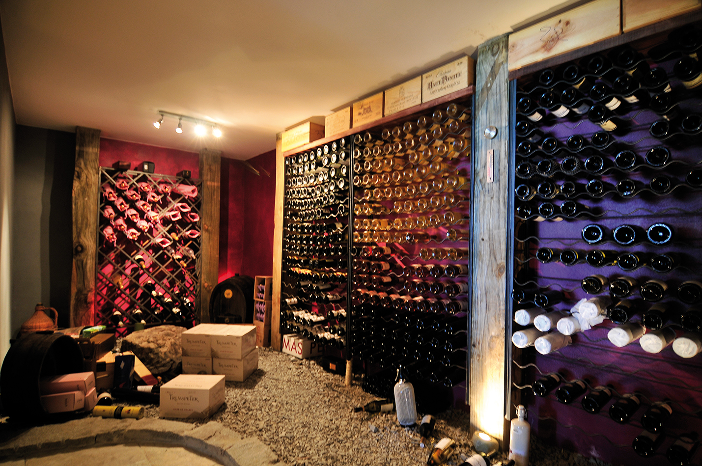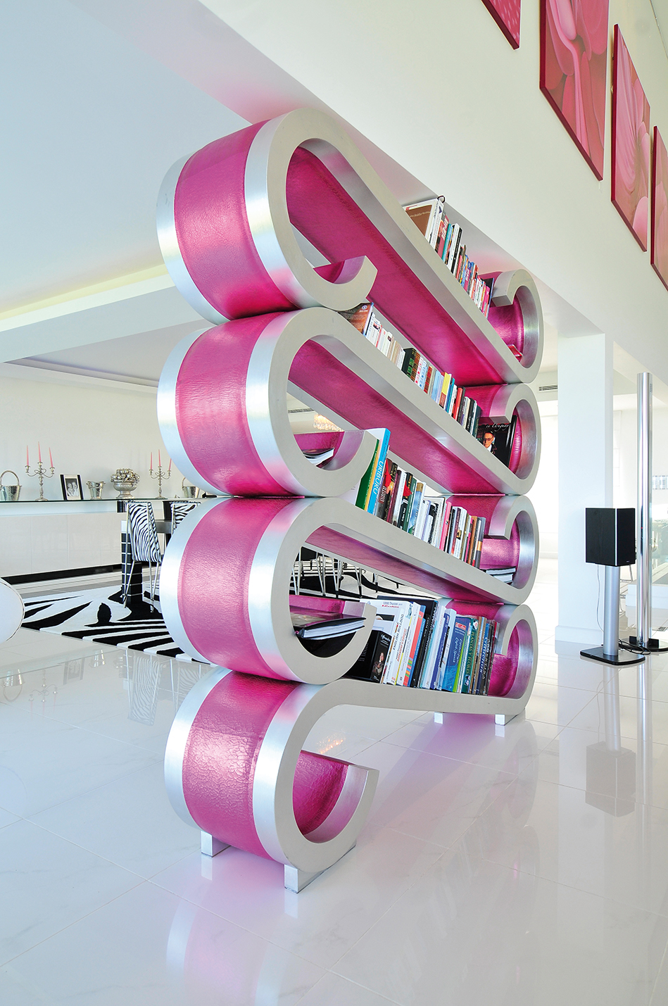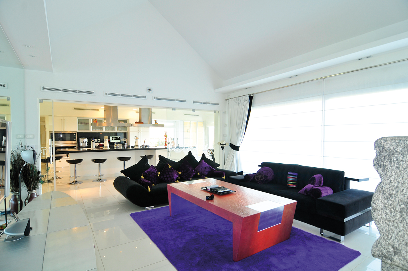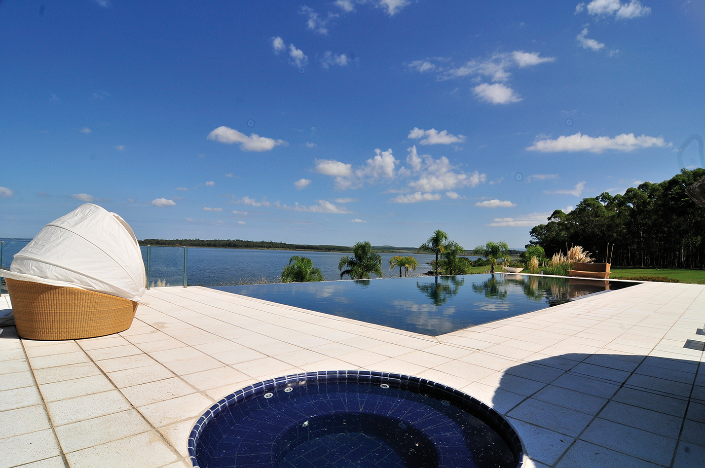 El interior de la casa es grandilocuente; el living principal supera los 200 metros cuadrados, y todos los ambientes, incluso la cocina, miran hacia la laguna. La doble altura del cuerpo central de la planta baja permite una majestuosa escalera y una pasarela elevada que oficia de balcón y conduce hacia la suite principal que supera los 150 metros cuadrados y es el único ambiente en la planta superior en ese sector. La doble altura en el eje de la planta desciende un nivel más y se integra, respetando la pendiente natural del terreno con la cava y el gimnasio. Ese sector limpio esta marcado horizontalmente por una raja de mármol con un circuito de agua constante que nace en la cava y llega hasta el pináculo de la cubierta principal. El efecto sorprende, aporta estéticamente y cuenta con el buen gusto de los habitantes que equiparon con muebles originales de Versace.