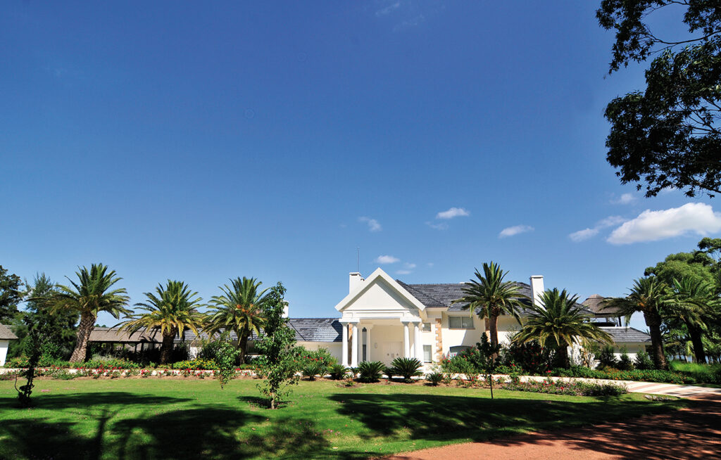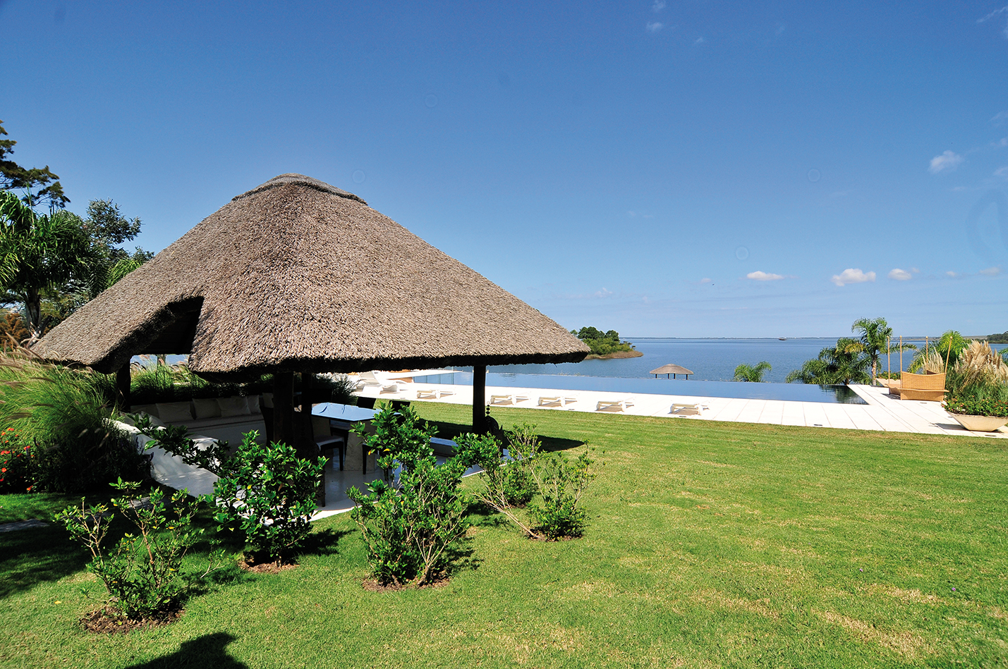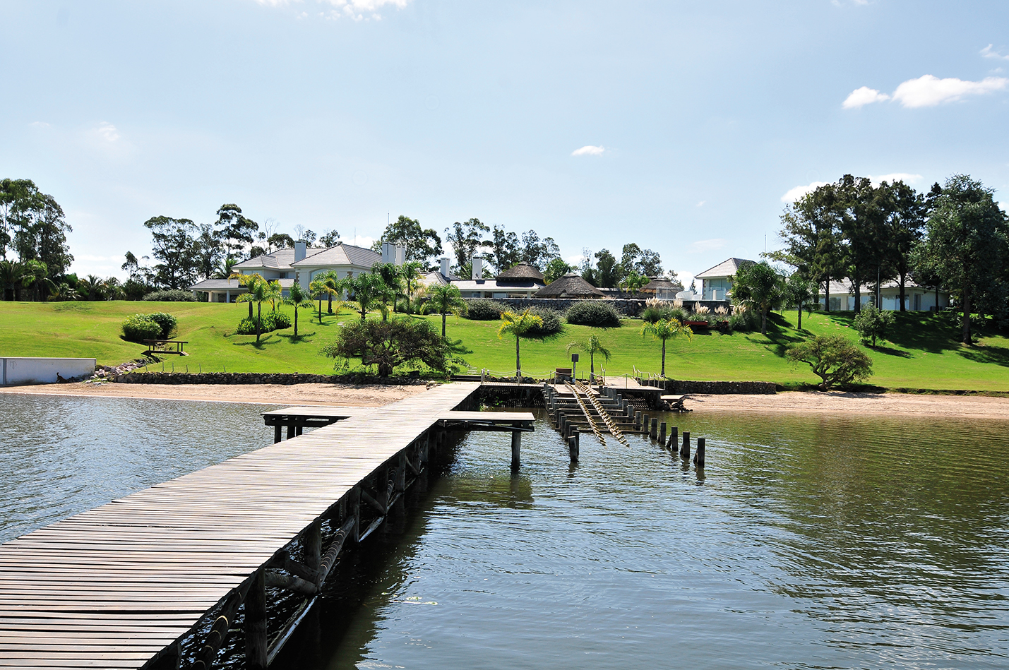 En este proyecto emergen naturalmente todos los elementos que definen la idea que de la casa tiene el Arq. Margoniner. Desarrollo lineal, doble altura interior, respeto por el terreno en la implantación y aprovechamiento máximo del contacto con la naturaleza circundante. Se trata de una casa de campo a orillas de una laguna, las 26 hectáreas hicieron posible que el volumen de 1.670 metros cuadrados pasara inadvertida, la escala es importante. La fachada principal fue dotada de un gran pórtico de origen clásico que ordena la circulación vehicular generando una plazoleta. La fachada posterior volcada hacia la laguna es, como corresponde, la más importante. La casa cuenta en su desarrollo lineal con una barbacoa integrada al edificio principal coronada con una cubierta de paja a partir de la cual se desarrolla una galería, también cubierta con paja a dos aguas que comunica con la cochera, la dependencia de servicio y mas allá una esplendida casa para huéspedes.