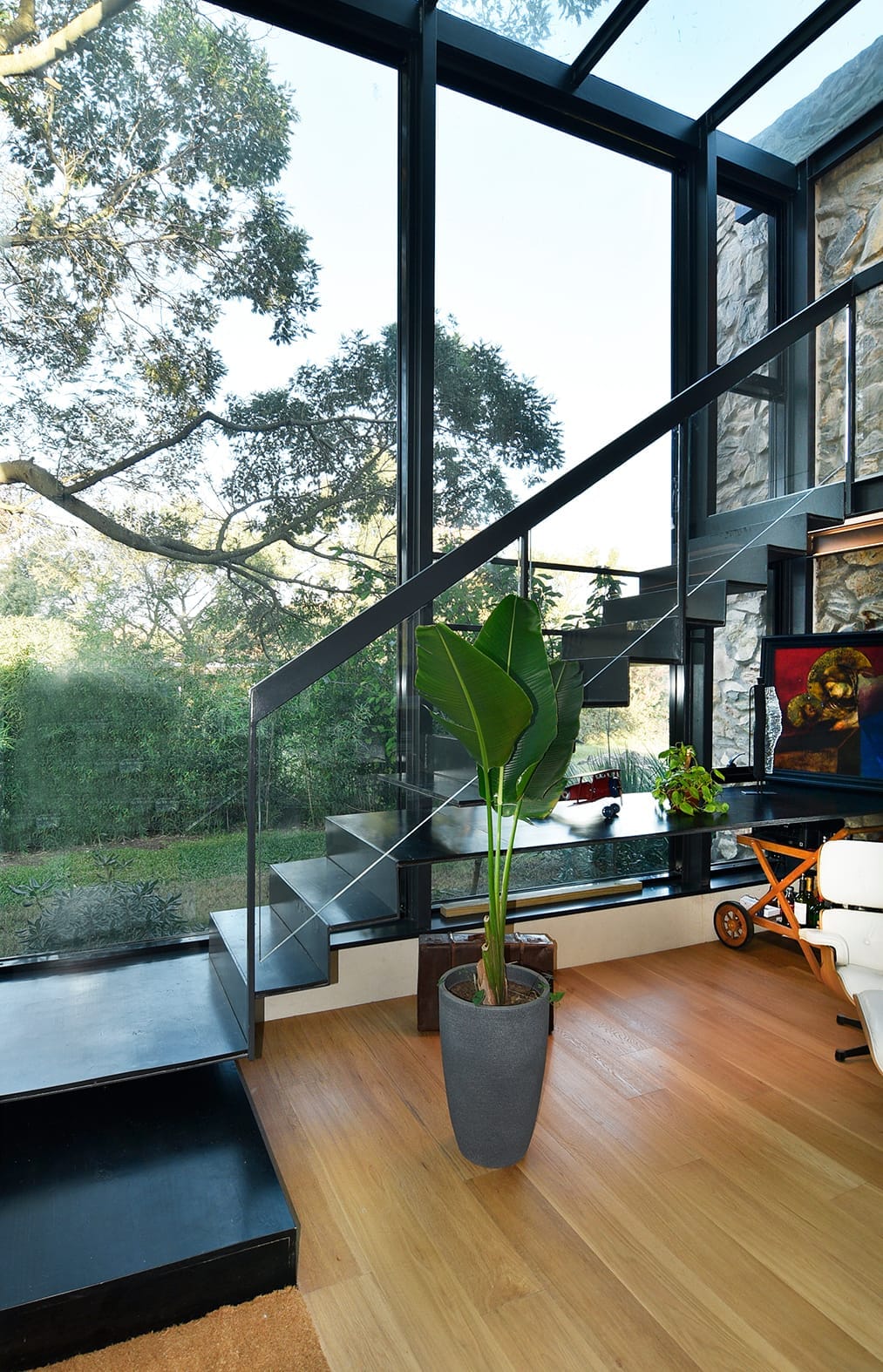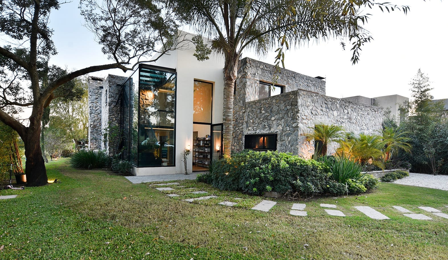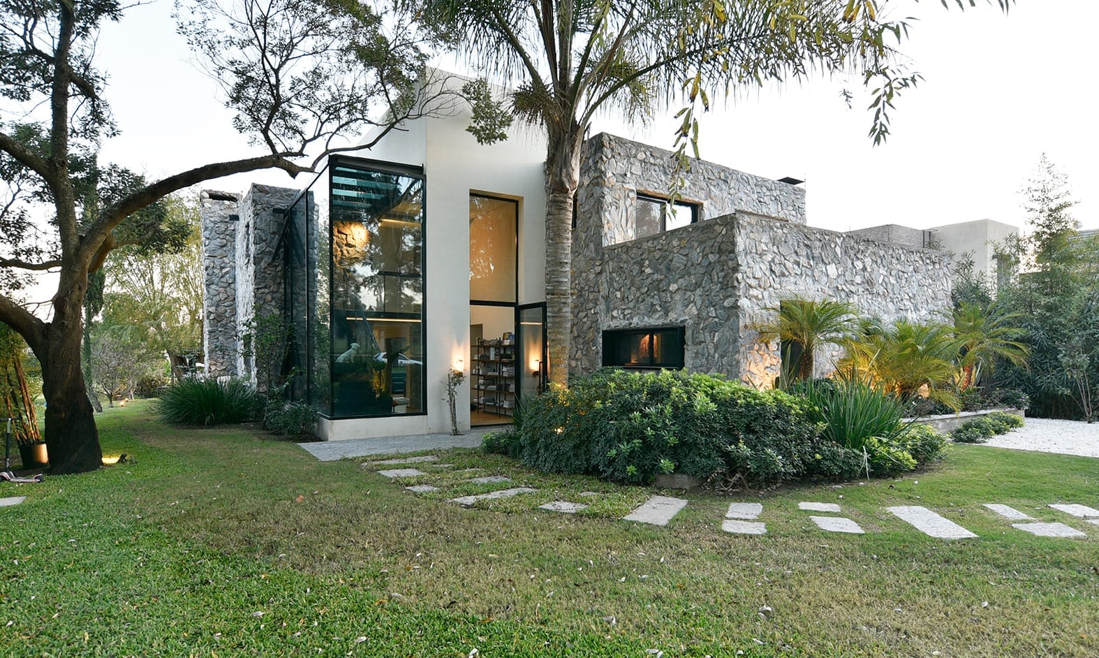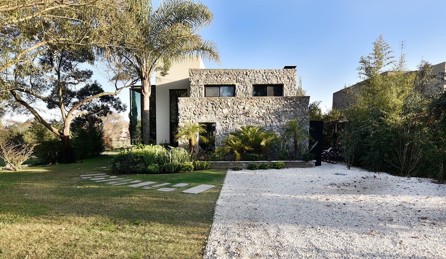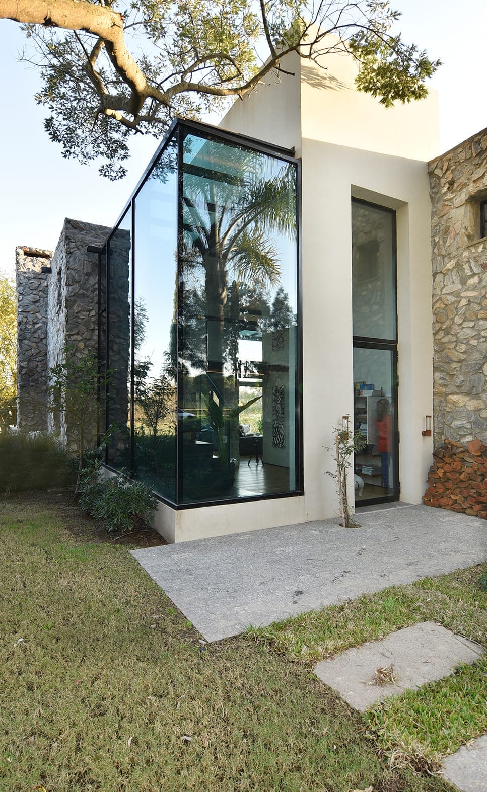 El proyecto de Karin Bia en Lomas de la Tahona está cuidadosamente anidado en el paisaje natural y se inspiró claramente en el lugar, un terreno rodeado de árboles maduros, increíblemente rasgado por una cañada y una magnífica vista abierta hacia el  campo. La transparencia, el vidrio, es el único material que tenía sentido para la intervención en este escenario. En verano la densa frondosidad de los árboles envuelve toda la casa, haciéndola casi invisible desde la calle y protegiéndola del sol. En invierno, los árboles caducos pierden sus hojas, permitiendo que los rayos del sol penetren y calienten el interior, beneficiándose del aporte del acondicionamiento natural de la vivienda.  Hecha a mano, piedra sobre piedra, la casa es una vivienda única en el desarrollo y producción del estudio Karin Bia Arquitectos.