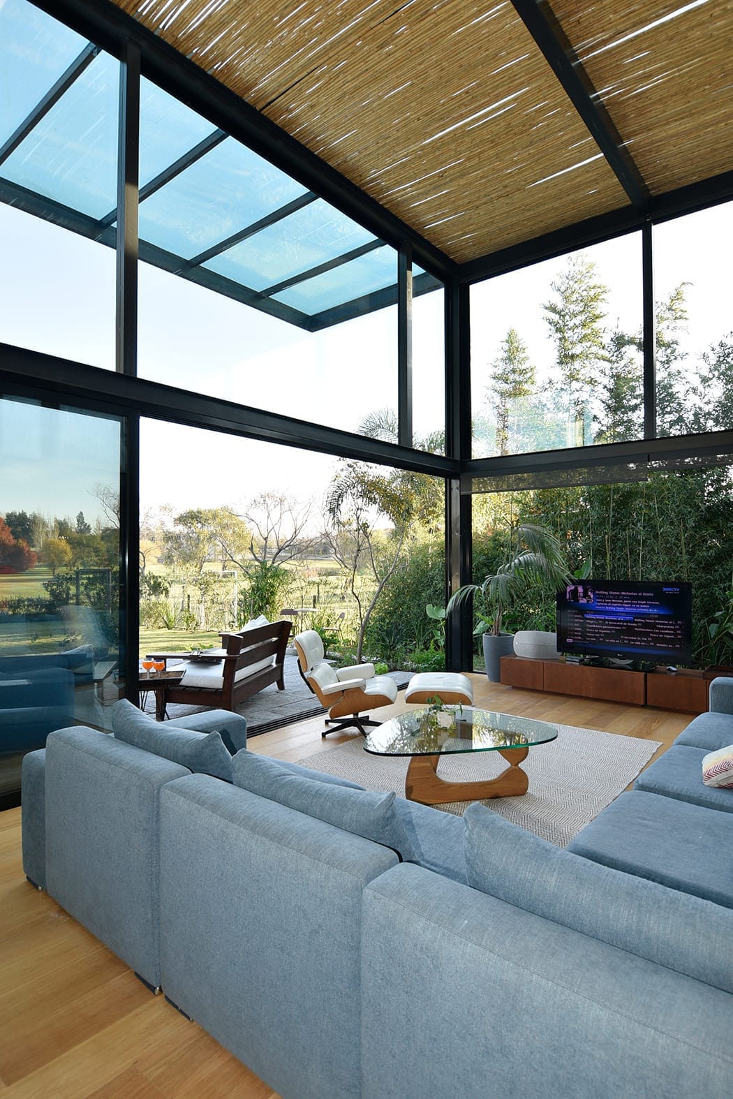 El techo del entrepiso y del jardín de invierno, tiene un acabado de bambú, que aporta la calidez y frescura de la fibra natural, elemento que introduce y captura el exterior al interior de la vivienda. La cocina destaca por su impronta contemporánea, se organiza en torno a una isla central blanca, con armarios perimetrales en madera oscura y cristal opacid serigrafiado color azul cielo. Tiras de led con difusor, ocultas en buñas del cielorraso enmarcan las circulaciones y definen los espacios. El salón principal combina una paleta sobria con equipamiento de diseño y la gran presencia de la piedra y el vidrio como material de identidad.