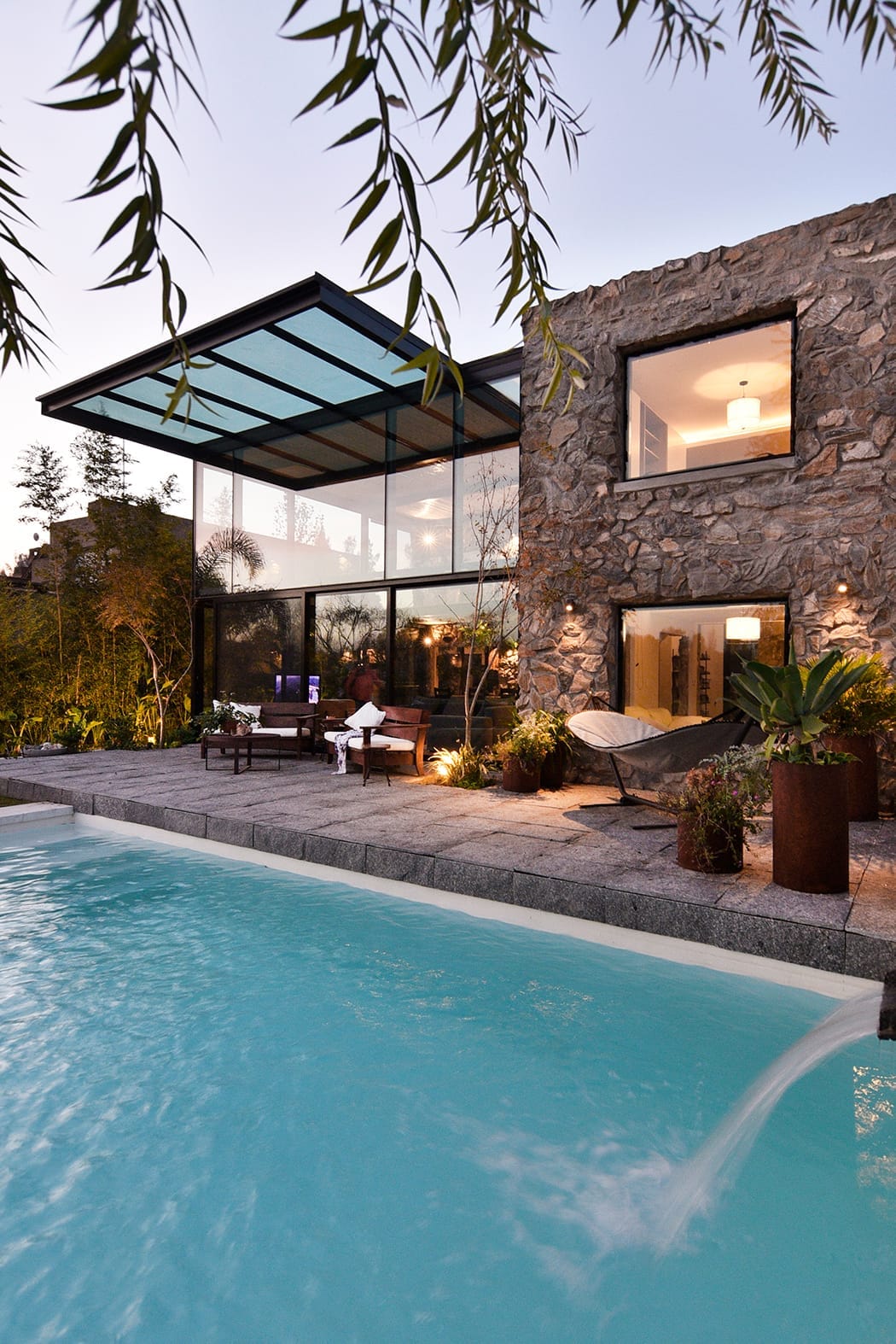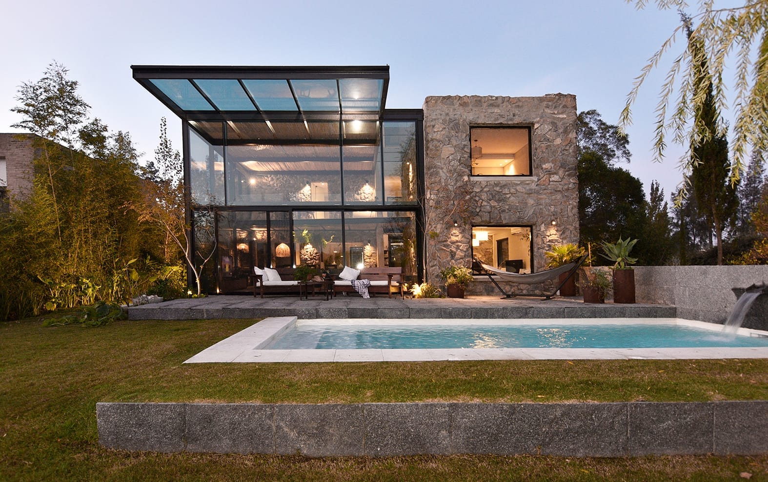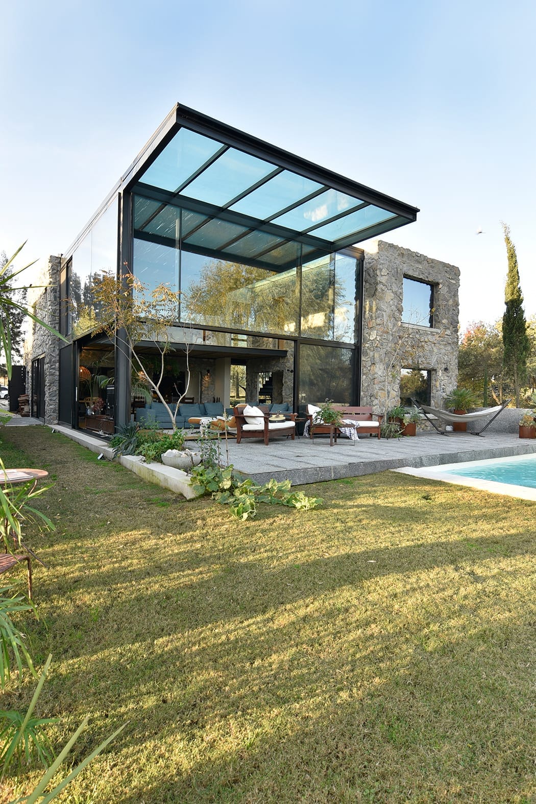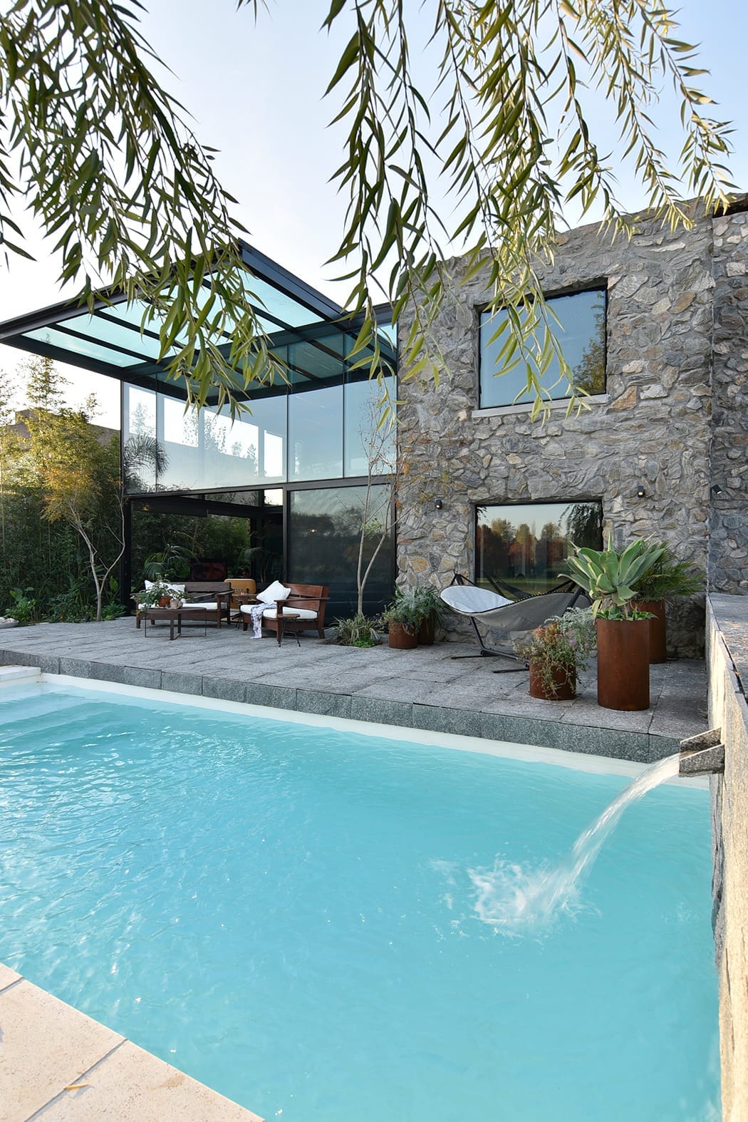 La vivienda fue proyectada para una familia que, en vez de actualizar una antigua casa de piedra o masía optó por tomar lo mejor de esa tradición y aplicarlo en la construcción de una casa nueva que se adaptara completamente a sus necesidades. El piso del deck es de losas de piedra de granito flameado. Se tomó, además, la decisión de rodear un par de lados de pileta con pastos altos. Ablandan los bordes y crean un marco tupido para el agua.