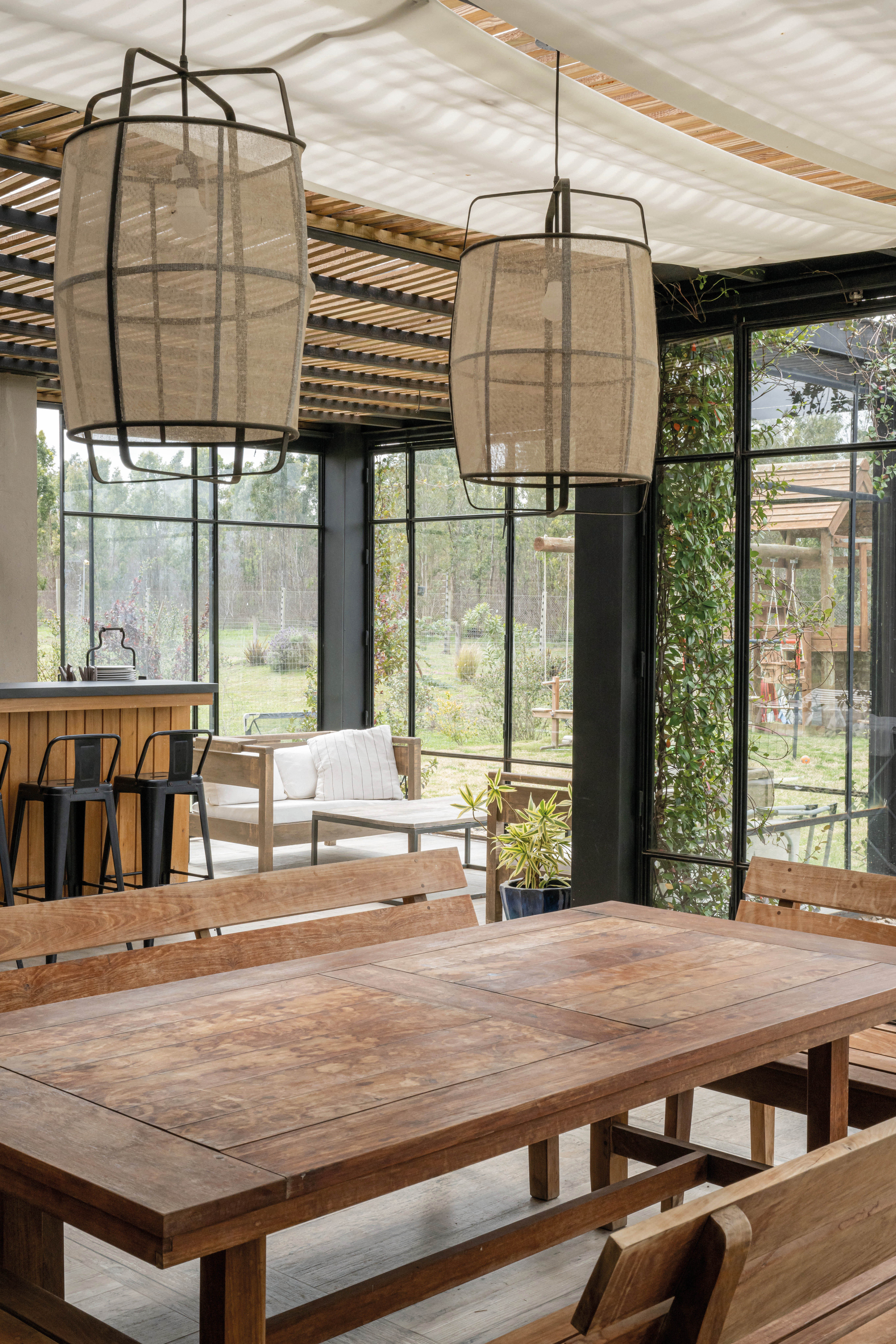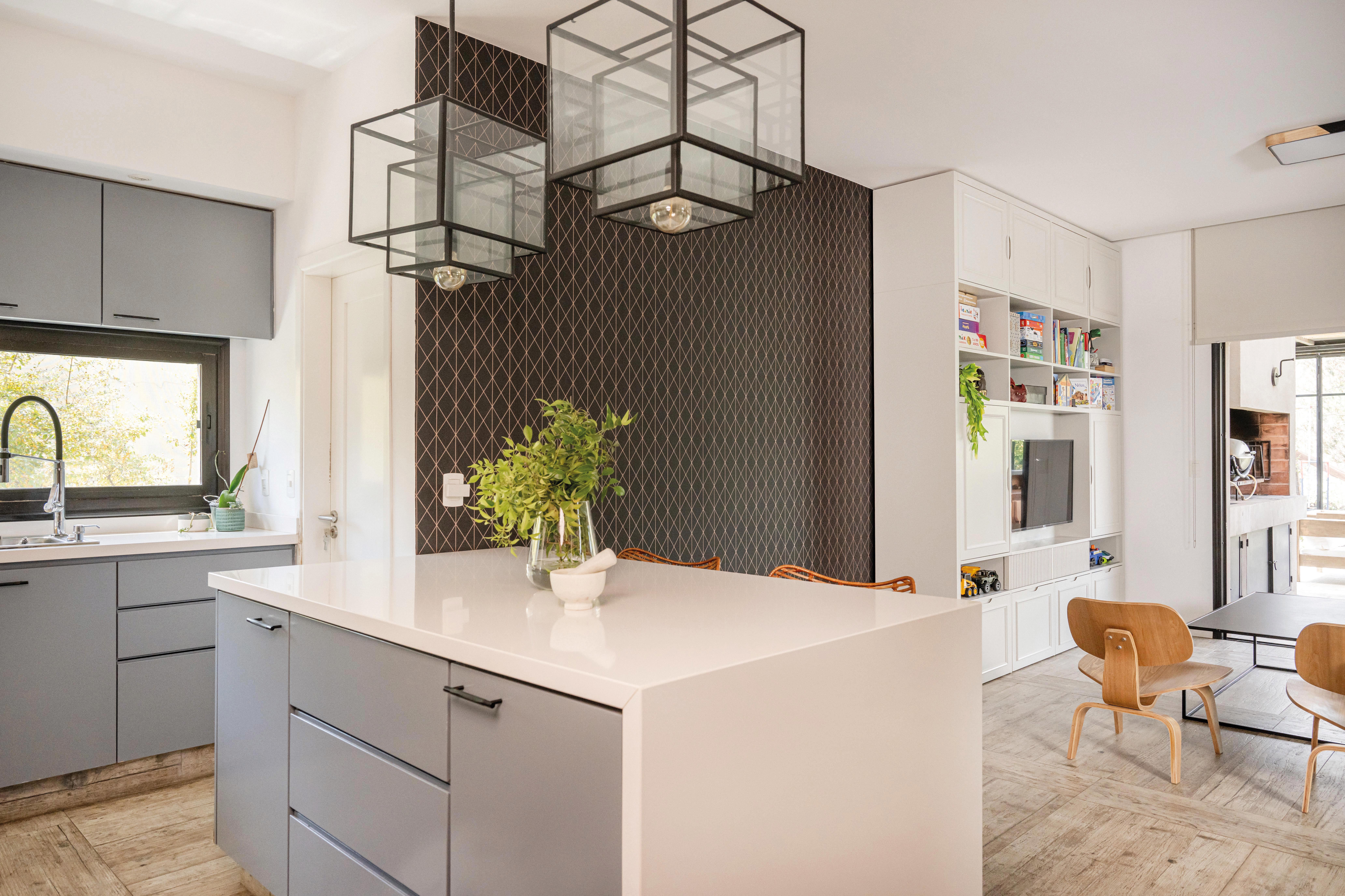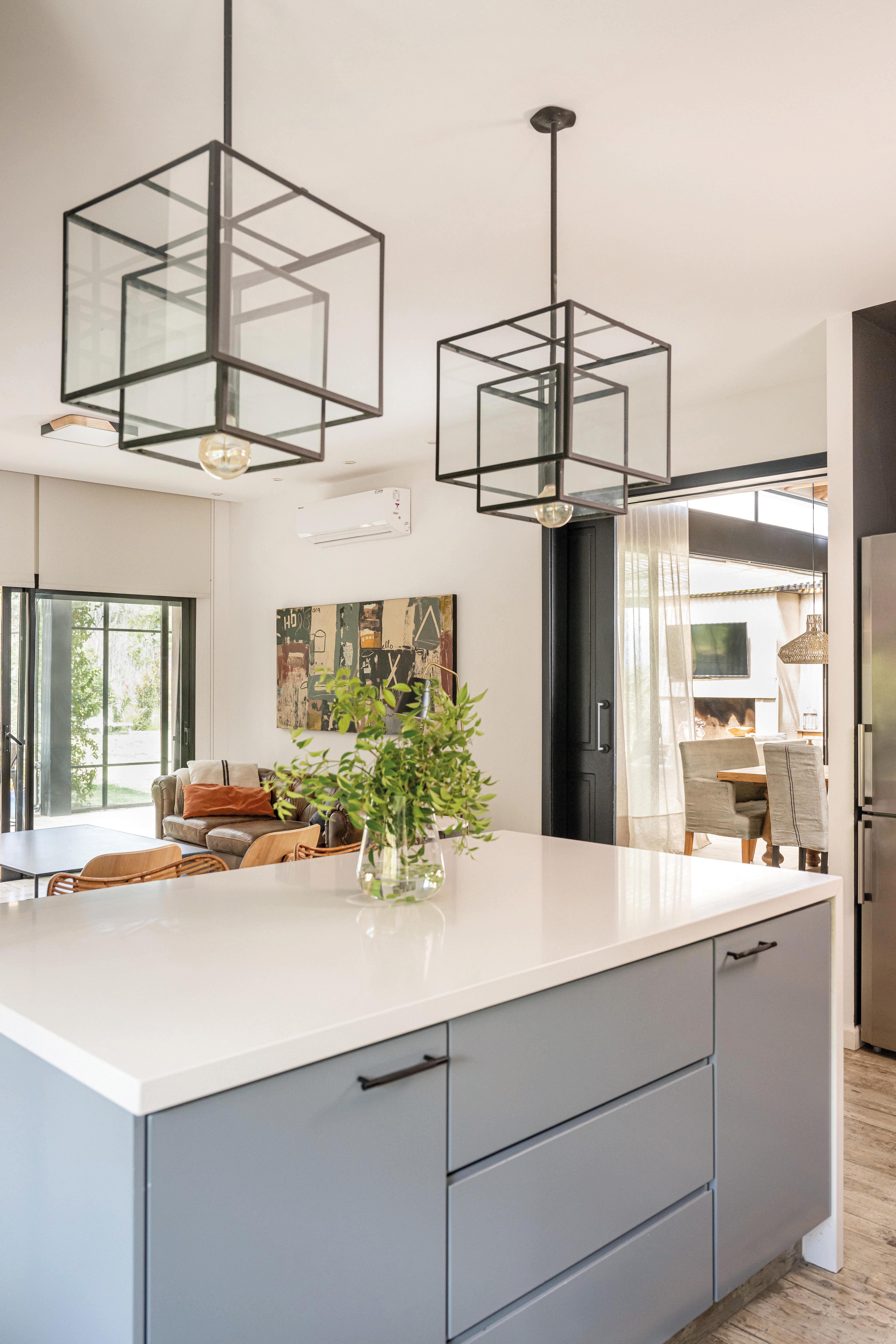 El acceso principal, estratégicamente ubicado, divide la vivienda en dos alas: una destinada a los espacios sociales y otra a los privados. El salón principal, que integra el estar y el comedor, se abre hacia el jardín interior a través de grandes ventanales corredizos, creando una conexión visual y espacial que invita a la relajación y el disfrute. La cocina, diseñada como un espacio funcional y acogedor, se convierte en el epicentro de la vida familiar. La elección de materiales nobles y la integración de electrodomésticos de última generación hacen de este ambiente un lugar práctico y estéticamente agradable. El jardín interior, protegido por una estructura de hierro que evoca una pérgola o un patio inglés, se convierte en un espacio versátil que puede disfrutarse durante todo el año. La barbacoa, integrada al jardín, permite organizar reuniones al aire libre y disfrutar de momentos de convivencia.