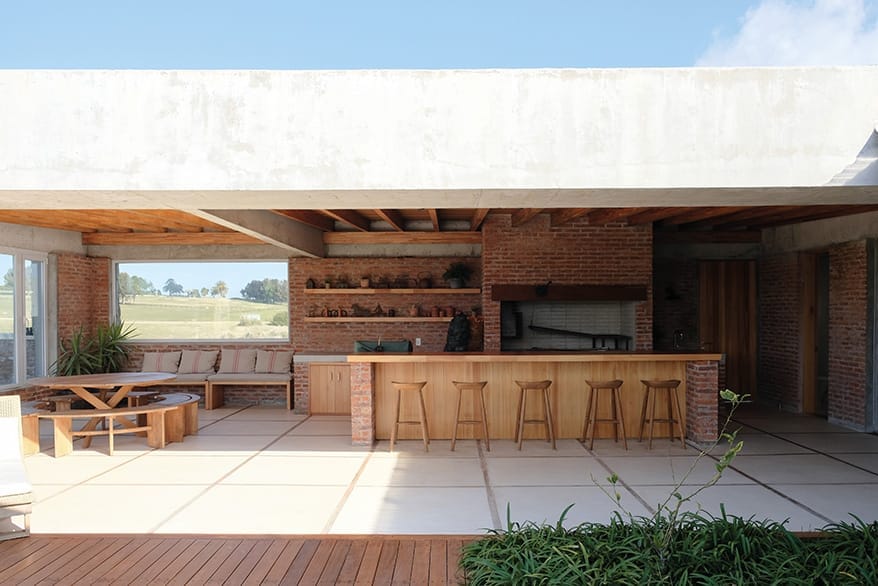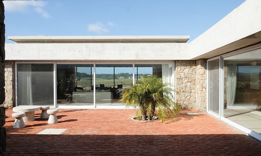Los muros portantes de ladrillo forman la base estructural de la casa. En los exteriores, los muros se presentan como un doble muro de piedra granítica de cerro o ladrillo visto con junta enrasada, aportando solidez y una estética rústica y elegante.
