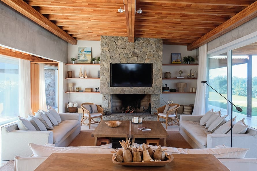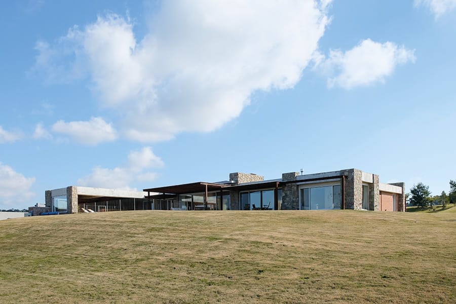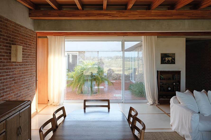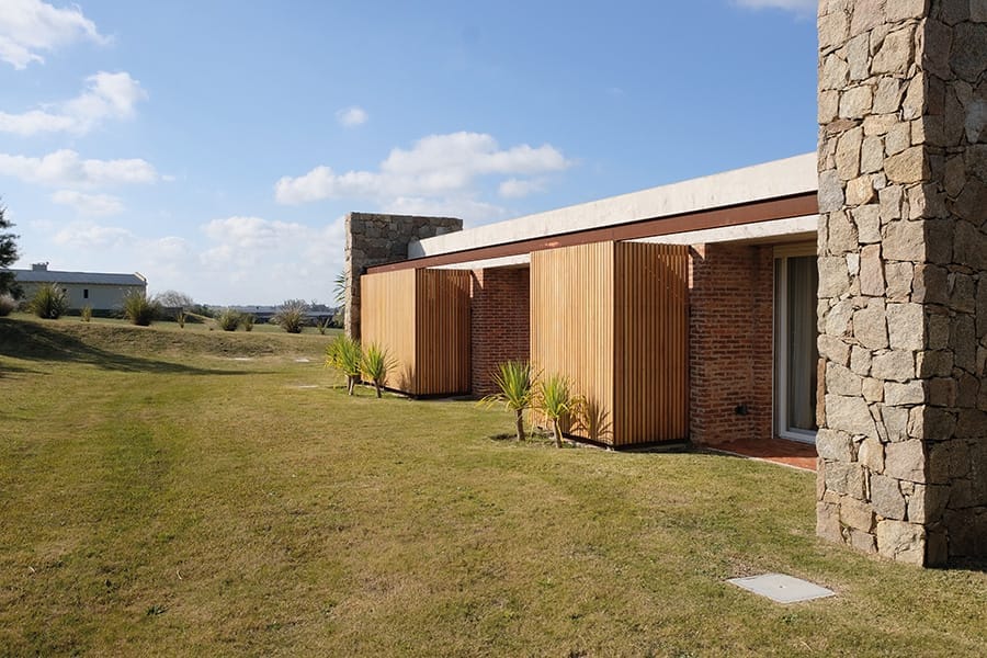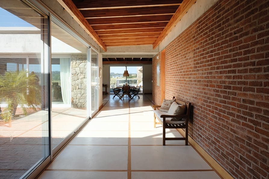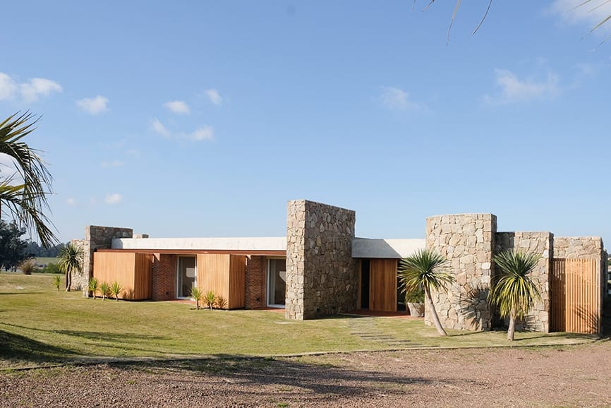 Los muros portantes de ladrillo forman la base estructural de la casa. En los exteriores, los muros se presentan como un doble muro de piedra granítica de cerro o ladrillo visto con junta enrasada, aportando solidez y una estética rústica y elegante.