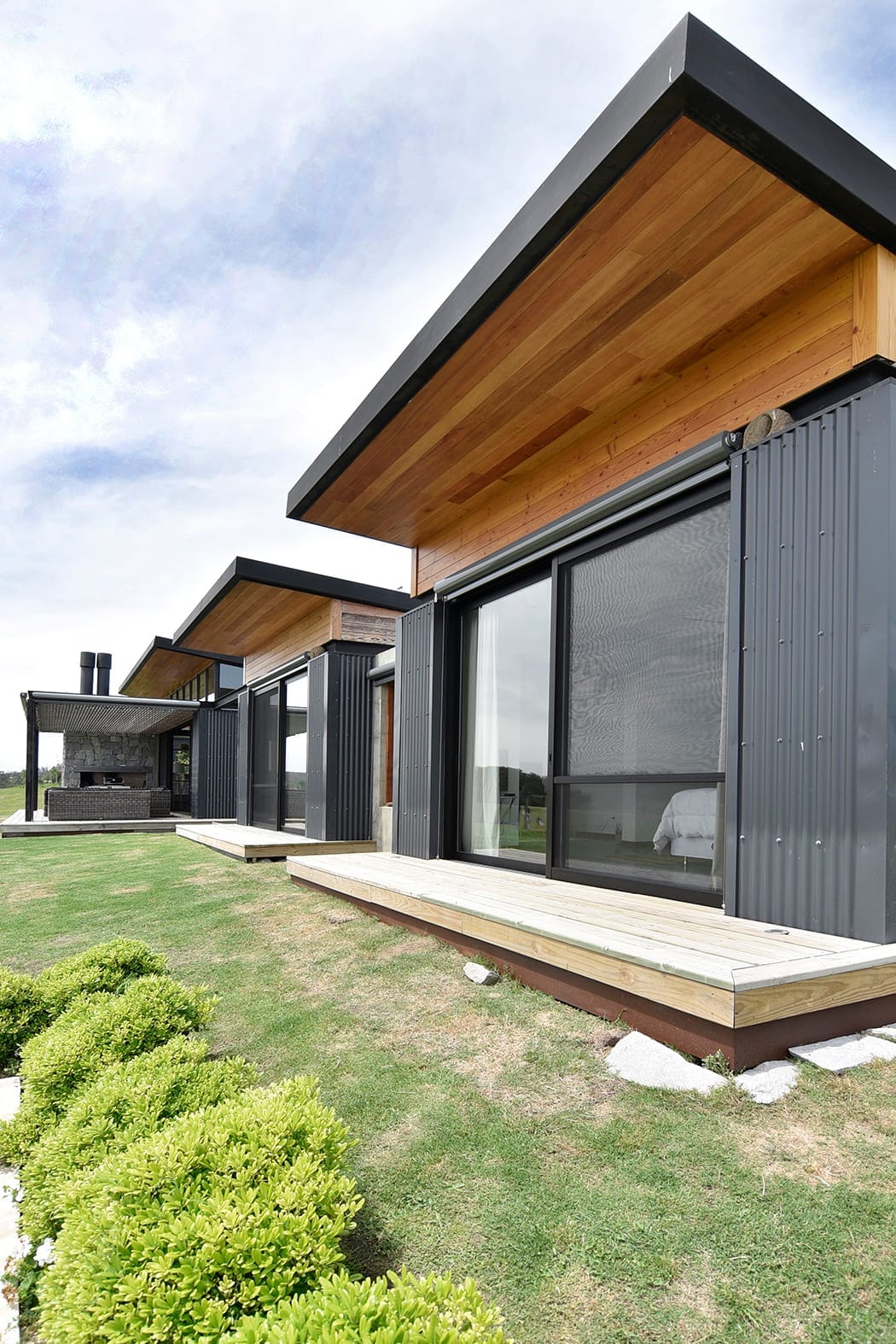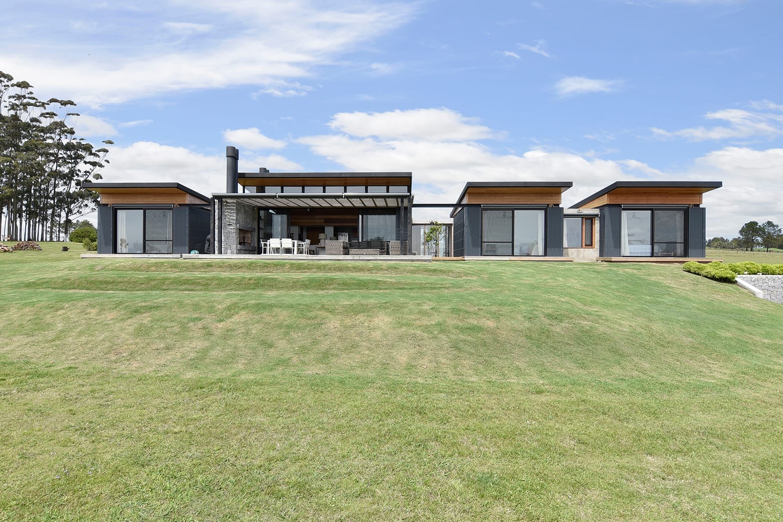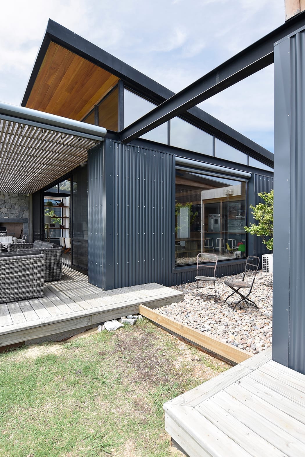 La fachada norte, donde se encuentran las mejores vistas y la mayor exposición al sol, se presenta abierta y luminosa, utilizando materiales ligeros como chapa ondulada y madera para revestir las paredes exteriores, junto con vidrio. En contraste, la fachada sur se muestra más introvertida, mirando hacia la calle y se caracteriza por el uso de piedra, lo que reduce el mantenimiento y protege de los vientos predominantes.