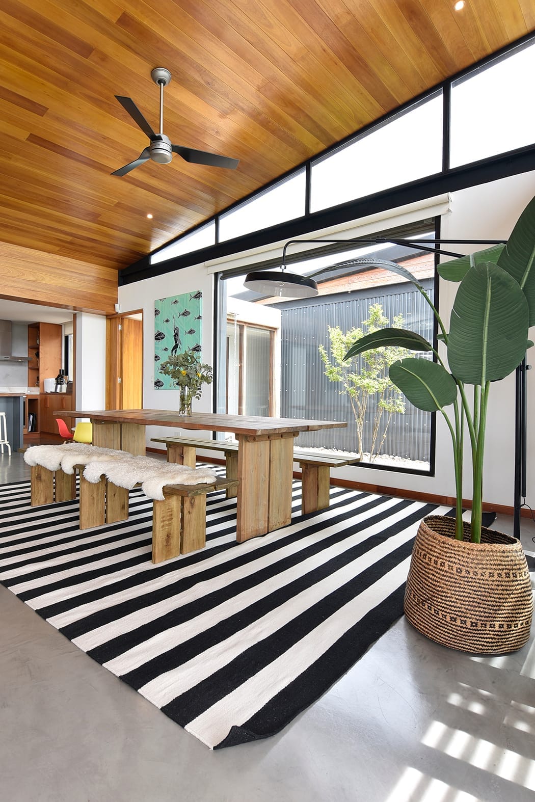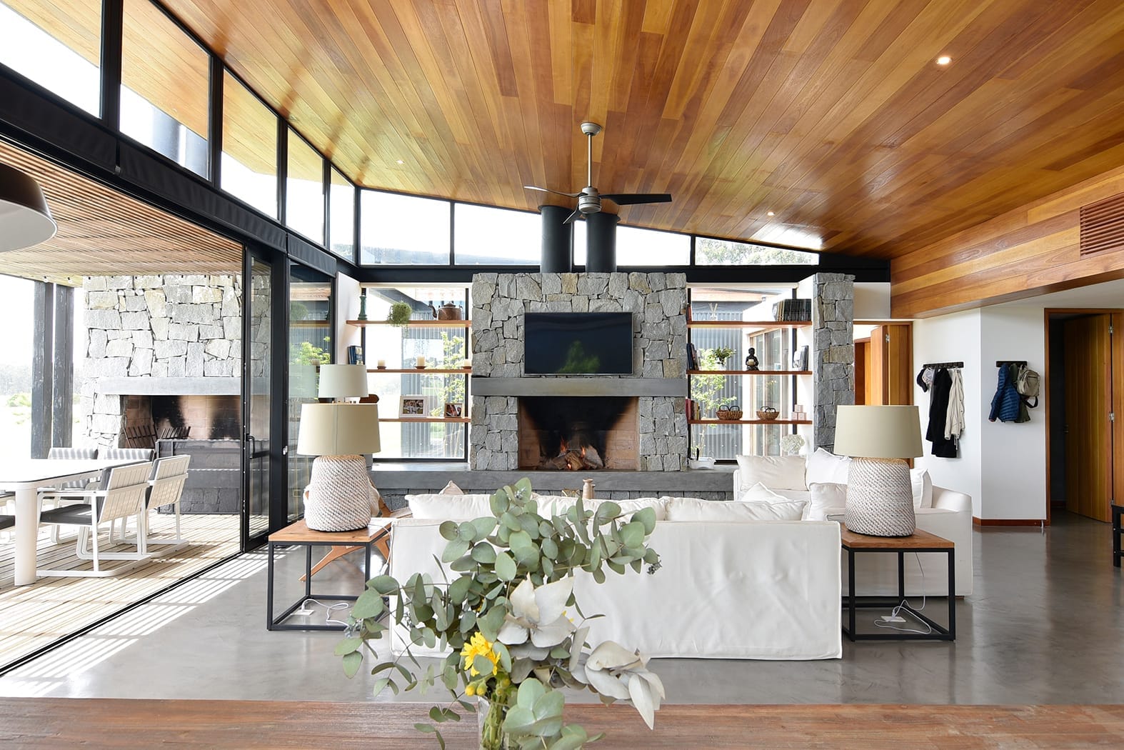Una de estas alas alberga un dormitorio en suite con vestidor, mientras que la otra cuenta con dos dormitorios también en suite y un espacio destinado a un escritorio. La disposición de la vivienda se ha diseñado para fomentar la interacción y el compartir, al mismo tiempo que se respetan los espacios íntimos de la vida cotidiana.