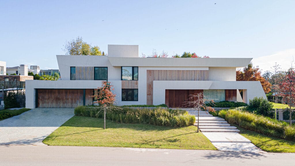 La asimetría en el tratamiento de la fachada, con el acceso ubicado en divina proporción establece el sello del autor que encuentra en las líneas rectas y la insinuación de la base piramidal la forma de materializar el carácter de templo que asigna a sus casas. El proyecto del Arquitecto Diego Algorta Carrau es rico en señales que rescatan la esencia del programa.