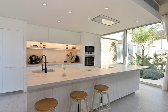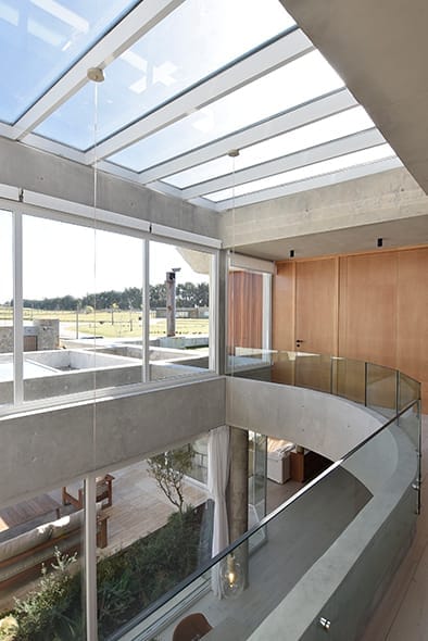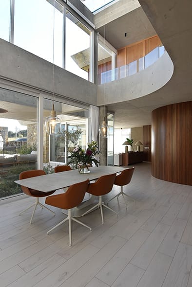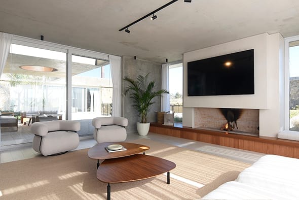 El acceso principal de la casa, ubicado siguiendo la proporción áurea, establece una primera impresión poderosa y armoniosa. La fachada principal, con su geometría rigurosa, se contrapone a una fachada posterior dinámica generando una planta completa en forma de “U”, donde las líneas rectas se enriquecen mediante bandas continuas y grandes losas que se proyectan hacia el jardín. Este diseño no solo crea una conexión visual entre la casa y su entorno natural, sino que también genera espacios semiabiertos que integran la vivienda con la piscina cercana, formando un vasto telón verde que enmarca la propiedad.
