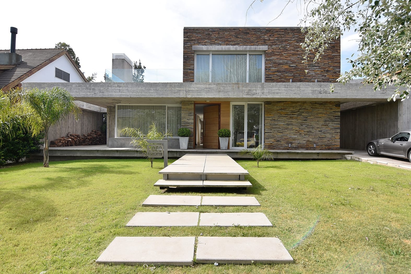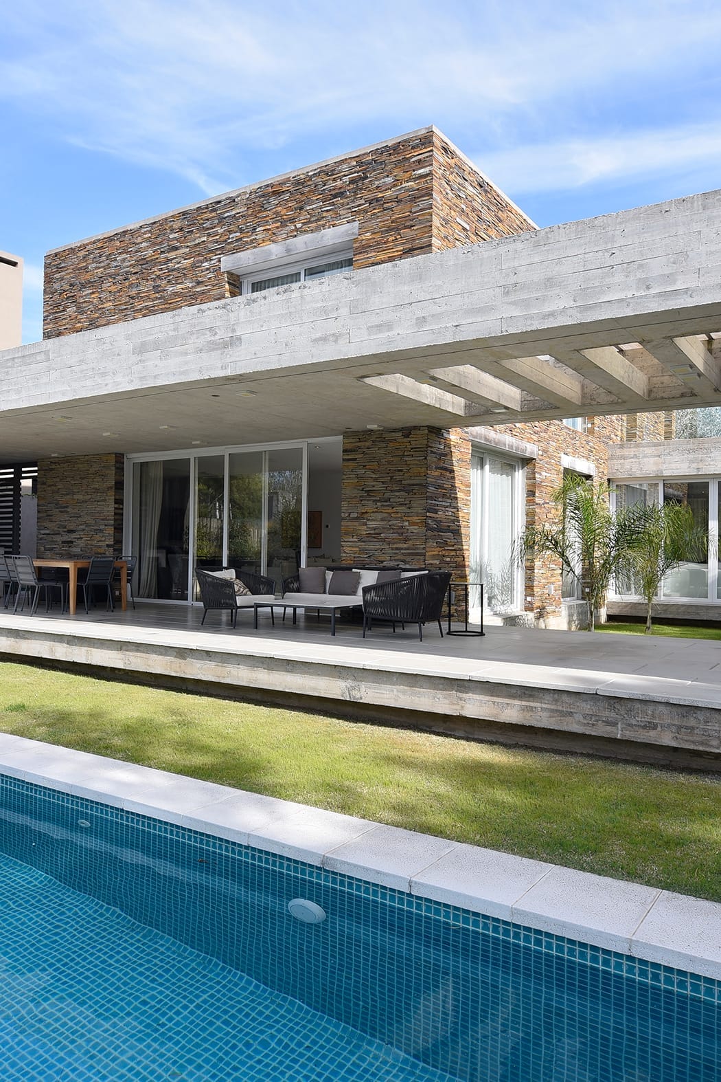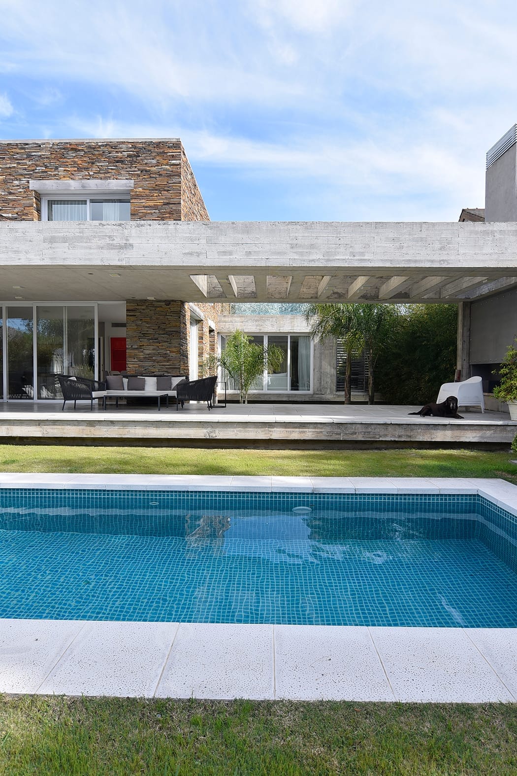 El diseño de esta casa, construida en el Barrio San Nicolás, se materializa en un bloque a modo de cubo concebido como un sólido volumen revestido en piedra caliza y un gran pórtico de hormigón a la vista que lo abraza. La materialidad que se corporiza en el revestimiento exterior genera una referencia estética distintiva y a la vez agrega otro dato, la sensación de vigor estructural y robustez que surge del entrelazamiento de piedras en distintos tamaños. La sencillez de esta técnica y su capacidad para proporcionar resultados eficientes y duraderos, nos cuentan mucho acerca de la esencia de este proyecto.