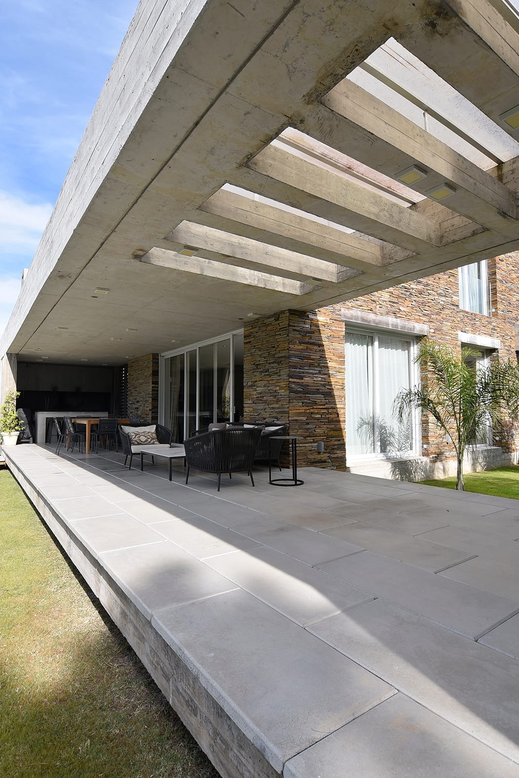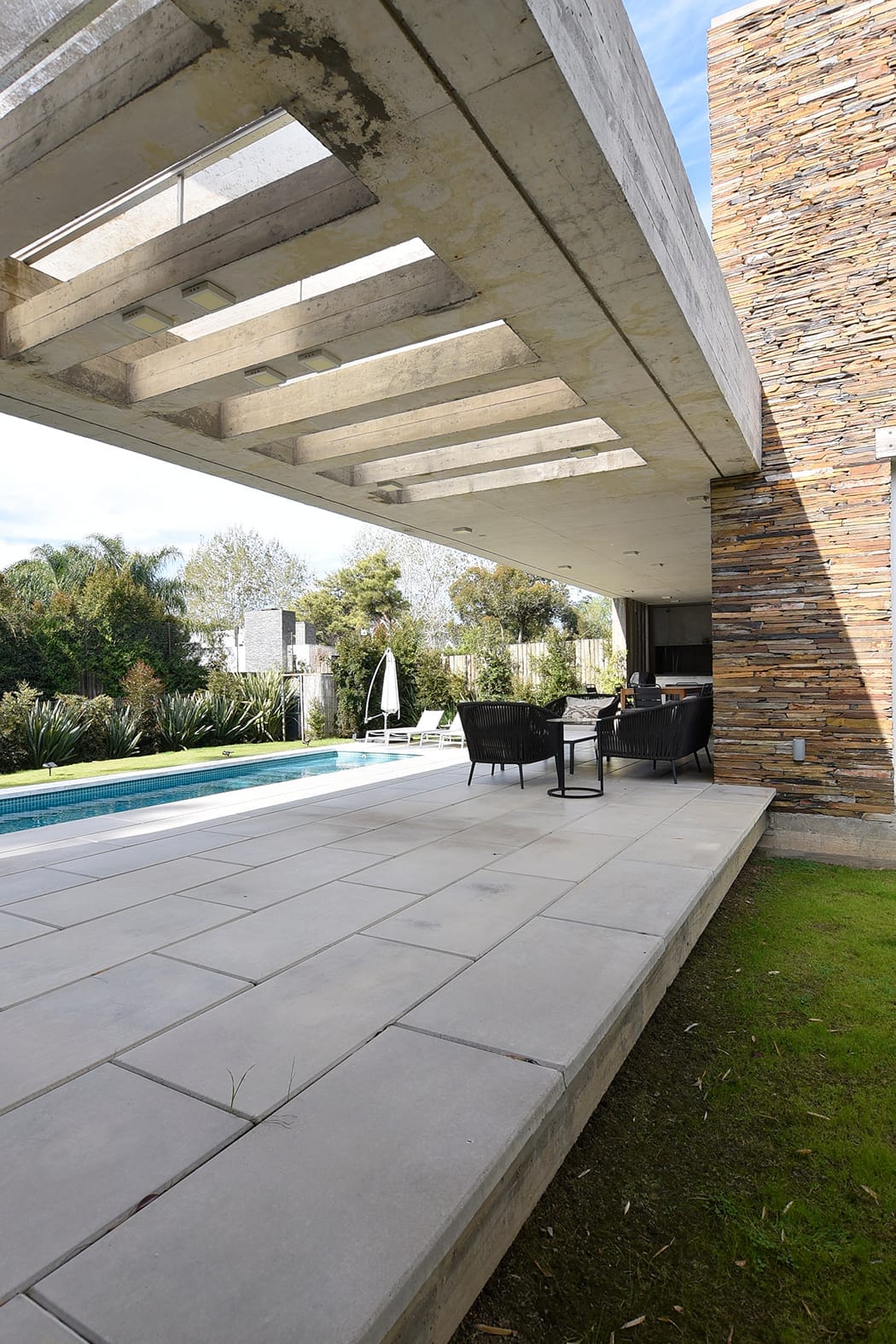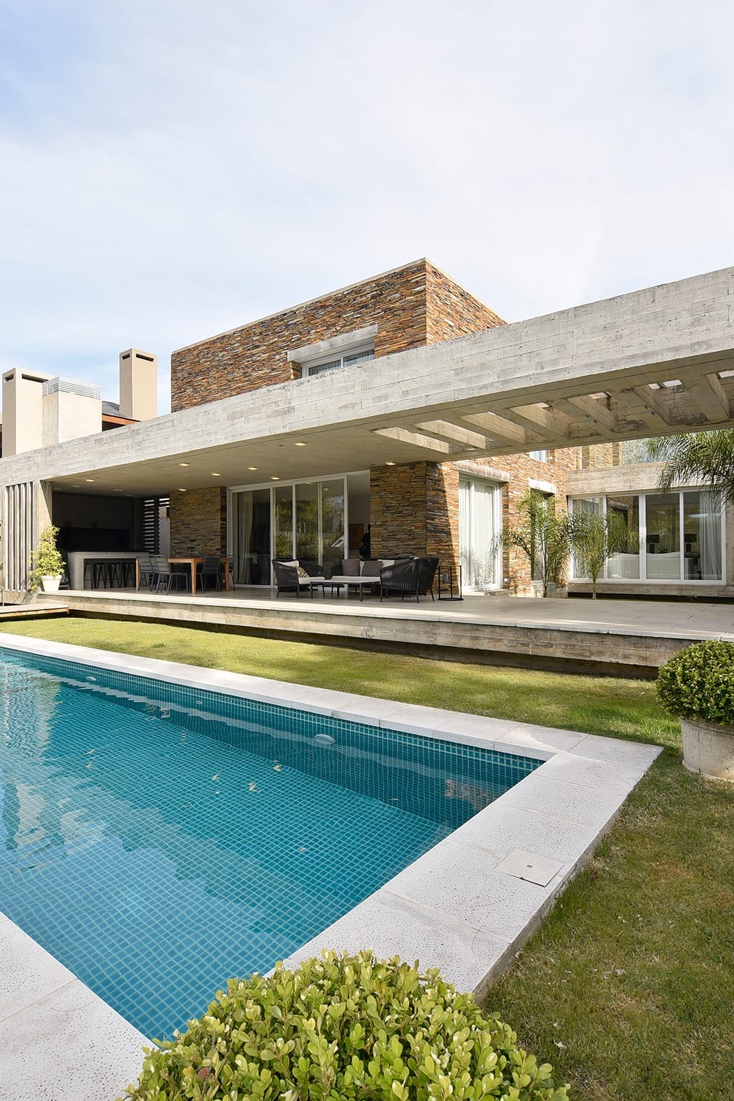 El diseño de esta casa, construida en el Barrio San Nicolás, se materializa en un bloque a modo de cubo concebido como un sólido volumen revestido en piedra caliza y un gran pórtico de hormigón a la vista que lo abraza. La materialidad que se corporiza en el revestimiento exterior genera una referencia estética distintiva y a la vez agrega otro dato, la sensación de vigor estructural y robustez que surge del entrelazamiento de piedras en distintos tamaños. La sencillez de esta técnica y su capacidad para proporcionar resultados eficientes y duraderos, nos cuentan mucho acerca de la esencia de este proyecto.