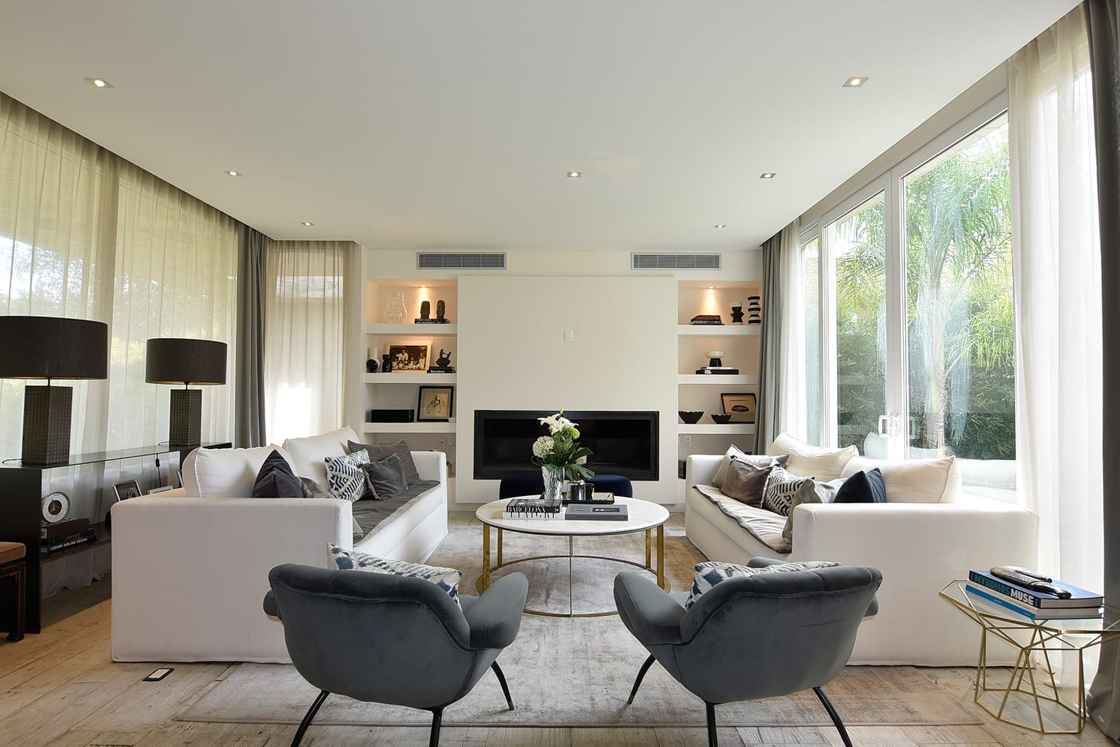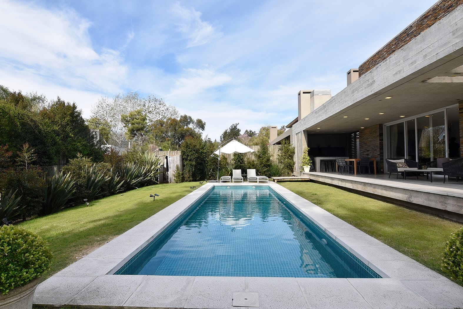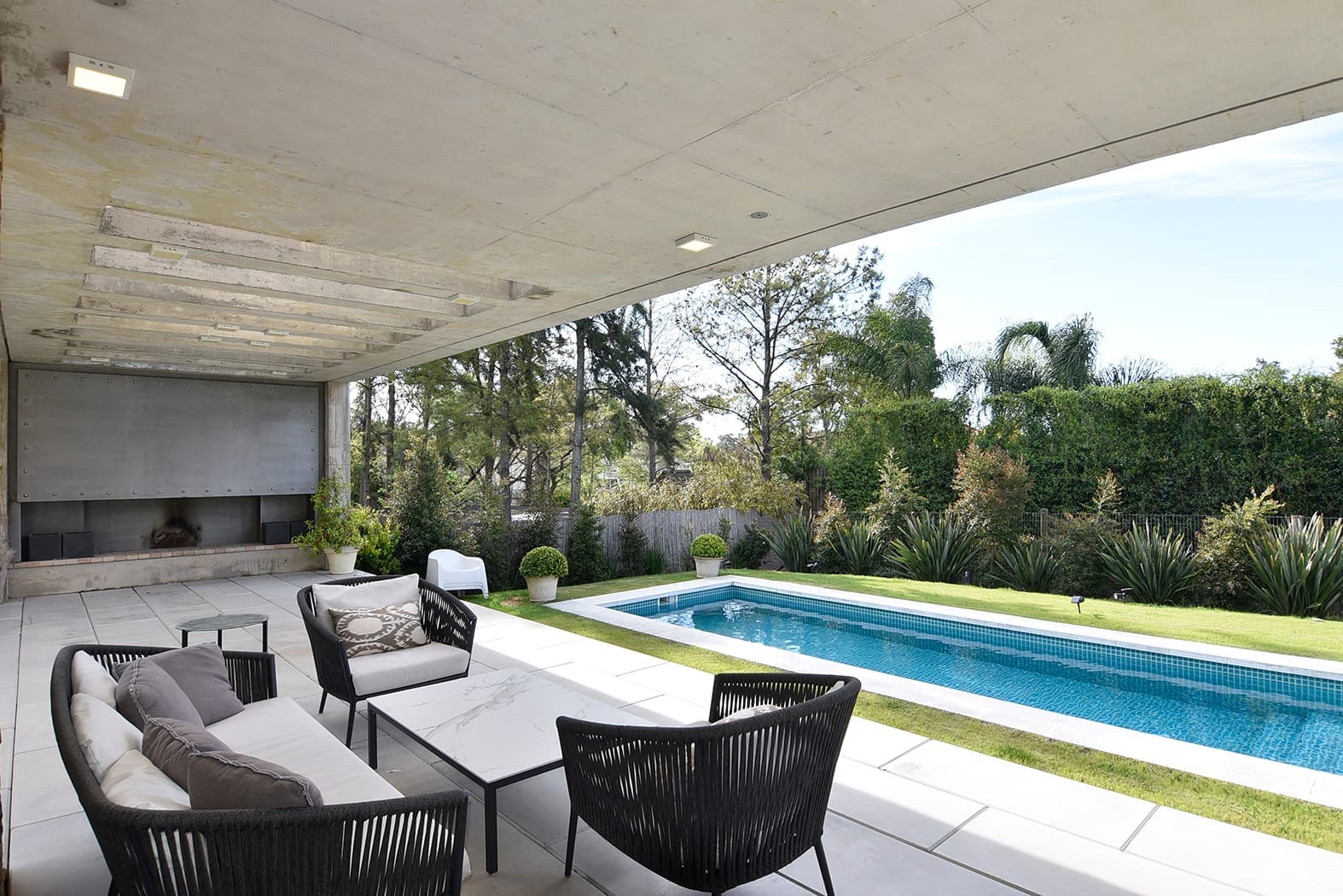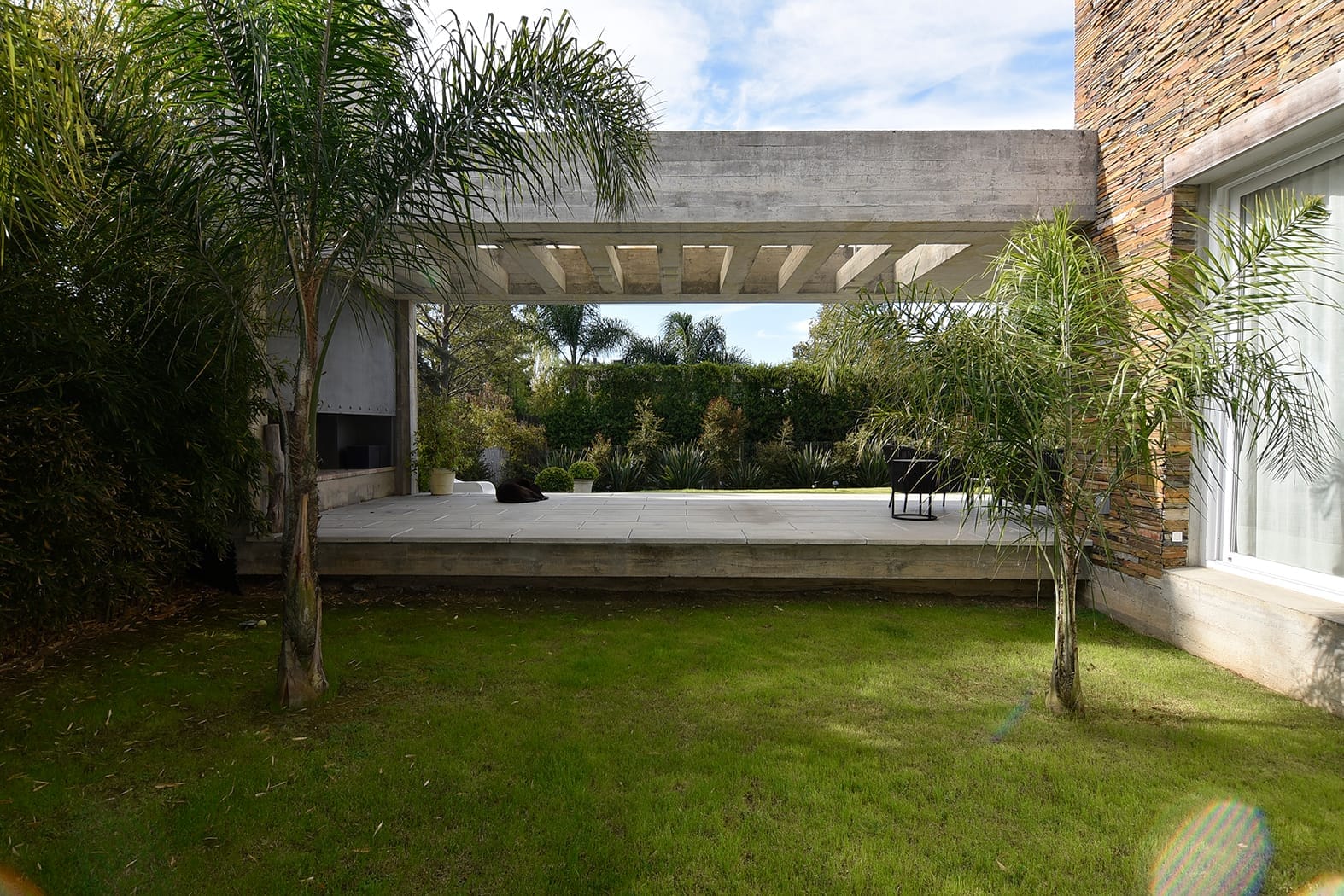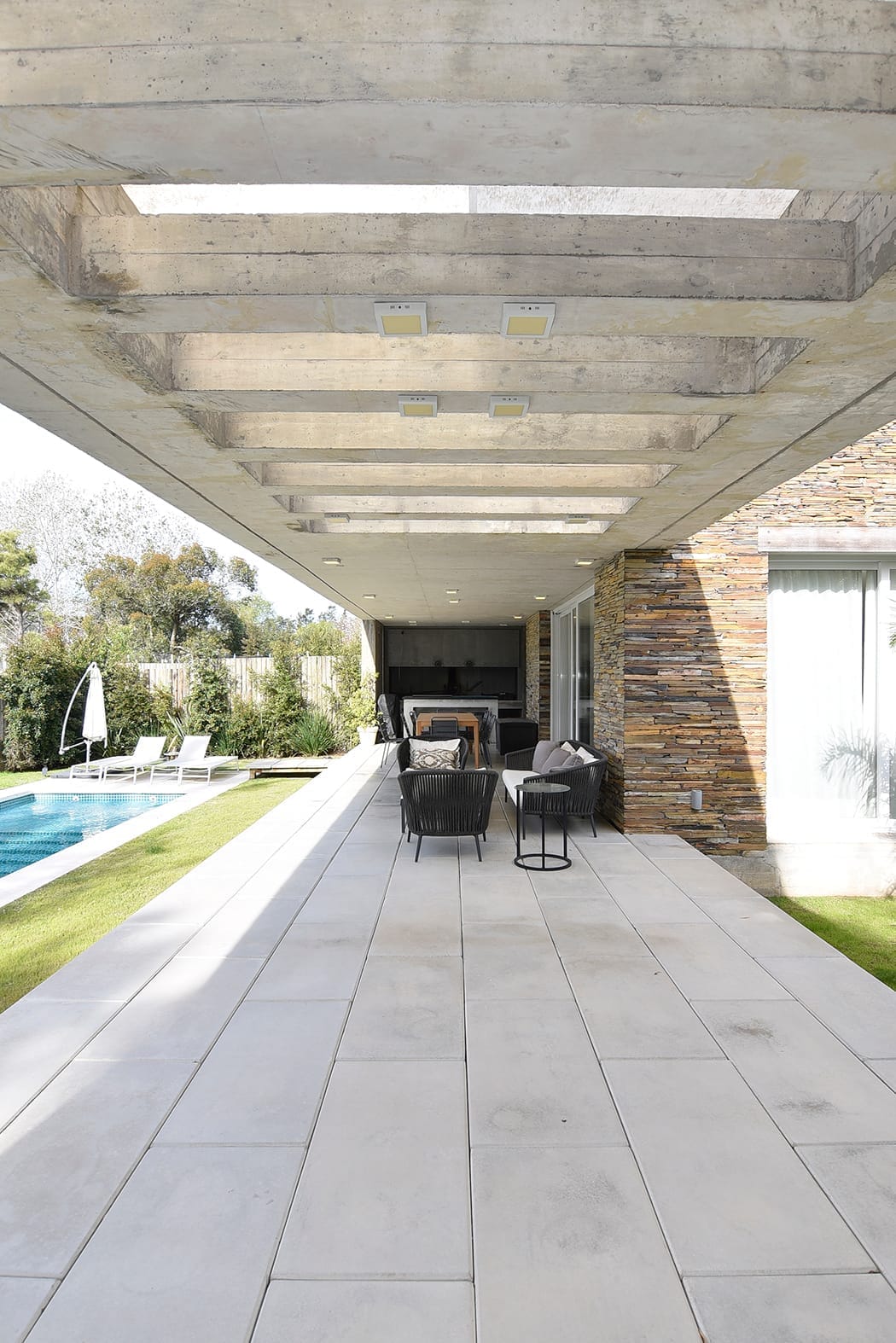 El volumen, cuidadosamente diseñado, alberga en sus dos plantas la estructura y una distribución de orden clásico. Un gran arco rectangular y adintelado abraza la casa desde la fachada frontal hacia la posterior, atravesando una serie de suaves pérgolas de hormigón. Este diseño crea nueva espacialidad generando ambientes lineales en el exterior.