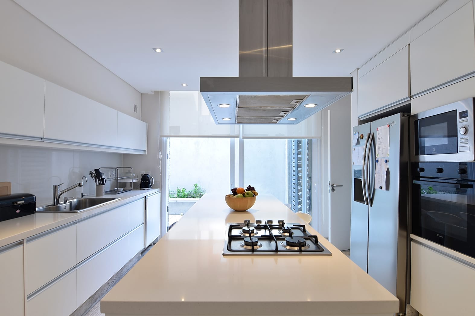 La distribución interna de la casa fue concebida con comodidad y amplitud como premisas fundamentales. La planta baja se caracteriza por su generosidad de espacios de uso común, con una cocina definida y zonas de convivencia que se integran de manera fluida hacia el exterior a través de amplias aberturas que se integran perfectamente en la estructura. Los colores y texturas seleccionadas, cálidas y armoniosas, definen los espacios exteriores, creando un entorno agradable que complementa la esencia de la arquitectura.