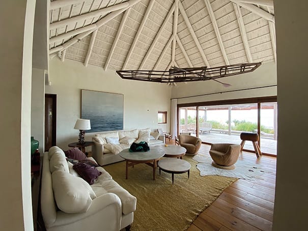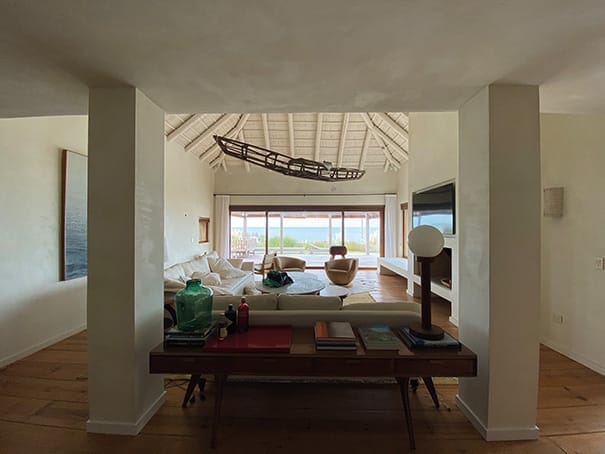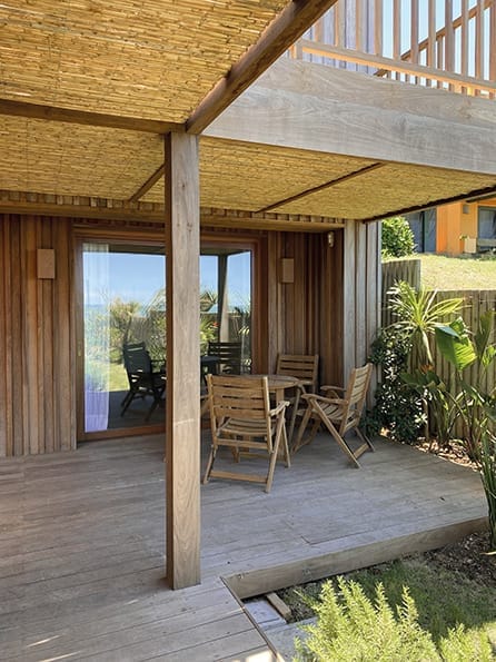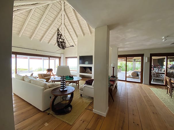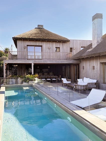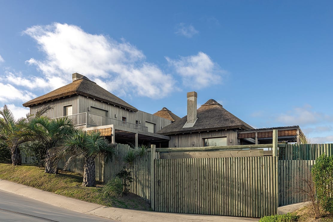 Dirigiéndose hacia la playa, la casa ofrece amplios espacios exteriores que incluyen una zona de parrillero, un comedor al aire libre, y un estar con decks de madera. Estos se extienden hacia un solárium y una piscina que, en un elegante balcón elevado, ofrecen una vista panorámica del océano.