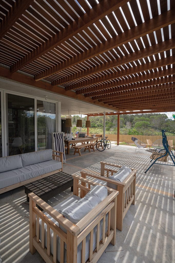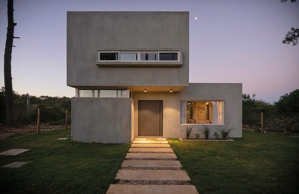 La casa fue diseñada en dos niveles y a partir de un sistema constructivo basado en contenedores, emplacados en su interior con yeso, y en el exterior revestido en madera. El sistema constructivo permitió generar grandes volados sin la necesidad de apoyos. En la planta baja se plantean los espacios comunes, y en la planta alta el sector íntimo.