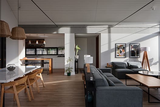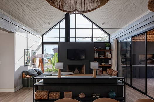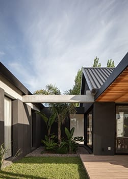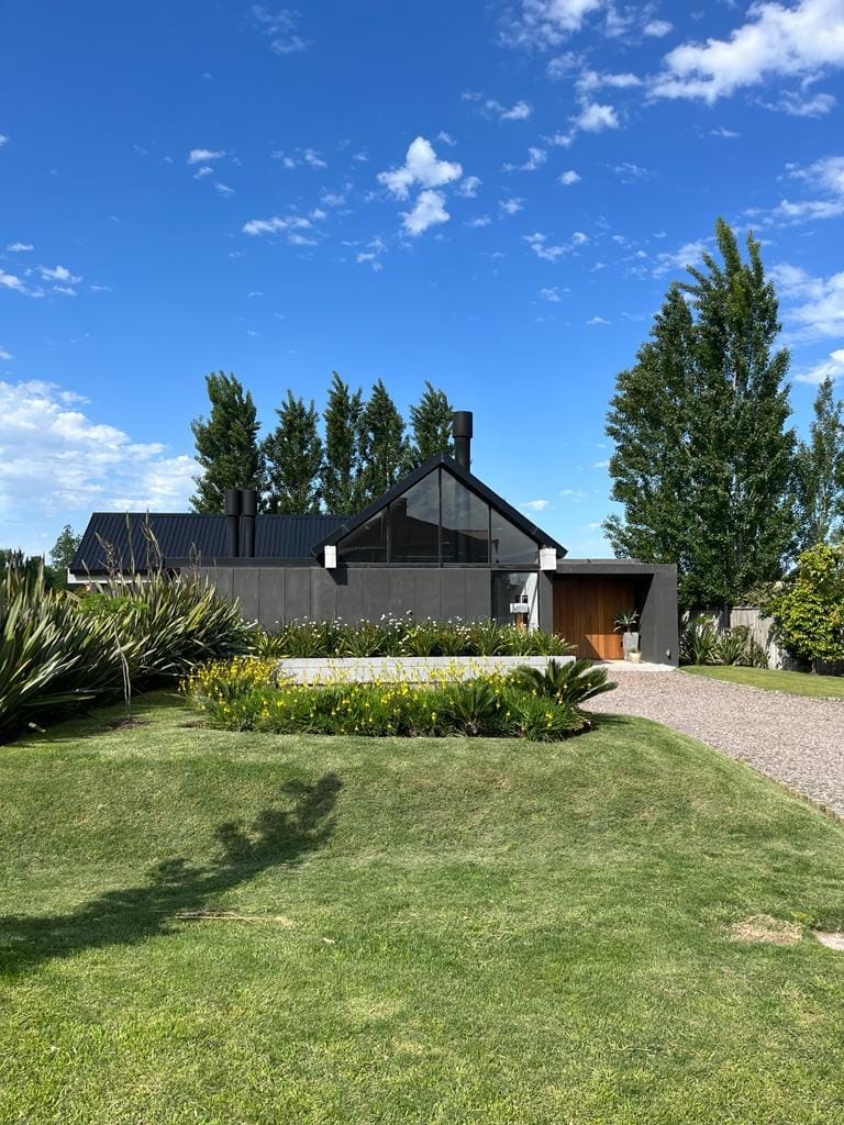 La simplicidad formal del diseño, lejanamente emparentada con el espíritu nórdico, genera un interesante juego de formas geométricas que señalan especialmente el triángulo que genera la cubierta a dos aguas que genera el eje en cruz de la estructura. La economía de materiales enriquece la propuesta asignando un valor conceptual muy definido a la casa. La casa se levanta en uno de los predios de la urbanización Viñedos de La Tahona y entonces la fachada niega al exterior que se reserva para un jardín encantador para el cual la fachada cerrada de la casa es un telón singular. Los espacios interiores, abiertos hacia el jardín posterior, resultan especialmente atractivos en el juego de alturas y ángulos que genera la cubierta.