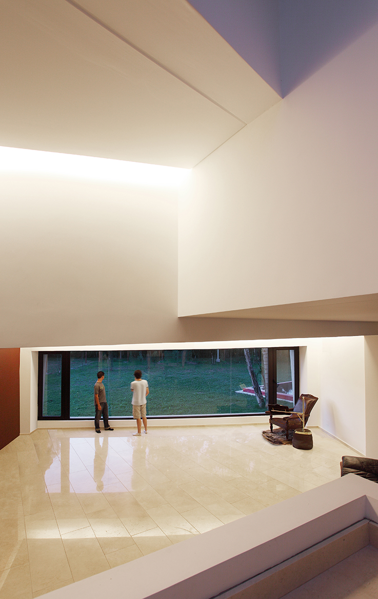 En el piso inferior, la ubicación conveniente de las ventanas de apertura permite un flujo de aire natural que ayuda a disminuir la humedad en la habitación. Además, los grandes umbrales crean una buena distribución de aire fresco. Todo esto, contribuye a la complejidad de la casa, una flor de vidrio y hormigón, diseñada de acuerdo con un programa de necesidades y las preocupaciones del cliente.