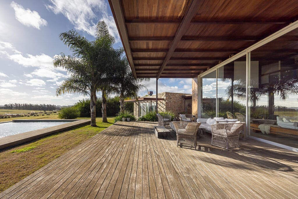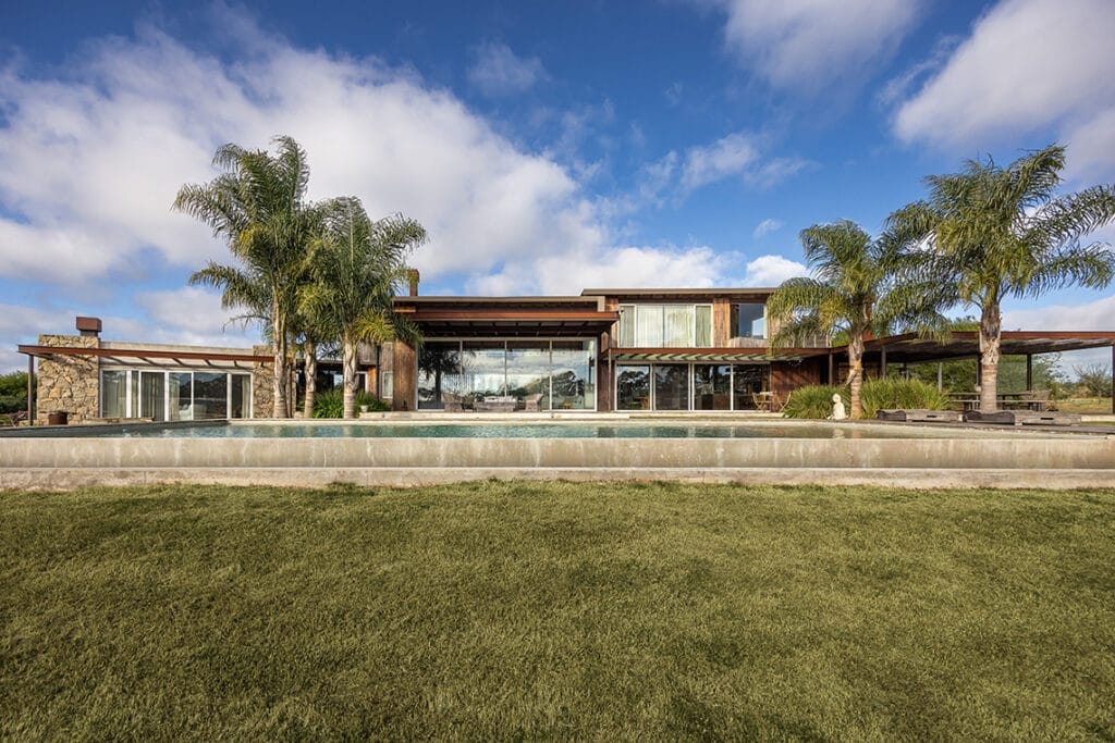 La fachada principal de la casa no solo brinda privacidad, sino que también se despliega de manera rítmica y escultural, exhibiendo una variedad de texturas naturales como la piedra y la madera de Lapacho en su revestimiento. Cada elemento de la fachada contribuye a un diálogo visual que celebra la integración armoniosa de la casa con su entorno.