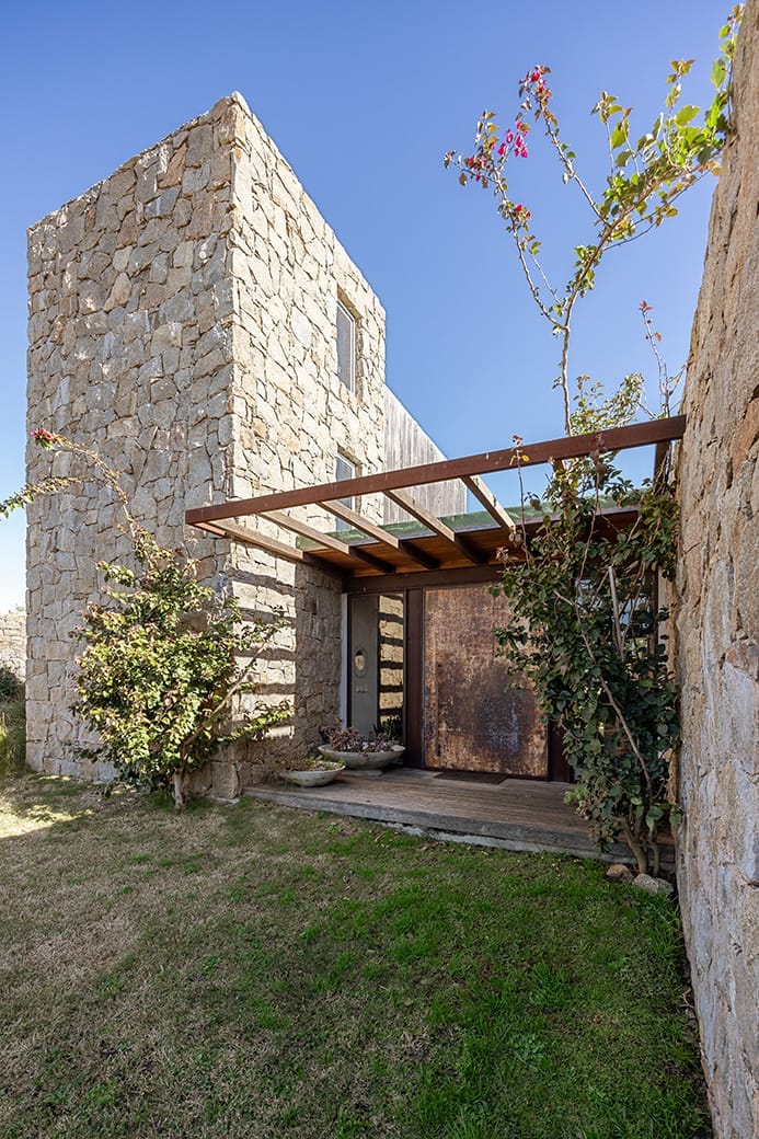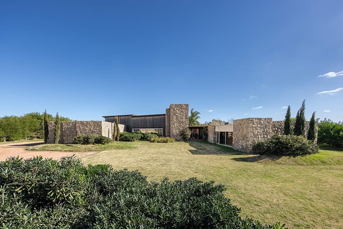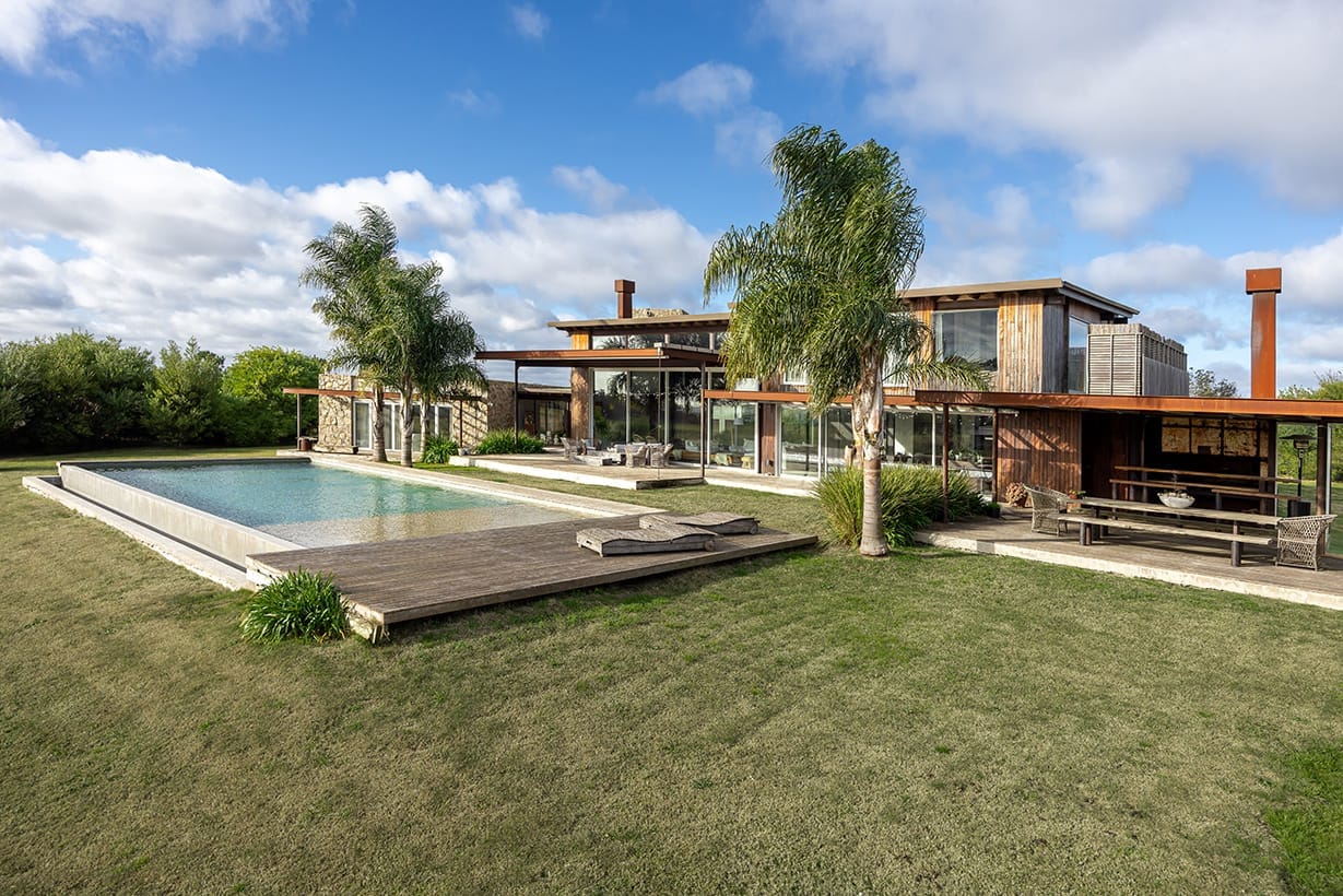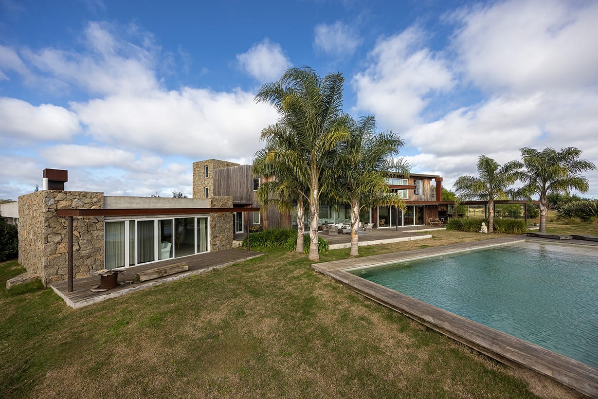 La fachada principal de la casa no solo brinda privacidad, sino que también se despliega de manera rítmica y escultural, exhibiendo una variedad de texturas naturales como la piedra y la madera de Lapacho en su revestimiento. Cada elemento de la fachada contribuye a un diálogo visual que celebra la integración armoniosa de la casa con su entorno.