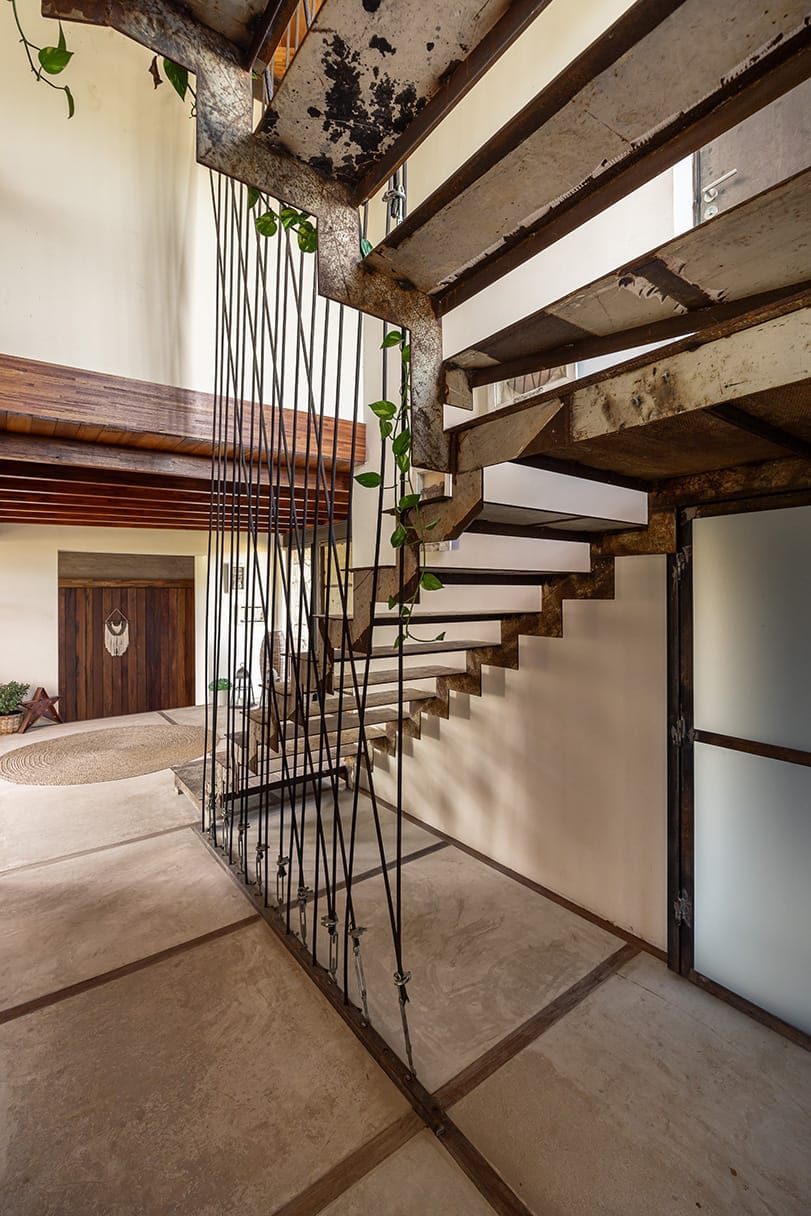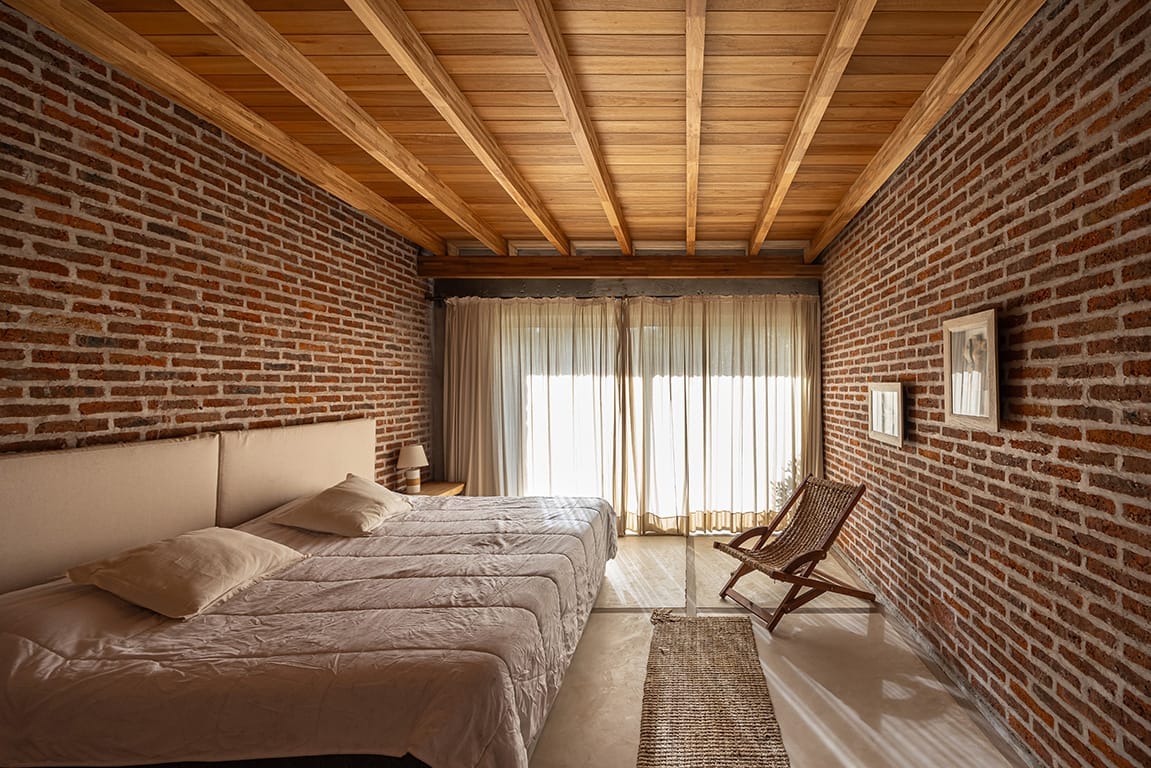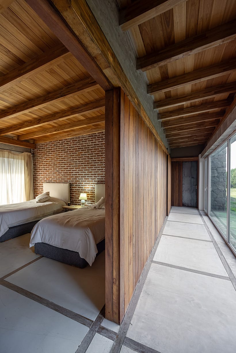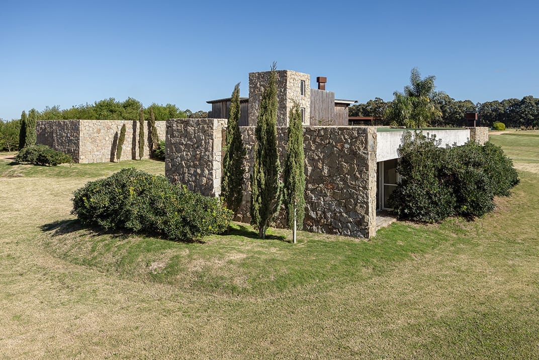 La fachada principal de la casa no solo brinda privacidad, sino que también se despliega de manera rítmica y escultural, exhibiendo una variedad de texturas naturales como la piedra y la madera de Lapacho en su revestimiento. Cada elemento de la fachada contribuye a un diálogo visual que celebra la integración armoniosa de la casa con su entorno.