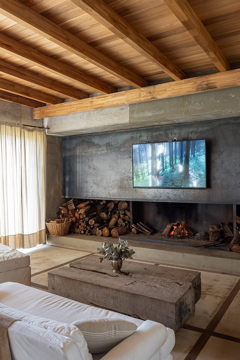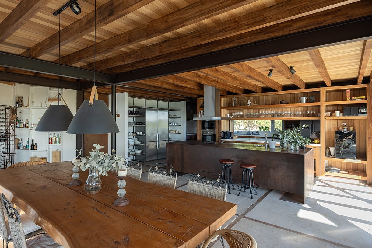 La cocina, con su impresionante isla de acero, se integra cómodamente en el gran espacio, ofreciendo funcionalidad y estilo. En su espalda, se encuentra una cocina oculta que añade un elemento de sorpresa y practicidad. El corazón de la casa es el hogar de acero que actúa como el punto focal y distribuye el espacio de manera eficiente y elegante.