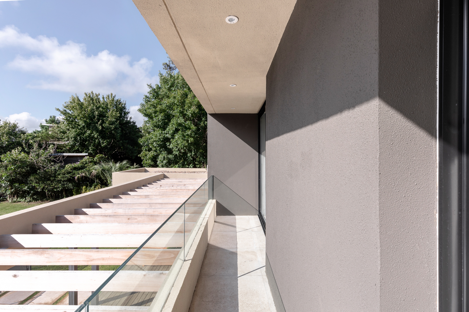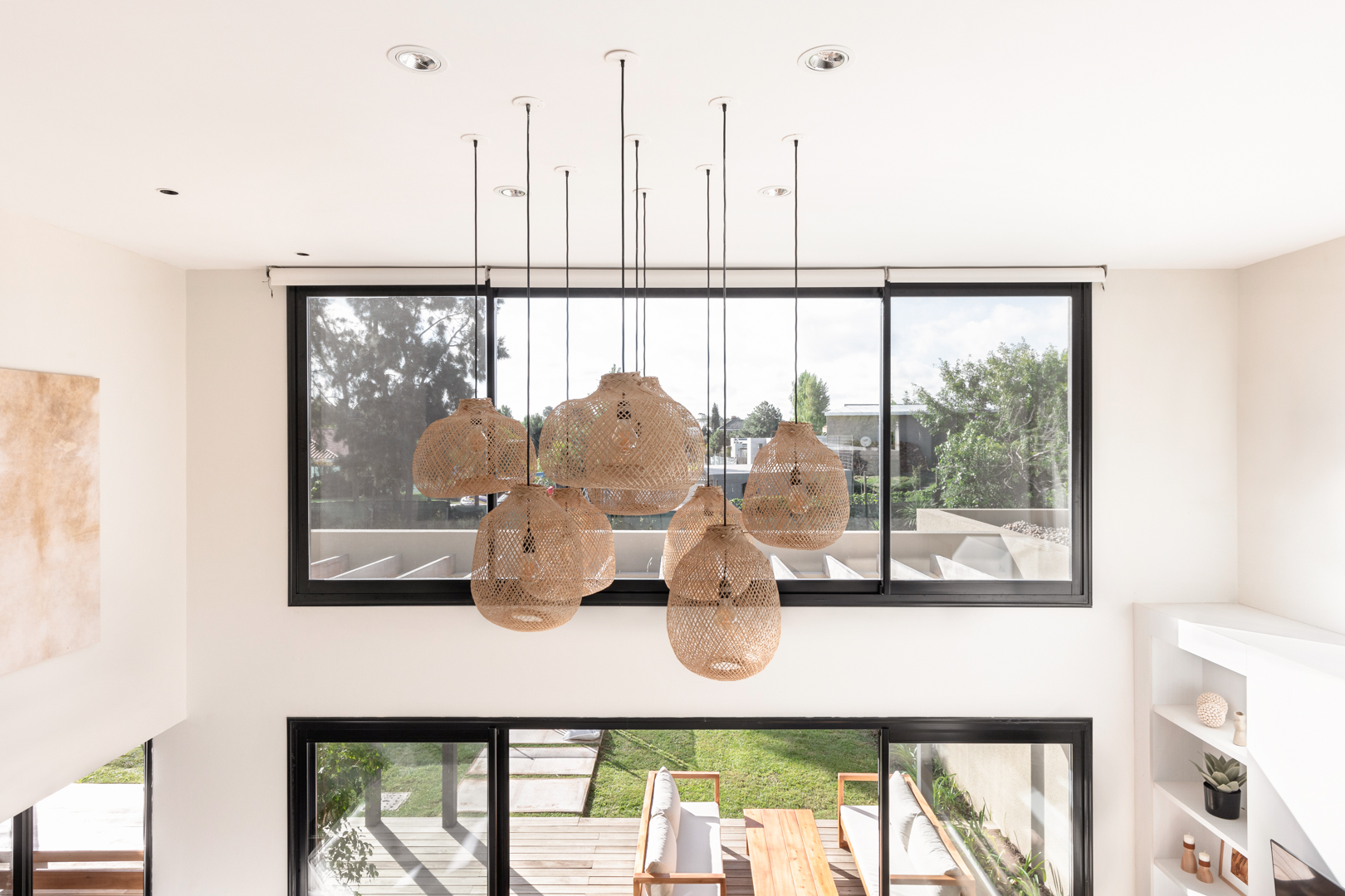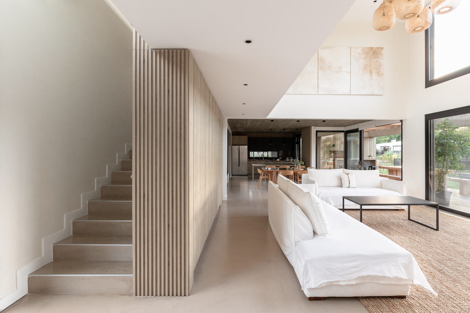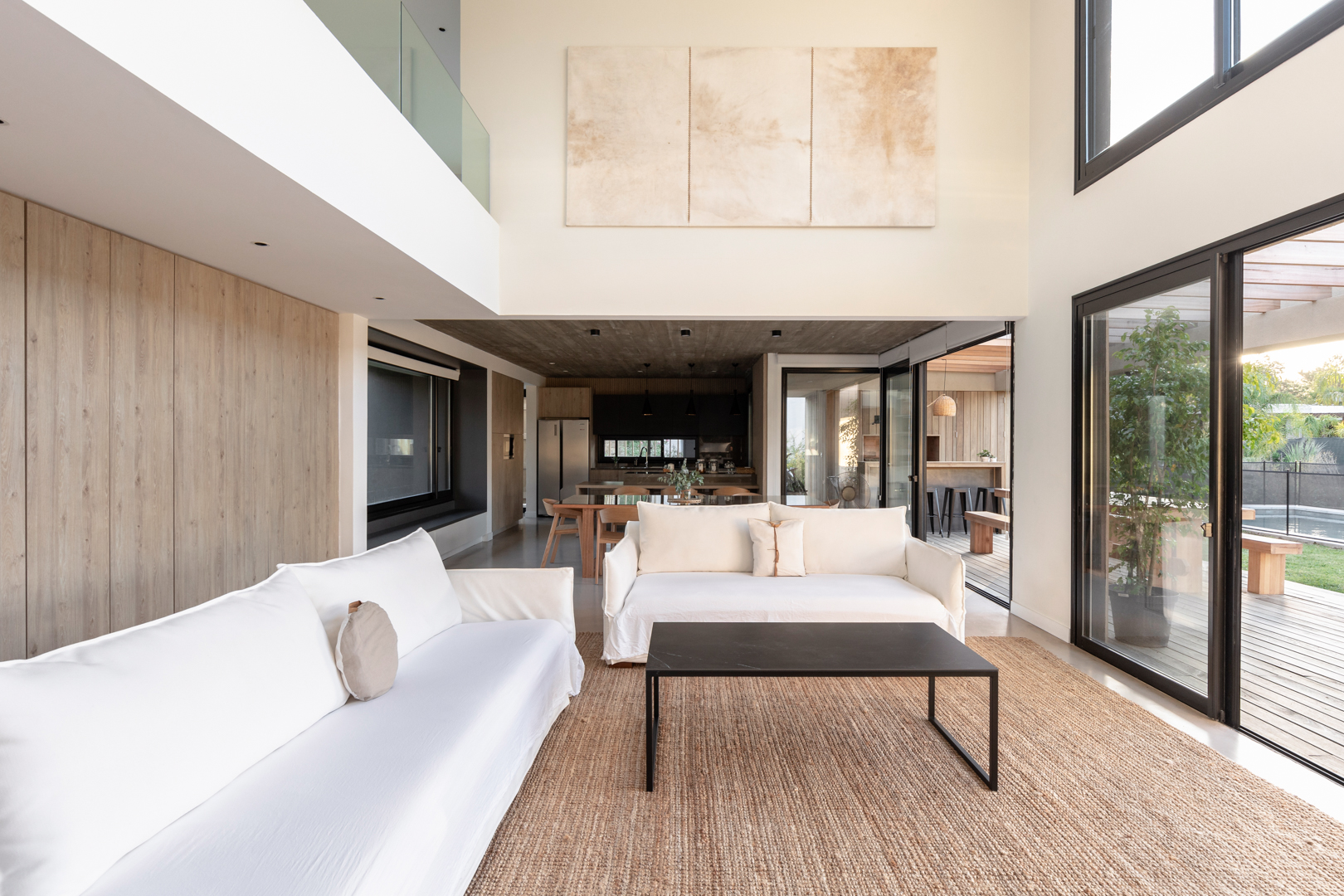 La vida de la casa transcurre alrededor de la doble altura del living que vincula espacialmente varios aspectos: los dos niveles de la vivienda, el área social con la privada y a la vez cada uno de los espacios con el exterior. El puente suspendido entre los dormitorios de la planta alta propicia así la interacción social sin interferir con la privacidad de las áreas de dormitorios. Este multiplica y enriquece las perspectivas internas.