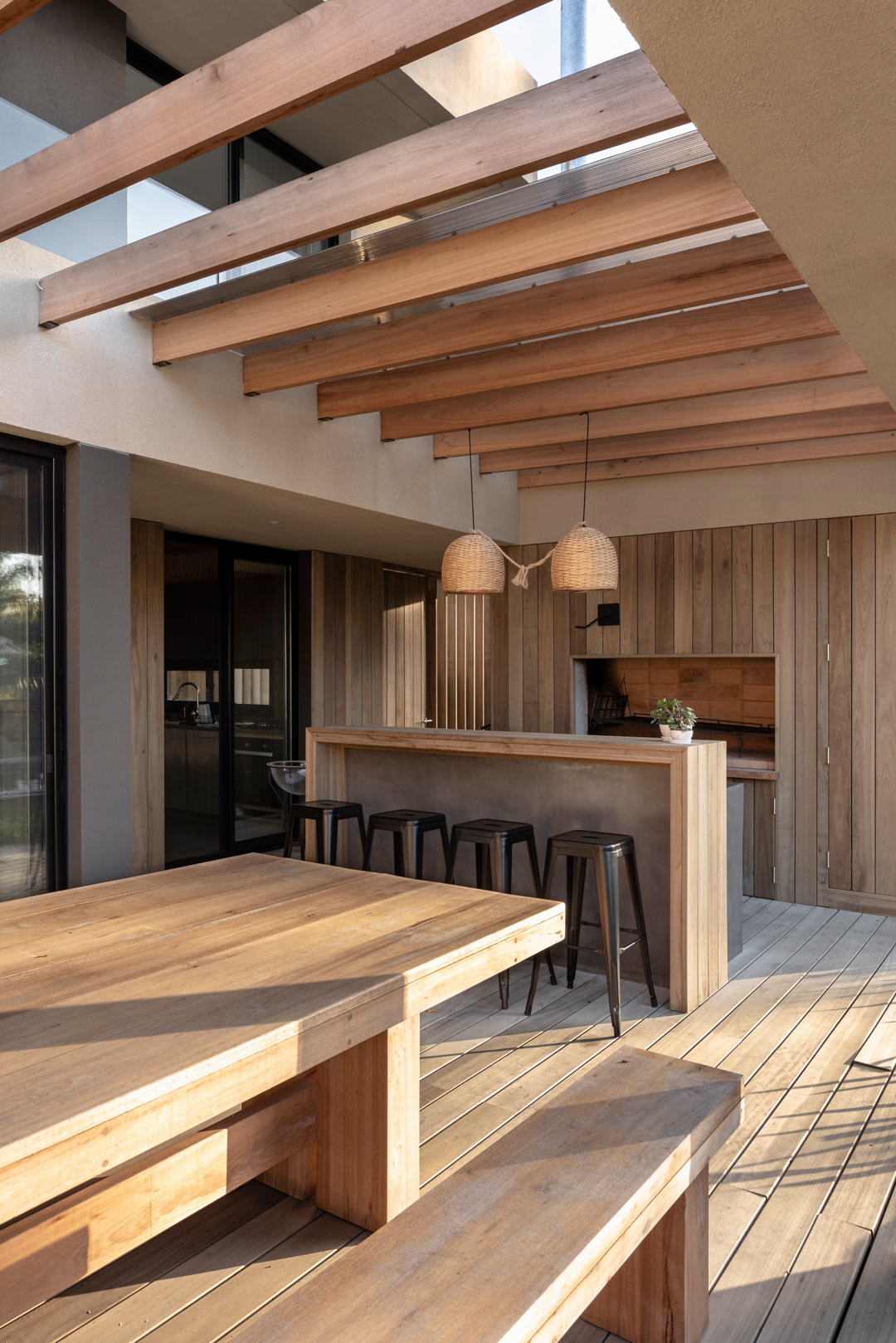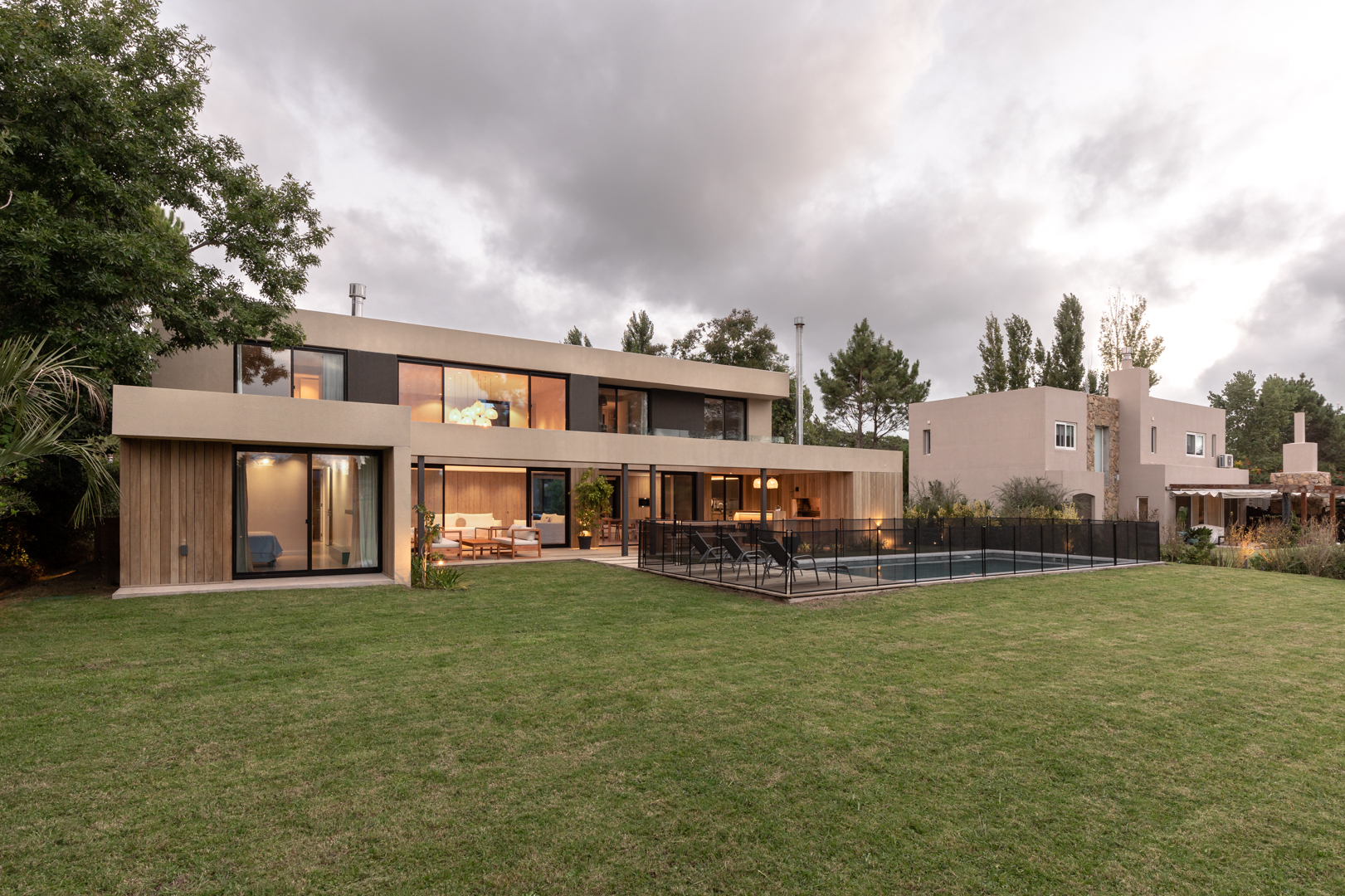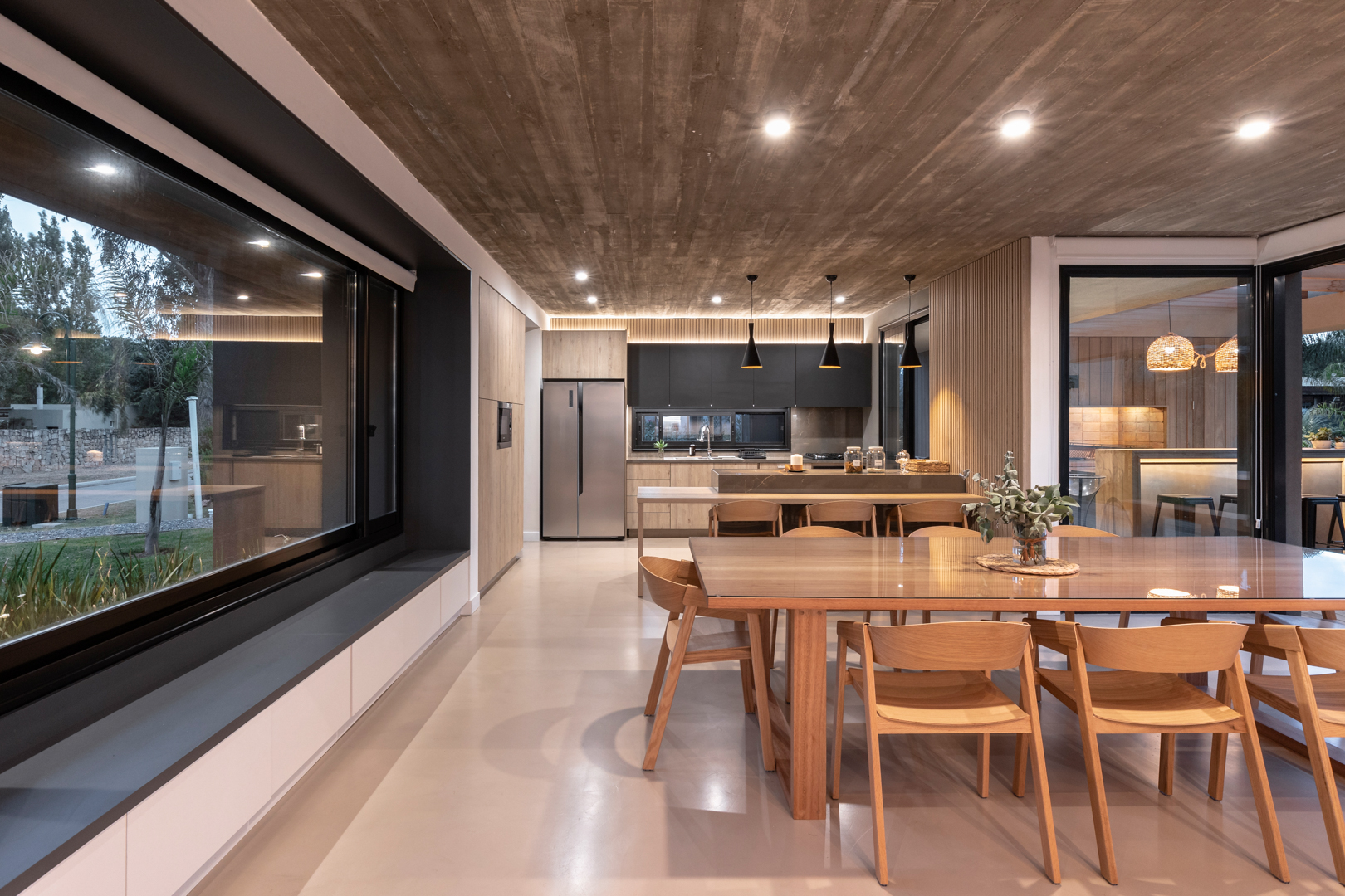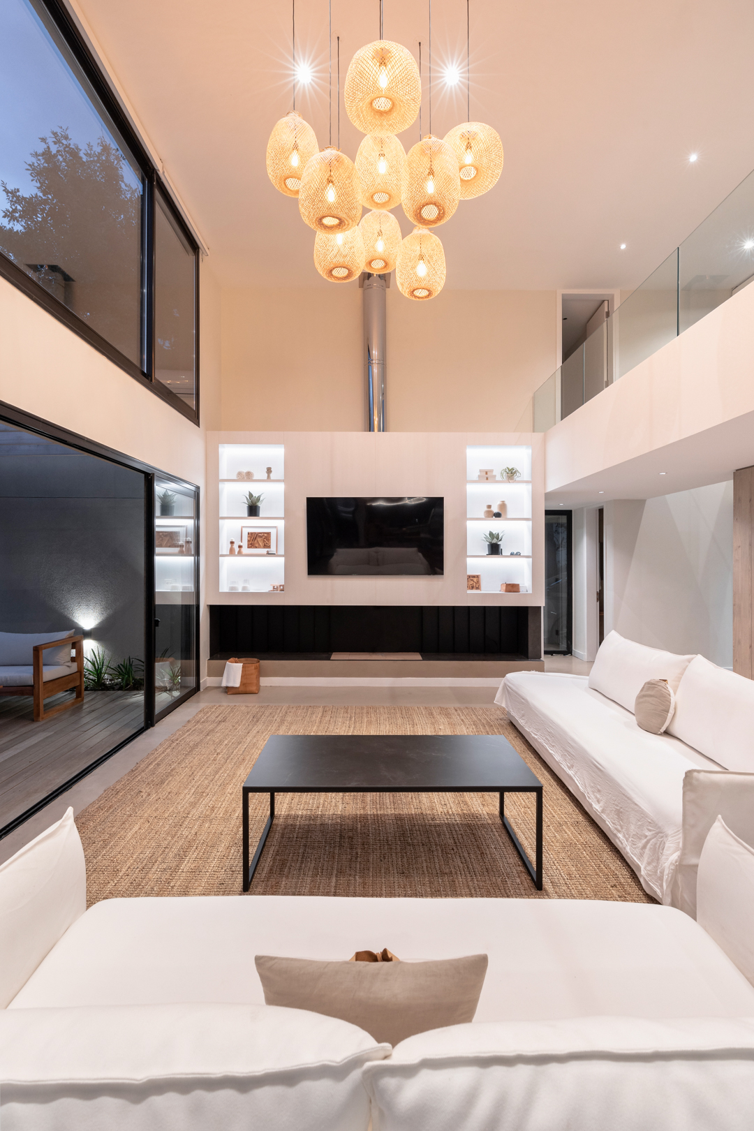 La vida de la casa transcurre alrededor de la doble altura del living que vincula espacialmente varios aspectos: los dos niveles de la vivienda, el área social con la privada y a la vez cada uno de los espacios con el exterior. El puente suspendido entre los dormitorios de la planta alta propicia así la interacción social sin interferir con la privacidad de las áreas de dormitorios. Este multiplica y enriquece las perspectivas internas.