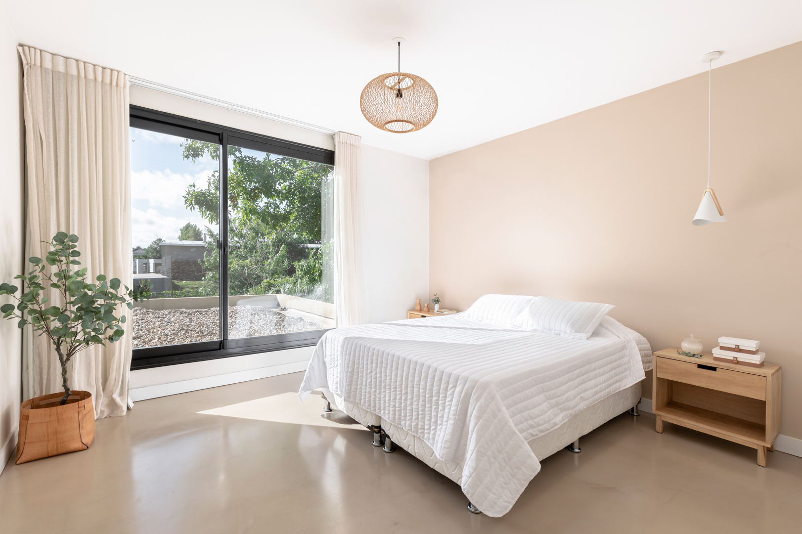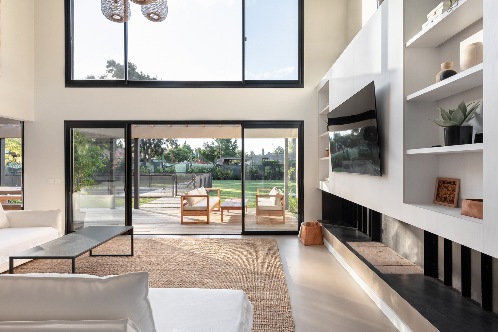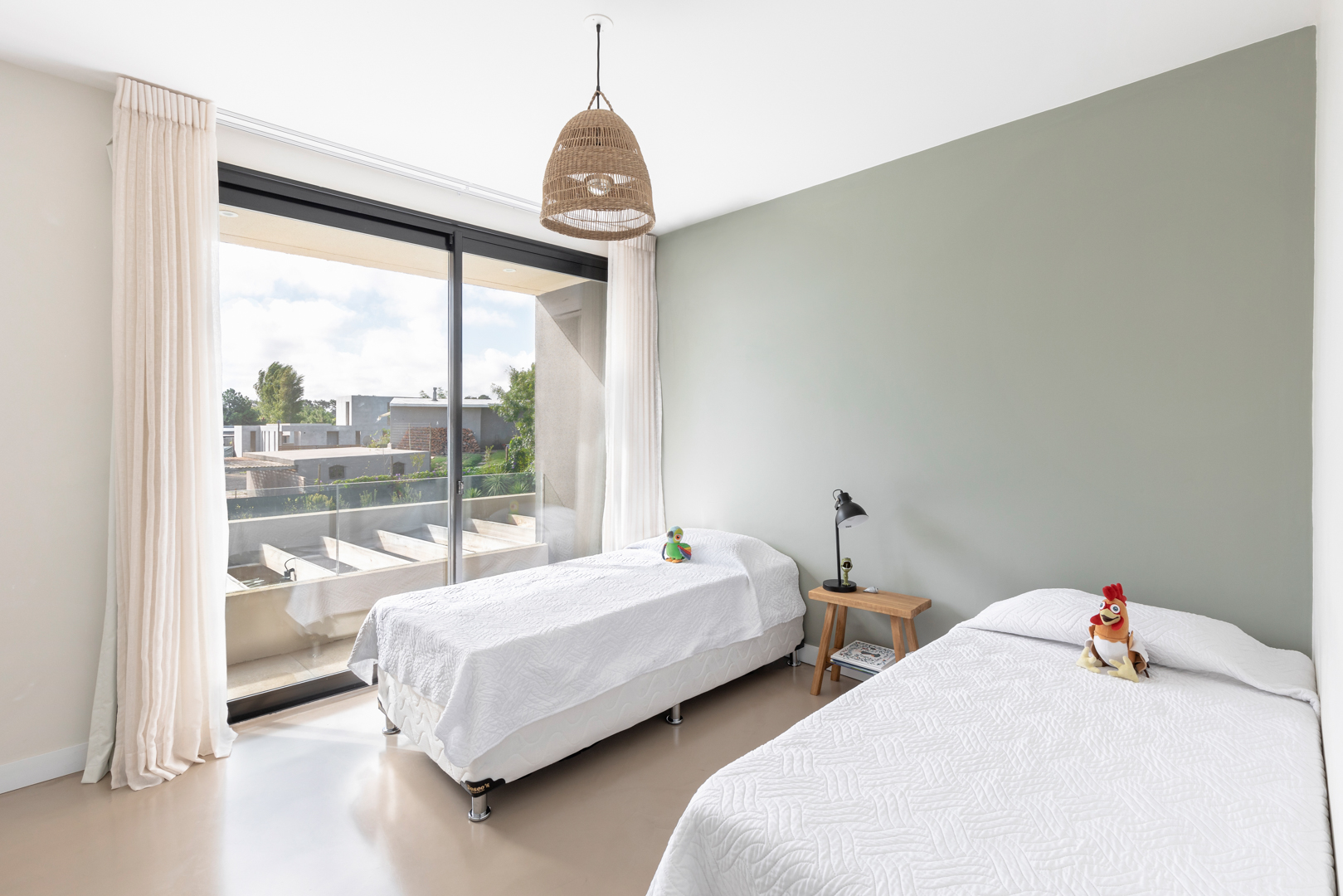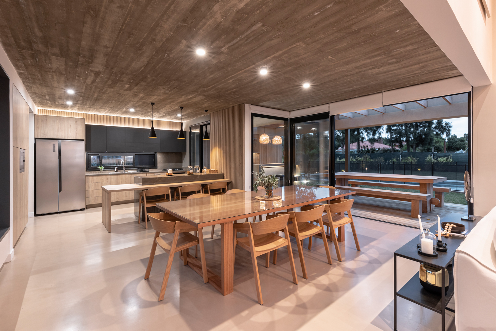 La vida de la casa transcurre alrededor de la doble altura del living que vincula espacialmente varios aspectos: los dos niveles de la vivienda, el área social con la privada y a la vez cada uno de los espacios con el exterior. El puente suspendido entre los dormitorios de la planta alta propicia así la interacción social sin interferir con la privacidad de las áreas de dormitorios. Este multiplica y enriquece las perspectivas internas.
