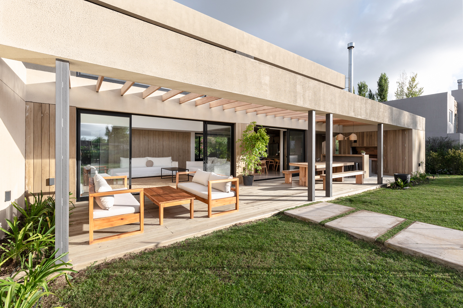 El proyecto se plantea abierto hacia el sol del norte que da por el fondo, vinculando los espacios Living comedor y cocina integrados de la planta baja con el jardín exterior a través del espacio intermedio de galería pergolada.