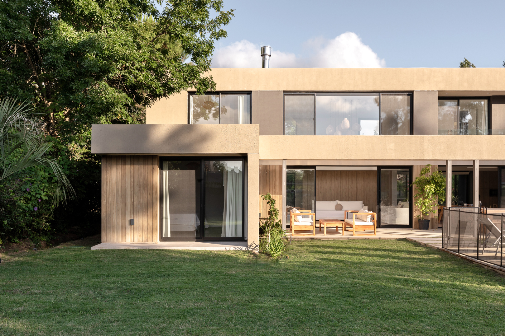 La casa se estructura en bandas horizontales independientes que refuerzan el carácter extendido y descansado de la casa sobre el predio, generando espacios en los distintos escalonamientos de fachadas. Los vanos y los revestimientos hacen el contrapunto como elementos de fuerte verticalidad.