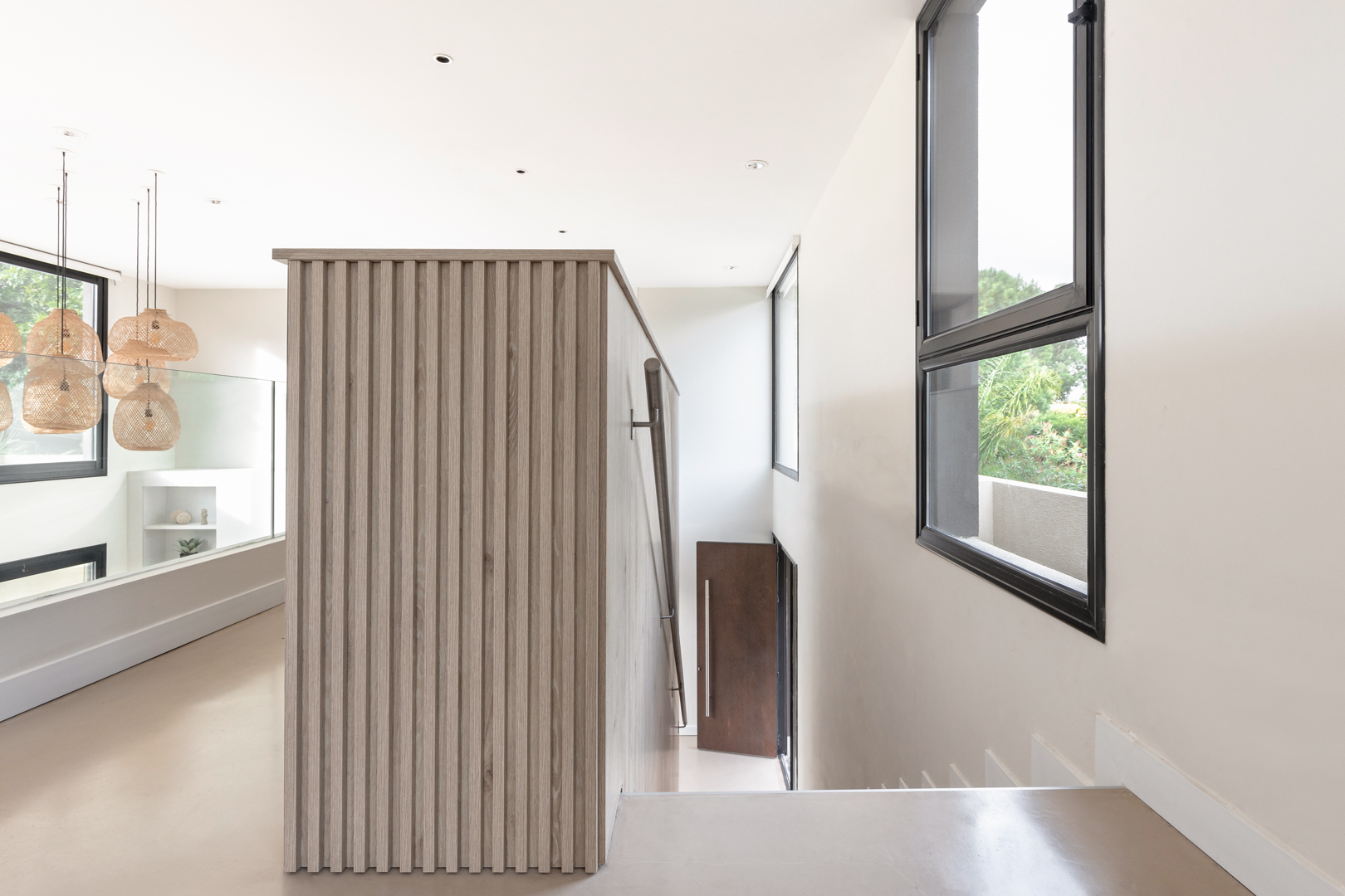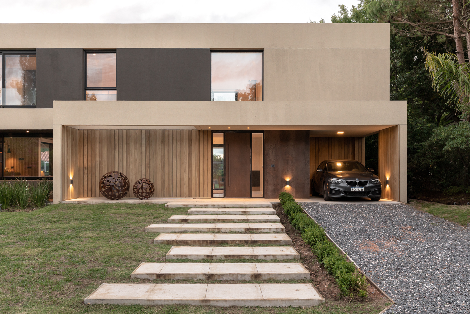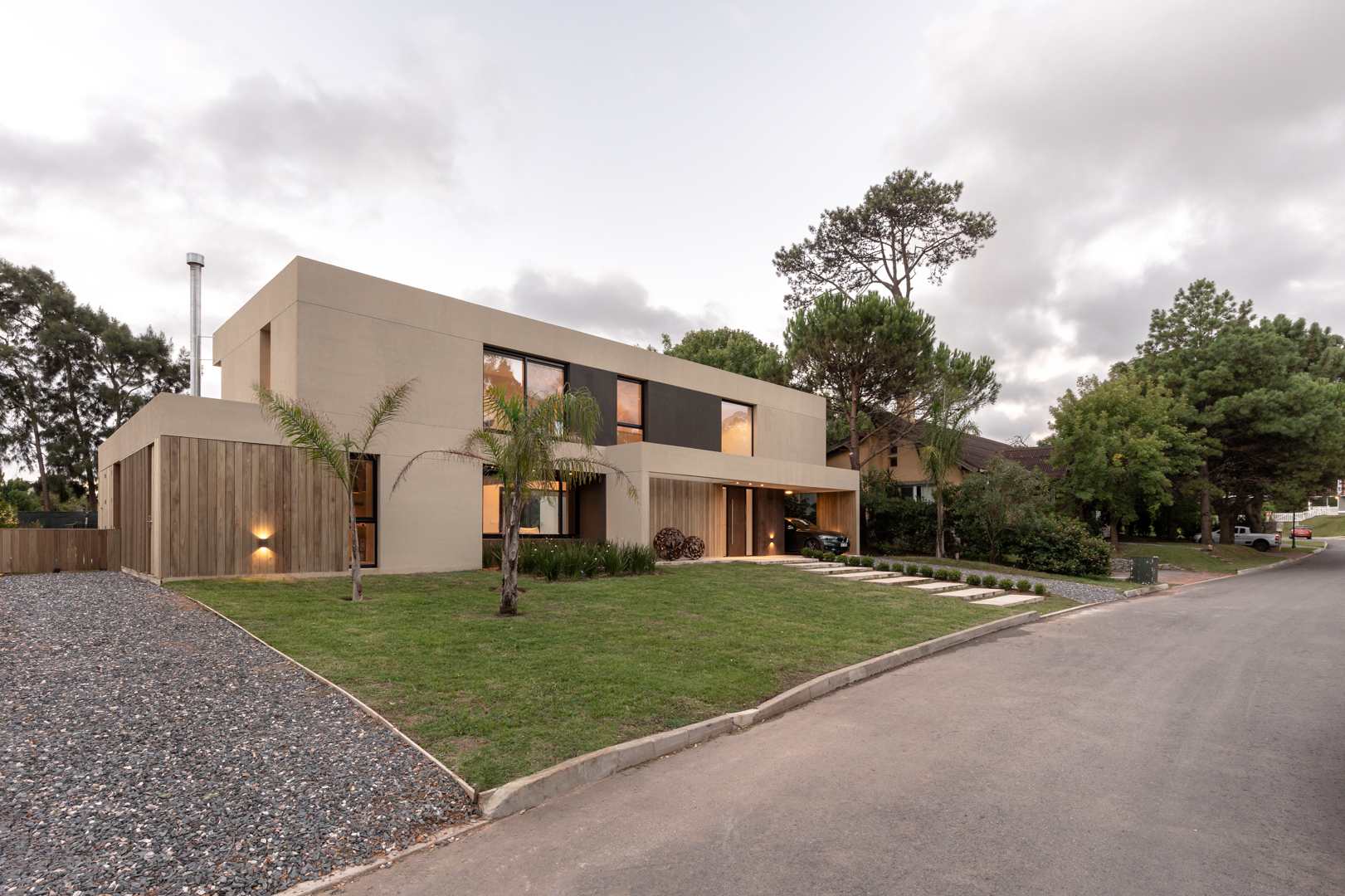 Respecto a la materialidad se optó por utilización de tonos neutros y beige combinados con paños verticales de madera para dar mayor calidez. A su vez, se buscó generar contrastes entre claros y oscuros, tanto en fachada como en el interior, para dar ciertos destaques y así lograr un mayor impacto visual.