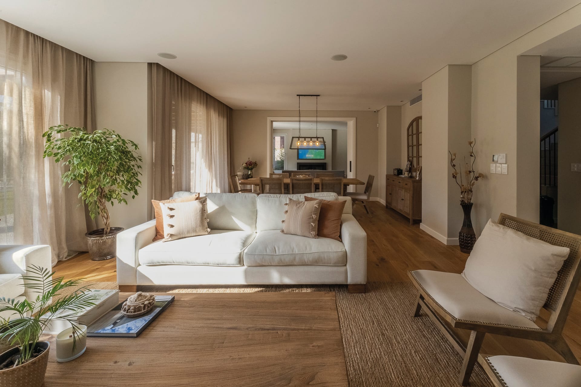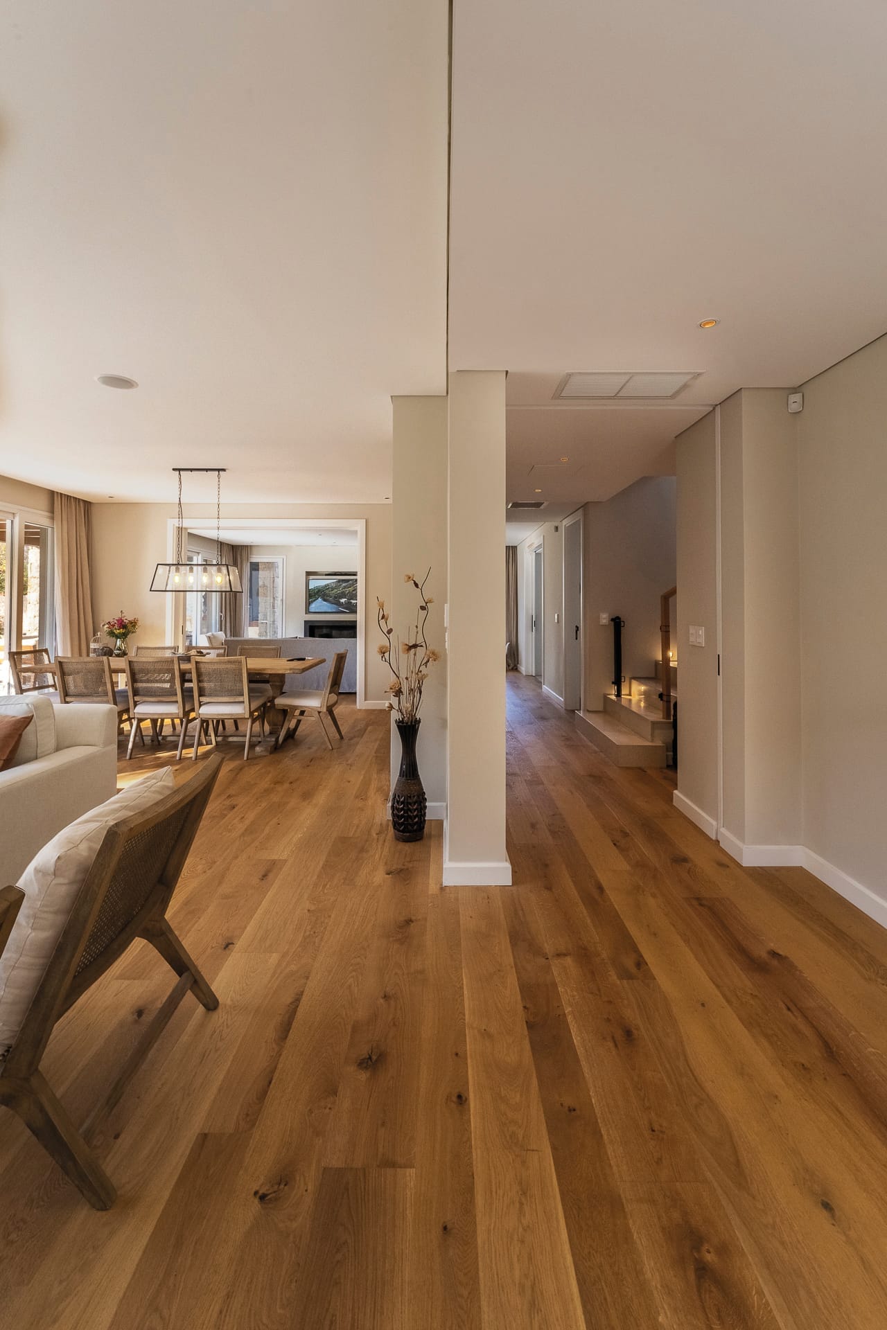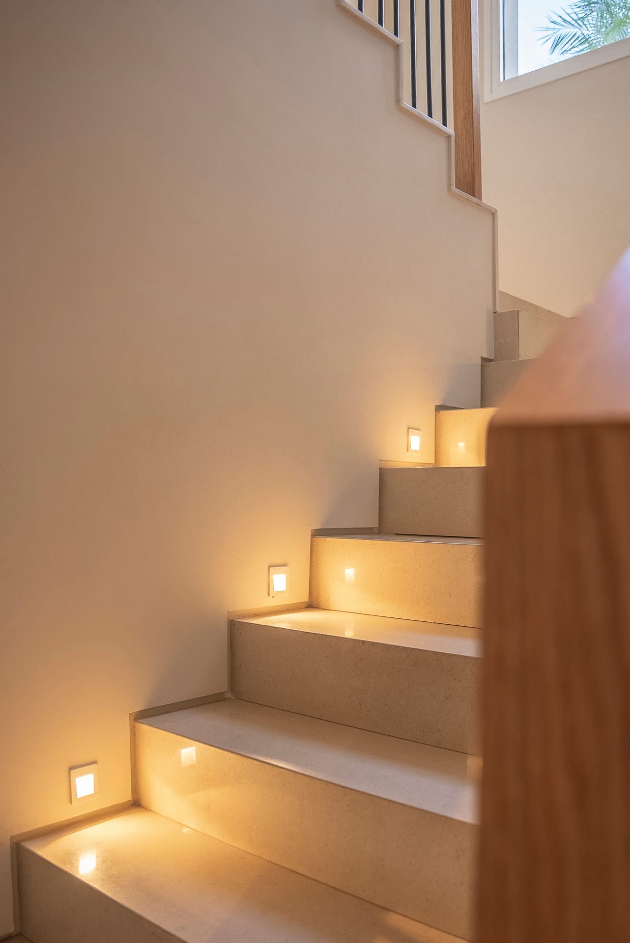 orientada francamente al norte tiene en su “in between space” el alma de la vida familiar, conformado por una galería que duplica el sacio interior en contacto directo con el jardín frontal. La omnipresencia de materiales naturales en la construcción y en el interiorismo es determinante en la atmósfera de toda la experiencia, ensamblando elementos de aleta cálida y envolvente.
