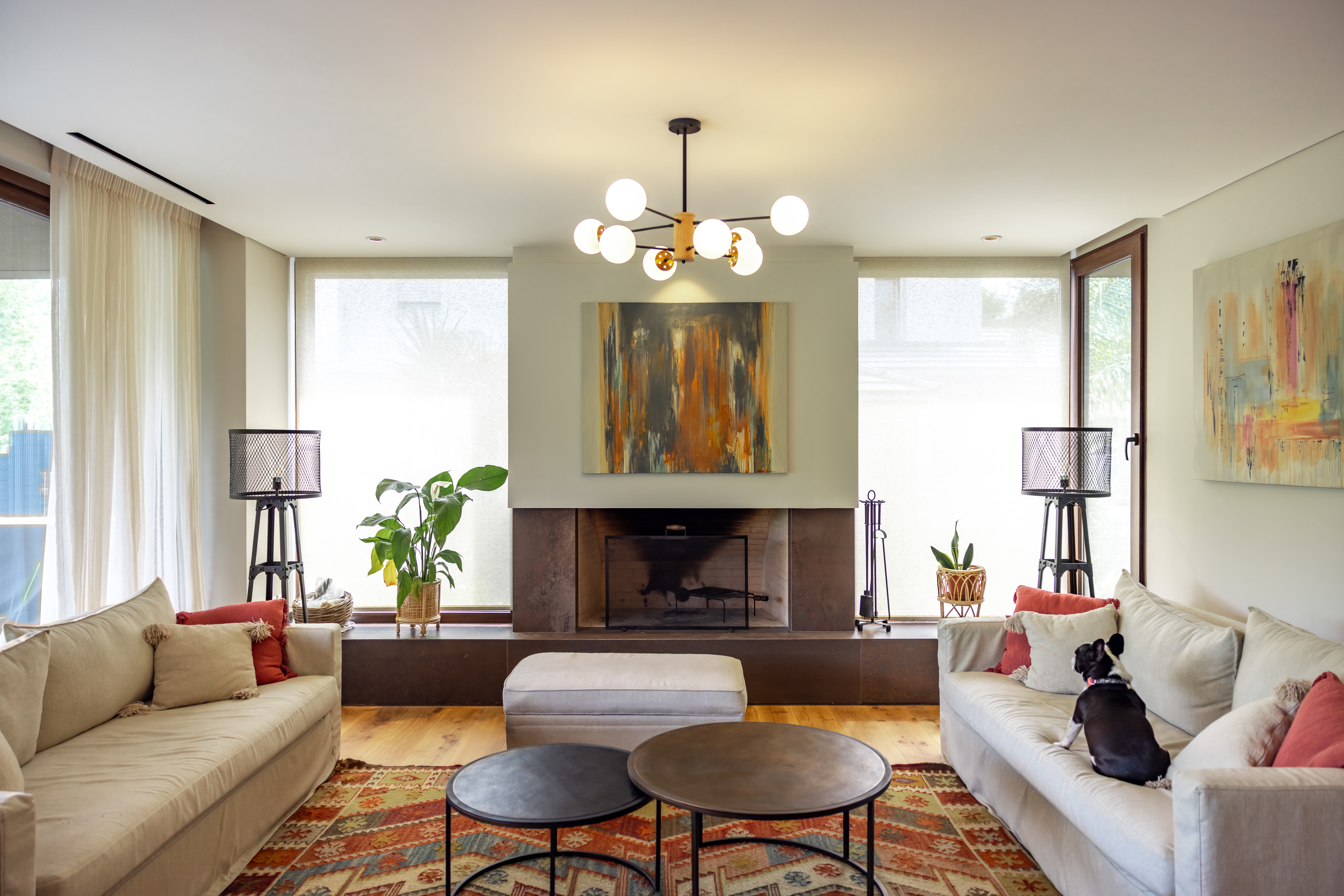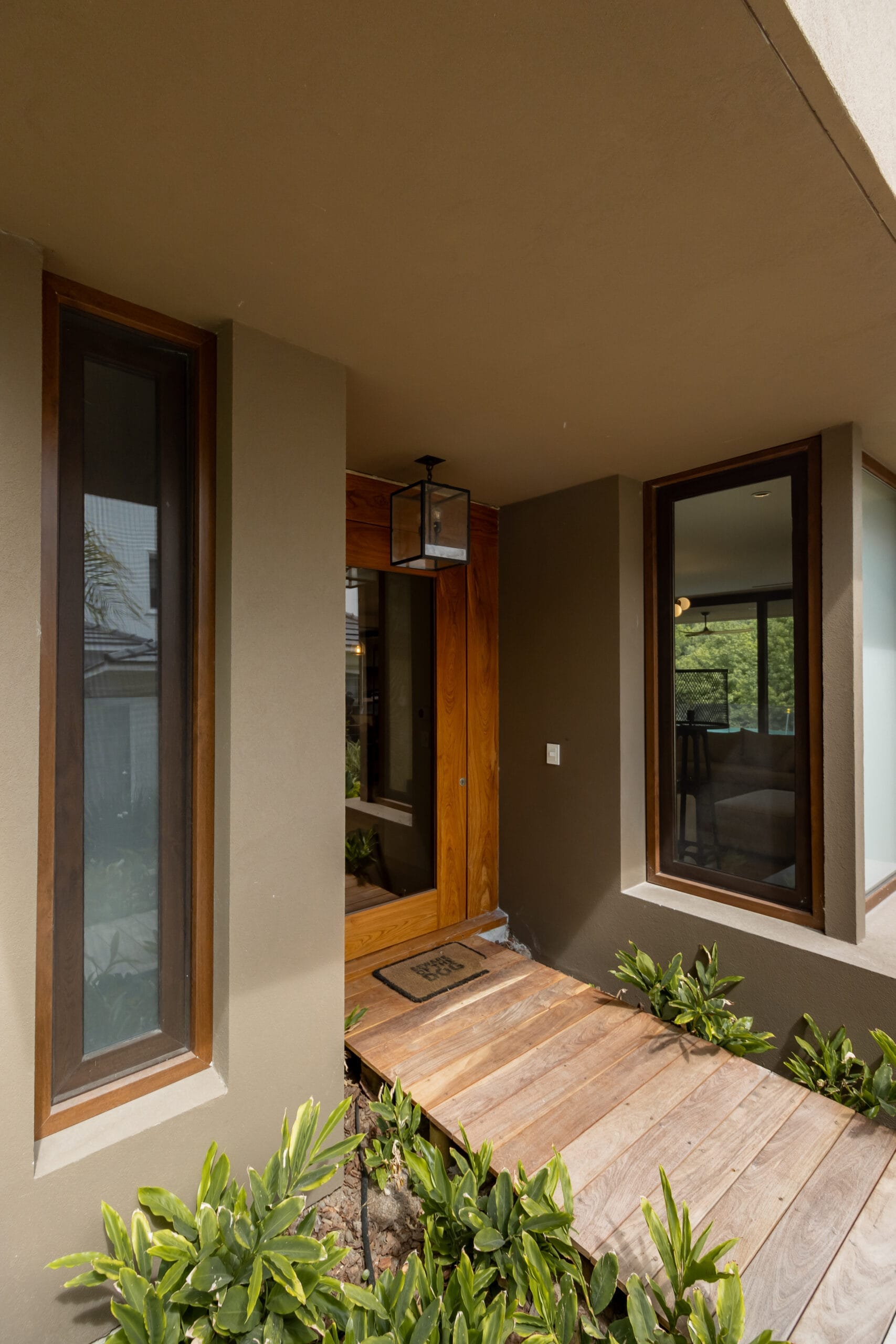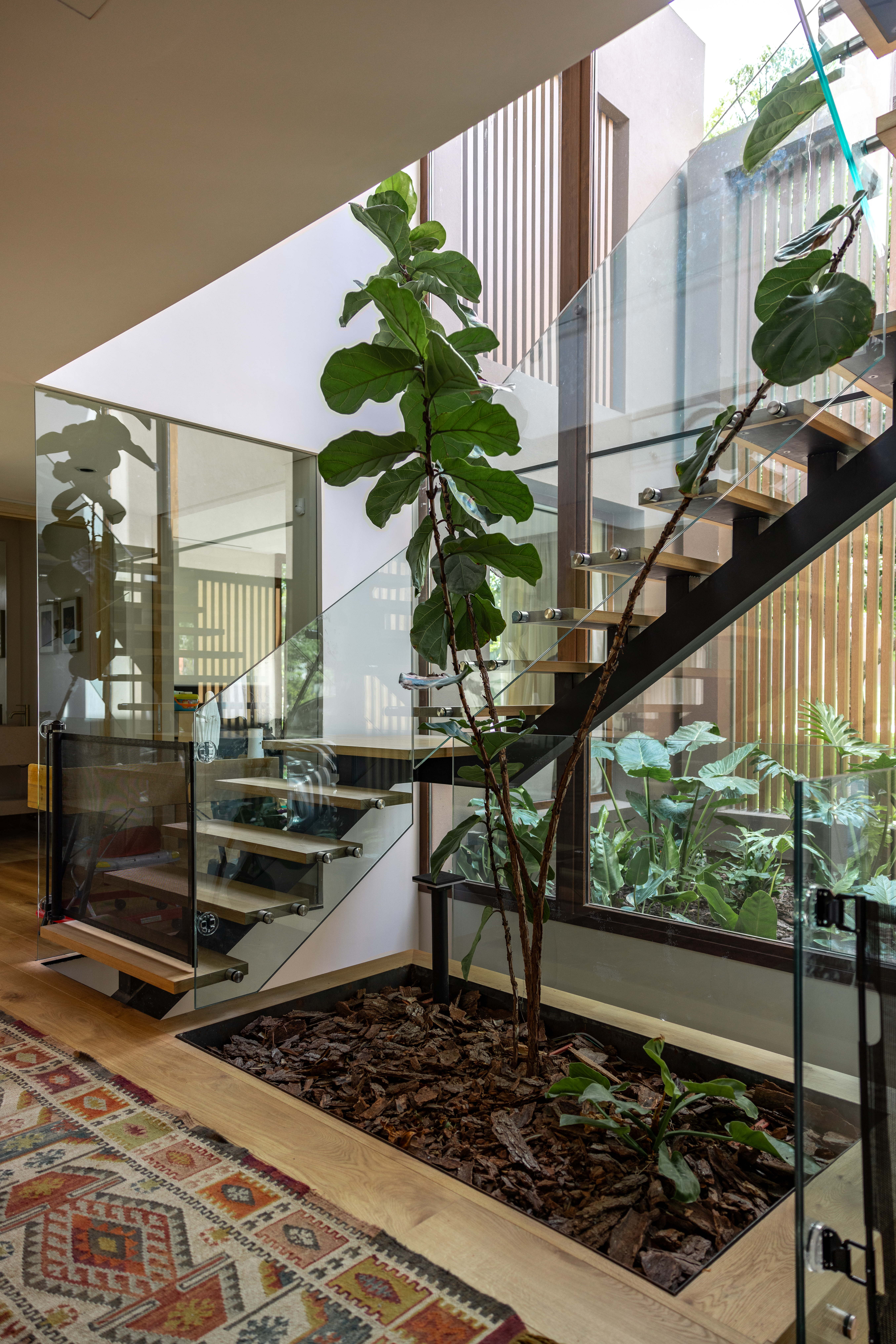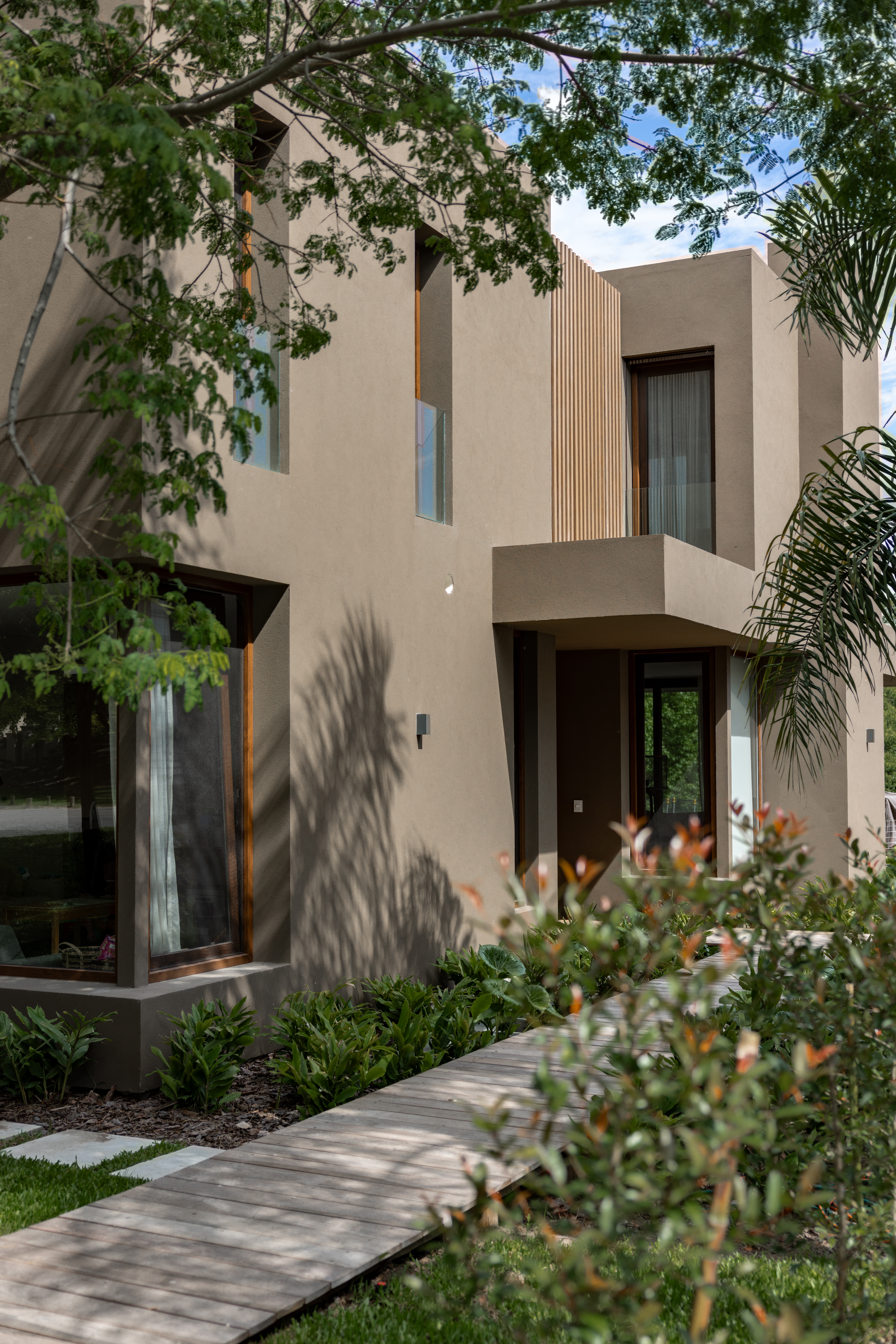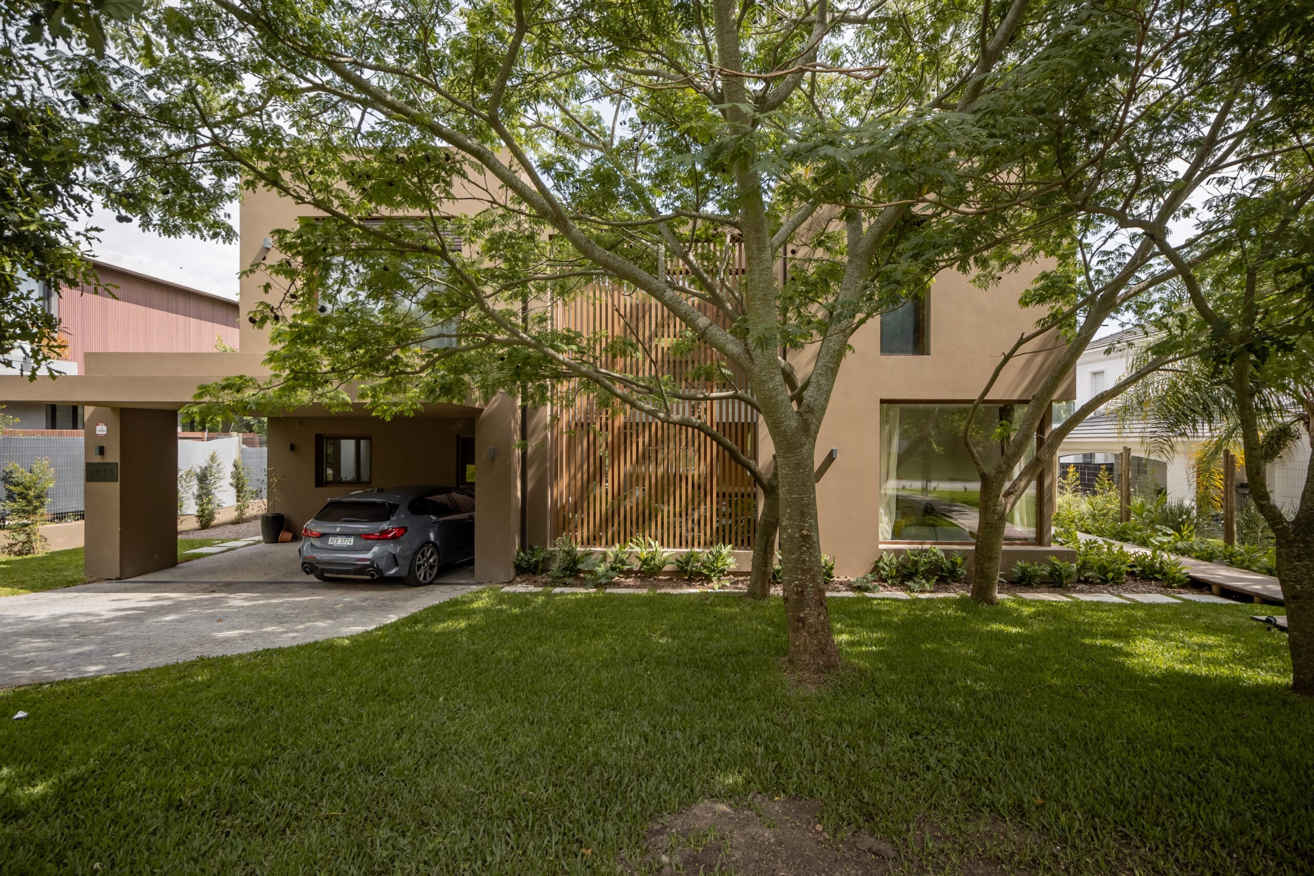 un sector de la fachada imponiendo un ingreso por inducción que a la vez opera como cochera abierta, en el centro una estructura de varillas de madera dispuestas en orden vertical genera la necesaria luz que al mismo tiempo genera la reserva de intimidad necesaria. En el otro extremo la esquina se convierte en una gran vidriera abierta hacia el jardín. En la planta alta el ritmo se invierte y el volumen queda resguardado por los árboles existentes en el predio, que fueron considerados al momento de resolver la implantación. El vínculo con la naturaleza también se genera