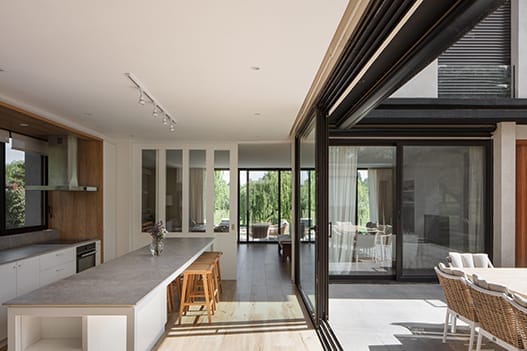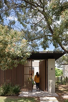 La casa fue encargada por un cliente del Estudio que decidió, junto a su familia, mudarse a Lomas de La Tahona. Entre las demandas espaciales y prácticas que surgieron para el proyecto una pedía un aporte vital en el diseño, la necesidad de privacidad con relación a un entorno que se presenta abierto y des contraído. El diseño del Estudio generó una estructura en forma de “L” que se cierra hacia el exterior y genera patios interiores que se abren hacia el verde del lugar, generando paisajes interiores singularmente ricos. El primer patio aparece al franquear el ingreso y el segundo ocupa el centro de la estructura, la idea de abrir los espacios interiores hacia el exterior es posible de conciliar con la necesidad de un concepto introvertido. La segunda planta destinada al área íntima recorre uno de los dos brazos en los que se abre la estructura, generando ritmo y señalando con énfasis la toma de partido del proyecto.