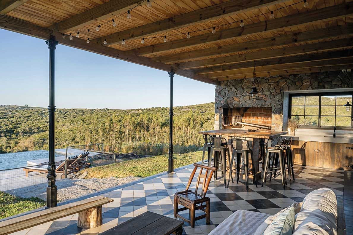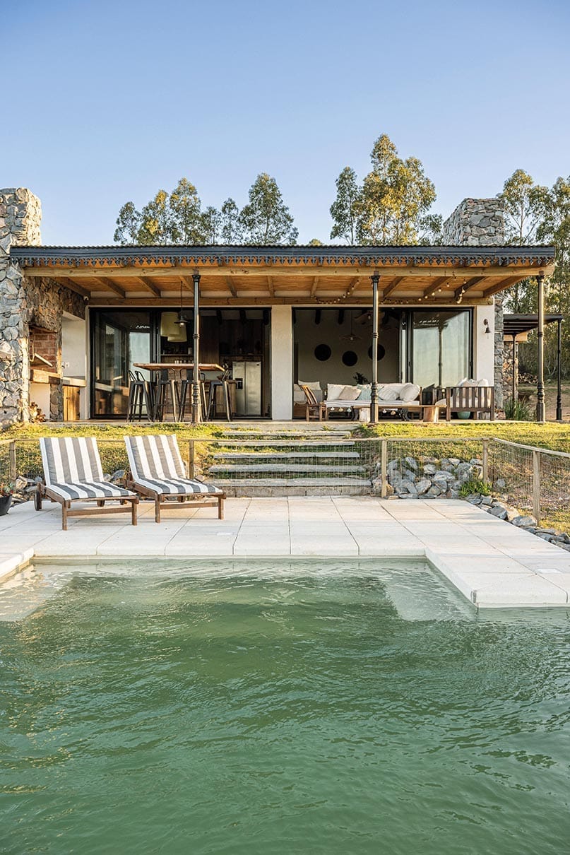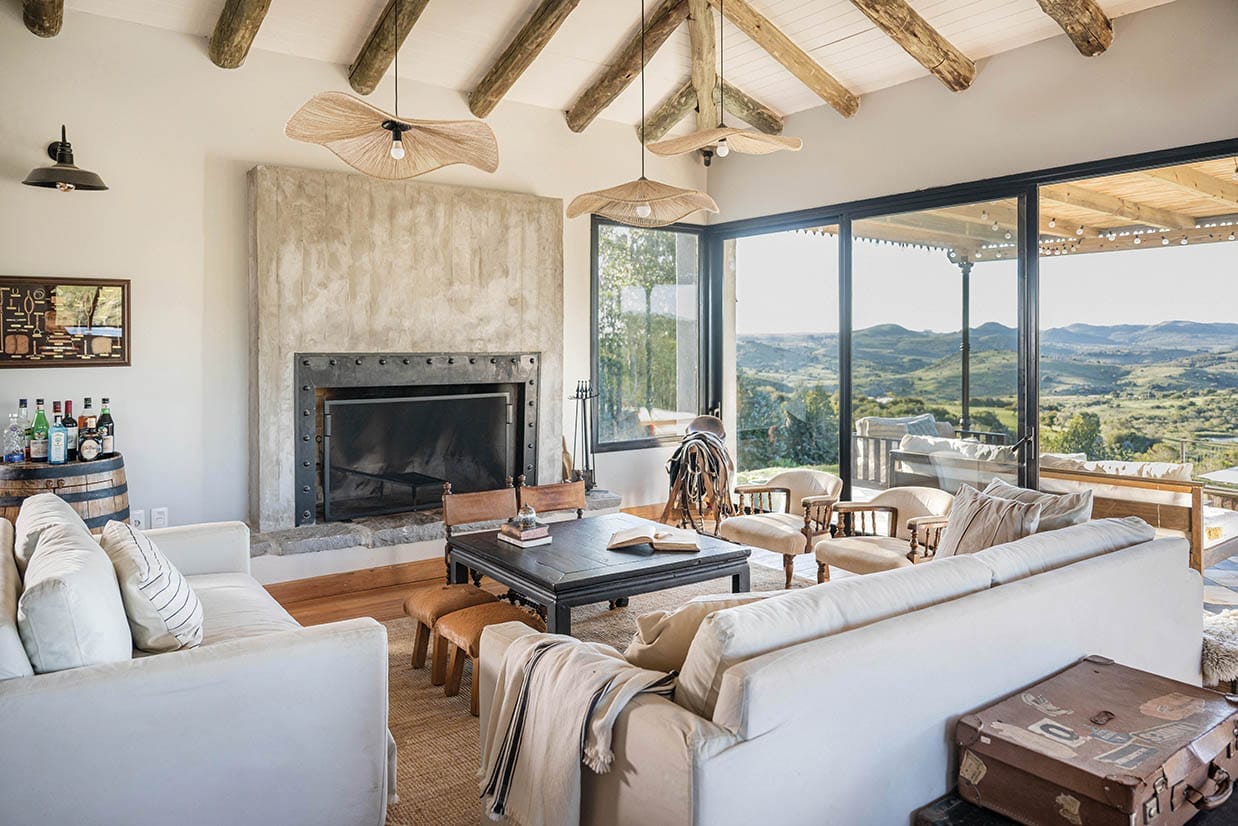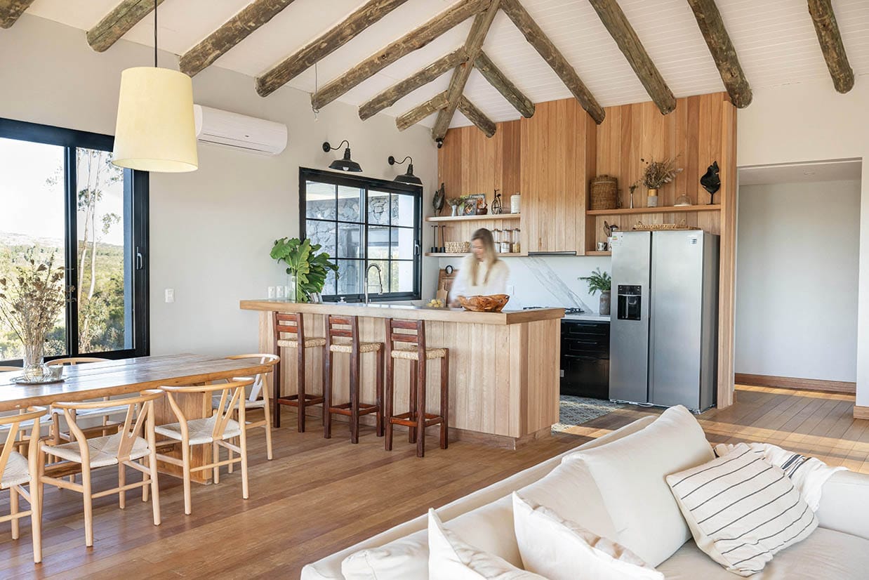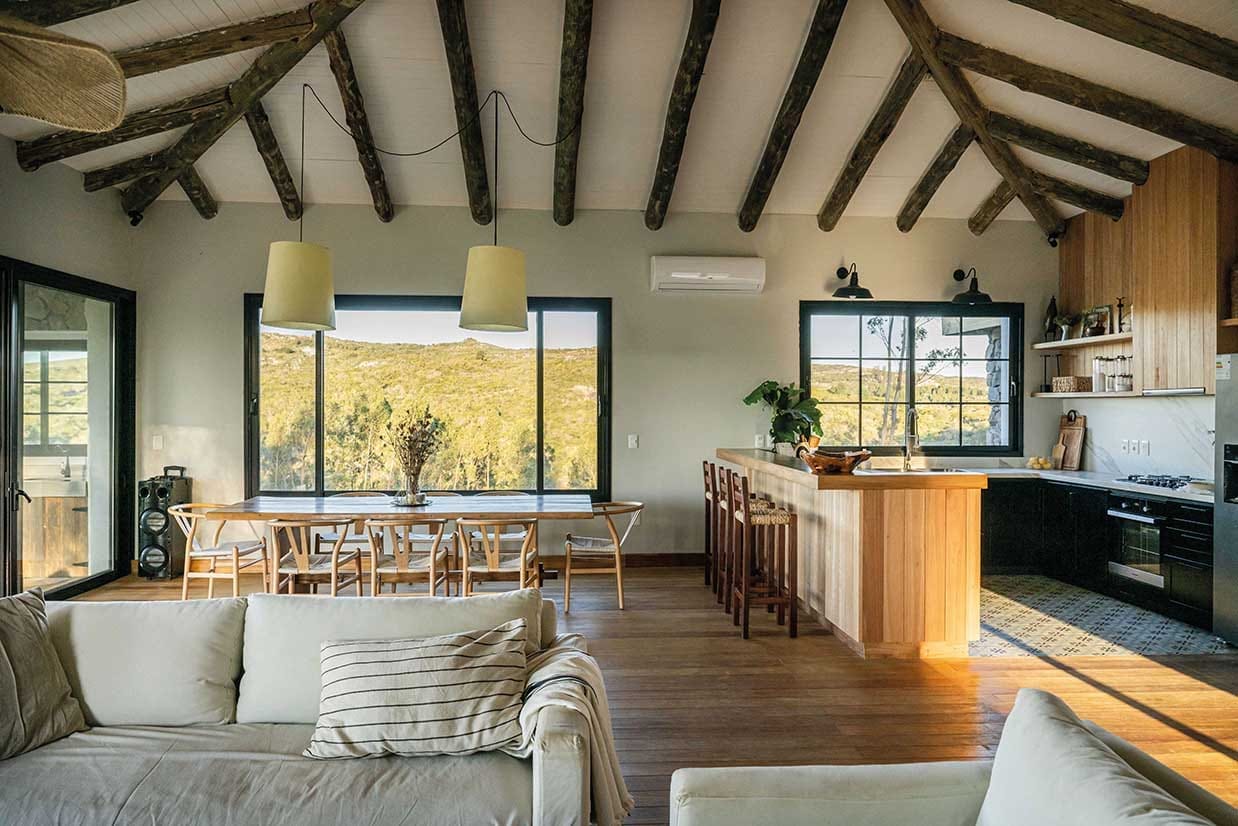 El espacio central de la casa funciona como el núcleo vital del hogar, donde se encuentran los principales espacios de convivencia: el living, el comedor y la cocina. Este ambiente se caracteriza por su comodidad y orden, facilitando la convivencia gracias a la integración del paisaje, que se convierte en el protagonista a través de amplias aberturas que conectan constantemente el interior con los espacios exteriores. Un salón de estar exterior, protegido por la galería y la estructura de hierro, complementa el diseño, permitiendo disfrutar del entorno natural y reforzando la esencia del diseño y los gestos arquitectónicos que definen esta casa única en Lavalleja.